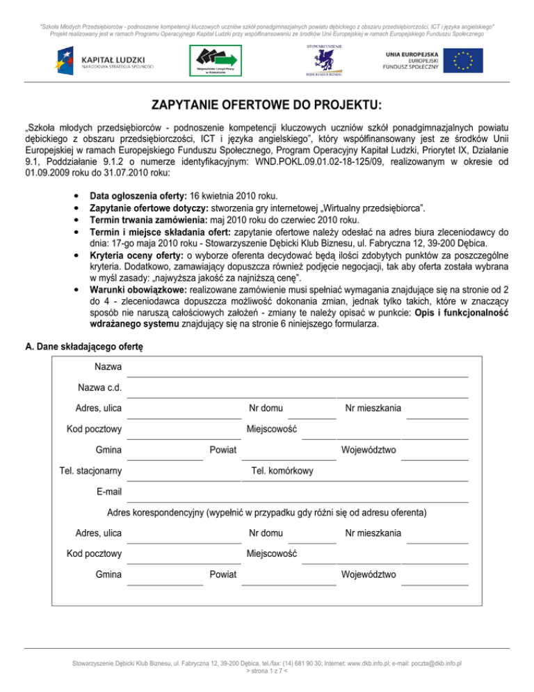zapytanie ofertowe do projektu - Stowarzyszenie Dębicki Klub Biznesu