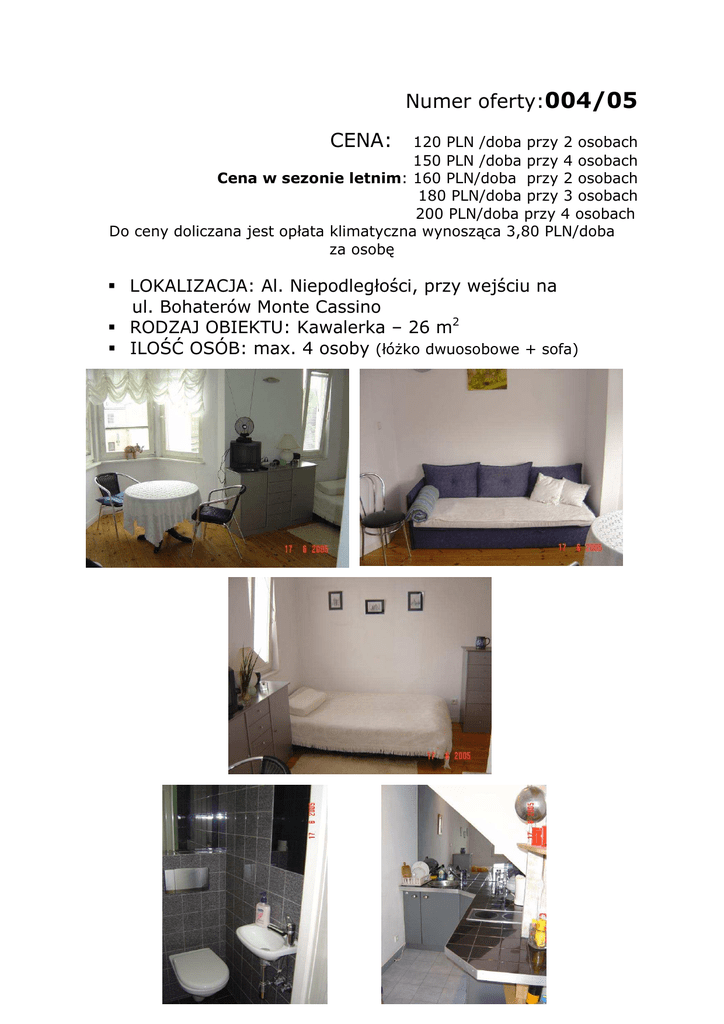 Numer oferty:004/05 CENA: 120 PLN /doba przy 2 osobach 150 PLN /doba przy 4 osobach Cena w sezonie letnim: 160 PLN/doba przy 2 osobach 180 PLN/doba przy 3 osobach 200 PLN/doba przy 4 osobach Do ceny doliczana jest opłata klimatyczna wynosząca 3,80 PLN/doba za osobę LOKALIZACJA: Al. Niepodległości, przy wejściu na ul. Bohaterów Monte Cassino RODZAJ OBIEKTU: Kawalerka – 26 m2 ILOŚĆ OSÓB: max. 4 osoby (łóŜko dwuosobowe + sofa) Numer oferty: 004/05 LOKALIZACJA: al. Niepodległości Lp. PRZEDMIOT OCENY UWAGI 1. Nowe/stare budownictwo 2. Nowe/stare meble 3. Parking na posesji/GaraŜ Stara kamienica, mieszkanie po remoncie, otwarty aneks kuchenny Mebelki proste, nowoczesne, łóŜko dwuosobowe i sofa rozsuwana, stolik + 2 krzesła Miejsce parkingowe w podwórzu 4. Balkon / taras / ogródek Nie 5. Telewizor (Kablówka, TV Sat), Radio TV Kablowa, Radio 6. Dostęp do telefonu przy dłuŜszym wynajmie moŜliwość podłączenia telefonu 7. Dostęp do internetu Nie Kuchnia Otwarty aneks kuchenny, kuchnia elektryczna z piekarnikiem, lodówka, mikrofala, pralka, czajnik, pełne wyposaŜenie w garnki, naczynia i sztućce 8. 9. Łazienka Łazienka – brodzik z prysznicem i WC w jednym pomieszczeniu 10. Pościel, ręczniki Dostępne na miejscu 11. Dostęp do szafy / półek DuŜa szafa w przedpokoju i małe szafki w pokoiku 12. Pobyt ze zwierzątkiem Tak, ale duŜe zwierzątka po negocjacji 14. Niepełnosprawni (winda, podjazd) III piętro, strome ale szerokie schody 16. Lokalizacja • Centrum – Dworzec PKP • PlaŜa, park • Dzielnica • Komunikacja miejska 17. Osoby palące Centrum, 7 minut od dworca PKP, 700 m w linii prostej ulicą Boh. Monte Cassino do molo i plaŜy, pod domem przystanek autobusowy (S, 21, 181, 187, 185, 09) oraz PKS i Polski Express, niedaleko przystanek autobusowy linii 143, 122, 117 /okna mieszkania wychodzą na podwórze. W pobliŜu restauracje. Tak 19. Faktura VAT lub Rachunek Rachunek