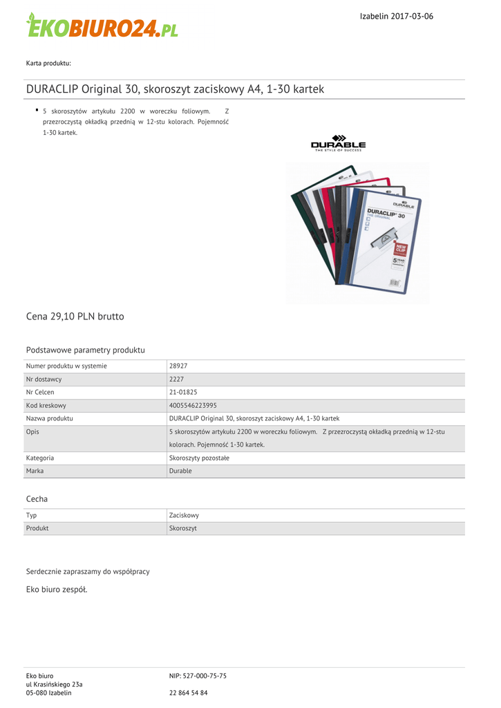 Izabelin 2017-03-06 Karta produktu: DURACLIP Original 30, skoroszyt zaciskowy A4, 1-30 kartek 5 skoroszytów artykułu 2200 w woreczku foliowym. Z przezroczystą okładką przednią w 12-stu kolorach. Pojemność 1-30 kartek. Cena 29,10 PLN brutto Podstawowe parametry produktu Numer produktu w systemie 28927 Nr dostawcy 2227 Nr Celcen 21-01825 Kod kreskowy 4005546223995 Nazwa produktu DURACLIP Original 30, skoroszyt zaciskowy A4, 1-30 kartek Opis 5 skoroszytów artykułu 2200 w woreczku foliowym. Z przezroczystą okładką przednią w 12-stu kolorach. Pojemność 1-30 kartek. Kategoria Skoroszyty pozostałe Marka Durable Cecha Typ Zaciskowy Produkt Skoroszyt Serdecznie zapraszamy do współpracy Eko biuro zespół. Eko biuro ul Krasińskiego 23a 05-080 Izabelin NIP: 527-000-75-75 22 864 54 84