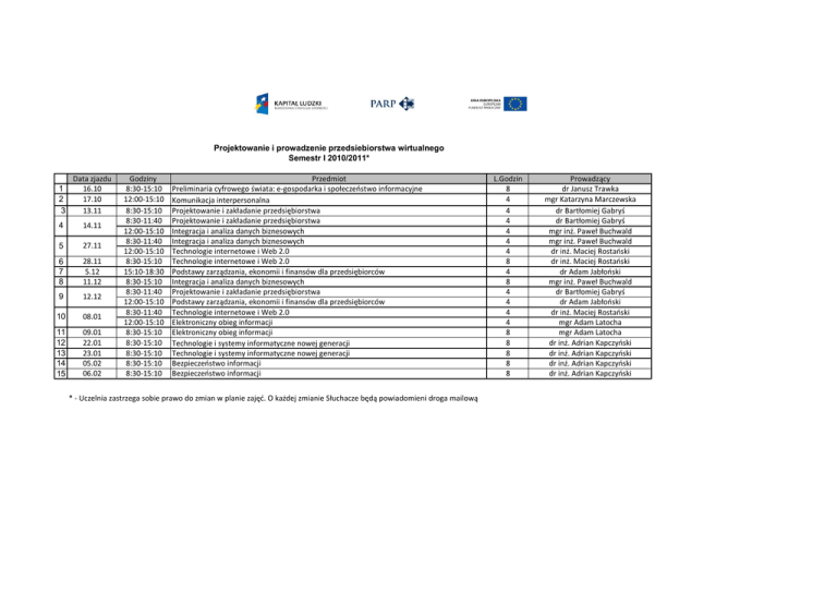 Projektowanie i prowadzenie przedsiebiorstwa wirtualnego Semestr I 2010/2011* 1 2 3 Data zjazdu 16.10 17.10 13.11 4 14.11 5 27.11 6 7 8 28.11 5.12 11.12 9 12.12 10 08.01 11 12 13 14 15 09.01 22.01 23.01 05.02 06.02 Godziny 8:30-15:10 12:00-15:10 8:30-15:10 8:30-11:40 12:00-15:10 8:30-11:40 12:00-15:10 8:30-15:10 15:10-18:30 8:30-15:10 8:30-11:40 12:00-15:10 8:30-11:40 12:00-15:10 8:30-15:10 8:30-15:10 8:30-15:10 8:30-15:10 8:30-15:10 Przedmiot Preliminaria cyfrowego świata: e-gospodarka i społeczeostwo informacyjne Komunikacja interpersonalna Projektowanie i zakładanie przedsiębiorstwa Projektowanie i zakładanie przedsiębiorstwa Integracja i analiza danych biznesowych Integracja i analiza danych biznesowych Technologie internetowe i Web 2.0 Technologie internetowe i Web 2.0 Podstawy zarządzania, ekonomii i finansów dla przedsiębiorców Integracja i analiza danych biznesowych Projektowanie i zakładanie przedsiębiorstwa Podstawy zarządzania, ekonomii i finansów dla przedsiębiorców Technologie internetowe i Web 2.0 Elektroniczny obieg informacji Elektroniczny obieg informacji Technologie i systemy informatyczne nowej generacji Technologie i systemy informatyczne nowej generacji Bezpieczeostwo informacji Bezpieczeostwo informacji * - Uczelnia zastrzega sobie prawo do zmian w planie zajęd. O każdej zmianie Słuchacze będą powiadomieni droga mailową L.Godzin 8 4 4 4 4 4 4 8 4 8 4 4 4 4 8 8 8 8 8 Prowadzący dr Janusz Trawka mgr Katarzyna Marczewska dr Bartłomiej Gabryś dr Bartłomiej Gabryś mgr inż. Paweł Buchwald mgr inż. Paweł Buchwald dr inż. Maciej Rostaoski dr inż. Maciej Rostaoski dr Adam Jabłooski mgr inż. Paweł Buchwald dr Bartłomiej Gabryś dr Adam Jabłooski dr inż. Maciej Rostaoski mgr Adam Latocha mgr Adam Latocha dr inż. Adrian Kapczyoski dr inż. Adrian Kapczyoski dr inż. Adrian Kapczyoski dr inż. Adrian Kapczyoski