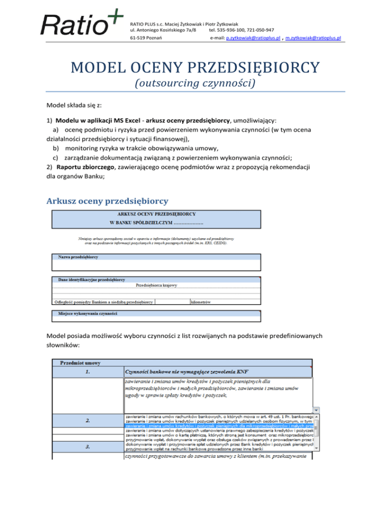 RATIO PLUS s.c. Maciej Żytkowiak i Piotr Żytkowiak ul. Antoniego Kosińskiego 7a/8 tel. 535-936-100, 721-050-947 61-519 Poznań e-mail: [email protected] , [email protected] MODEL OCENY PRZEDSIĘBIORCY (outsourcing czynności) Model składa się z: 1) Modelu w aplikacji MS Excel - arkusz oceny przedsiębiorcy, umożliwiający: a) ocenę podmiotu i ryzyka przed powierzeniem wykonywania czynności (w tym ocena działalności przedsiębiorcy i sytuacji finansowej), b) monitoring ryzyka w trakcie obowiązywania umowy, c) zarządzanie dokumentacją związaną z powierzeniem wykonywania czynności; 2) Raportu zbiorczego, zawierającego ocenę podmiotów wraz z propozycją rekomendacji dla organów Banku; Arkusz oceny przedsiębiorcy Model posiada możliwość wyboru czynności z list rozwijanych na podstawie predefiniowanych słowników: RATIO PLUS s.c. Maciej Żytkowiak i Piotr Żytkowiak ul. Antoniego Kosińskiego 7a/8 tel. 535-936-100, 721-050-947 61-519 Poznań e-mail: [email protected] , [email protected] umożliwia rejestrowanie zawieranych umów oraz tworzenie wstępnej analizy i monitoringu przedsiębiorcy. Model umożliwia rejestrowanie załączników do analizy (sprawozdań przedsiębiorstwa, zeskanowanych umów itp.) oraz tworzenie analiz ekonomicznych na podstawie trzech metod: Systemu wczesnego ostrzegania E.I. Altmana, Systemu wczesnego ostrzegania G.L.V Springate’a i Systemu wczesnego ostrzegania A. Hołdy. RATIO PLUS s.c. Maciej Żytkowiak i Piotr Żytkowiak ul. Antoniego Kosińskiego 7a/8 tel. 535-936-100, 721-050-947 61-519 Poznań e-mail: [email protected] , [email protected] Raport zbiorczy Plik ten służy do tworzenia zbiorczego zestawienia wszystkich podmiotów, którym Bank powierza wykonywanie czynności. Pozwala na zebranie w jednej analizie informacji o ocenach ryzyk, umów oraz ogólnych ocenach wszystkich przedsiębiorców.