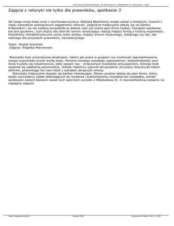 VIII Liceum Ogólnokształcące i 58 Gimnazjum im. Władysława IV w Warszawie - Start Zajęcia z retoryki nie tylko dla prawników, spotkanie 3 28 lutego moja klasa wraz z wychowawczynią p. Elżbietą Błachowicz wzięła udział w kolejnym, trzecim z rzędu warsztacie poświęconym zagadnieniu retoryki. Zajęcia te tradycyjnie odbyły się na Zamku Królewskim i po raz kolejny prowadziła je dobrze nam już znana pani Anna Czekaj. Tematem spotkania był styl językowy, czyli ważny dla retoryki termin oznaczający relację między formą a treścią wypowiedzi. Poznaliśmy charakterystyczne cechy wielu stylów, między innymi naukowego, biblijnego czy też, tak ważnego dla przyszłych prawników, kancelaryjnego. Tekst: Wojtek Sowiński Zdjęcia: Angelika Marchewka Warsztaty były urozmaicone atrakcjami, takimi jak praca w grupach czy możliwość zaprezentowania swojej wypowiedzi przed resztą klasy. Pomimo swojego wesołego usposobienia i bezpośredniości pani Anna trudziła się niesamowicie, żeby zarazić nas - zmęczonych licealistów entuzjazmem, którego brak objawiał się osłabioną aktywnością. Jednak niektórzy ujawnili skrupulatnie ukrywany dotychczas talent aktorski, prezentując ten sam tekst z udziałem skrajnych emocji. Warsztaty tradycyjnie okazały się bardzo interesujące. Słowa uznania należą się pani Annie, która, dzięki wymyślaniu zadań skłaniających do myślenia i koleżeńskiemu charakterowi wykładów, potrafi zaciekawić swoimi słowami nawet tych opornych uczniów z Władysława IV. Z niecierpliwością czekamy na następne zajęcia! http://wladyslaw.edu.pl Kreator PDF Utworzono 6 March, 2017, 19:56