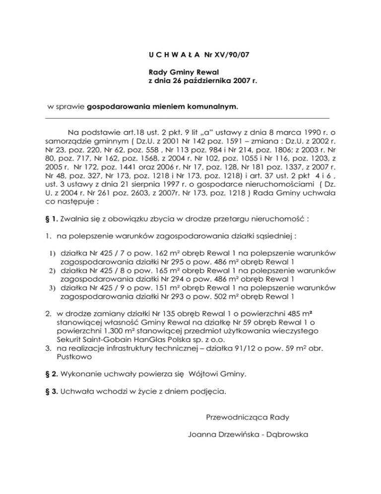 U C H W A Ł A Nr XV/90/07 Rady Gminy Rewal z dnia 26 października 2007 r. w sprawie gospodarowania mieniem komunalnym. __________________________________________________________________________ Na podstawie art.18 ust. 2 pkt. 9 lit „a” ustawy z dnia 8 marca 1990 r. o samorządzie gminnym ( Dz.U. z 2001 Nr 142 poz. 1591 – zmiana : Dz.U. z 2002 r. Nr 23, poz. 220, Nr 62, poz. 558 , Nr 113 poz. 984 i Nr 214, poz. 1806; z 2003 r. Nr 80, poz. 717, Nr 162, poz. 1568, z 2004 r. Nr 102, poz. 1055 i Nr 116, poz. 1203, z 2005 r. Nr 172, poz. 1441 oraz 2006 r. Nr 17, poz. 128, Nr 181 poz. 1337, z 2007 r. Nr 48, poz. 327, Nr 173, poz. 1218 i Nr 173, poz. 1218) i art. 37 ust. 2 pkt 4 i 6 , ust. 3 ustawy z dnia 21 sierpnia 1997 r. o gospodarce nieruchomościami ( Dz. U. z 2004 r. Nr 261 poz. 2603, z 2007r. Nr 173, poz. 1218 ) Rada Gminy uchwala co następuje : § 1. Zwalnia się z obowiązku zbycia w drodze przetargu nieruchomość : 1. na polepszenie warunków zagospodarowania działki sąsiedniej : 1) działka Nr 425 / 7 o pow. 162 m² obręb Rewal 1 na polepszenie warunków zagospodarowania działki Nr 295 o pow. 486 m² obręb Rewal 1 2) działka Nr 425 / 8 o pow. 165 m² obręb Rewal 1 na polepszenie warunków zagospodarowania działki Nr 294 o pow. 486 m² obręb Rewal 1 3) działka Nr 425 / 9 o pow. 151 m² obręb Rewal 1 na polepszenie warunków zagospodarowania działki Nr 293 o pow. 502 m² obręb Rewal 1 2. w drodze zamiany działki Nr 135 obręb Rewal 1 o powierzchni 485 m² stanowiącej własność Gminy Rewal na działkę Nr 59 obręb Rewal 1 o powierzchni 1.300 m² stanowiącej przedmiot uŜytkowania wieczystego Sekurit Saint-Gobain HanGlas Polska sp. z o.o. 3. na realizacje infrastruktury technicznej – działka 91/12 o pow. 59 m2 obr. Pustkowo § 2. Wykonanie uchwały powierza się Wójtowi Gminy. § 3. Uchwała wchodzi w Ŝycie z dniem podjęcia. Przewodnicząca Rady Joanna Drzewińska - Dąbrowska UZASADNIENIE 1. Zbycie nieruchomości wymienionych w paragrafie 1 pkt. 1: - ust. 1 na rzecz Państwa Urszuli i Edmunda Pestka, - ust. 2 na rzecz Państwa Aliny i Józefa Pawłowskich, - ust. 3 na rzecz Pani Małgorzaty Sass nastąpi na podstawie art. 37 ust. 2 pkt. 6 ustawy z dnia 21 sierpnia 2007 r. o gospodarce nieruchomościami, który mówi, Ŝe nieruchomość jest zbywana w drodze bez przetargowej jeŜeli nieruchomość lub jej część, niezbędna do poprawienia warunków zagospodarowania nieruchomości przyległej, stanowiącej własność lub oddanej w uŜytkowanie wieczyste osobie, która zamierza tę nieruchomość lub jej części nabyć, nie moŜe być zagospodarowana jako odrębna nieruchomość. SprzedaŜ nieruchomości wymaga podjęcia Uchwały przez Radę Gminy ze względu na to, Ŝe powierzchnia poszczególnych działek zbywanych na polepszenie warunków zagospodarowania jest większa niŜ 25 % powierzchni działki powiększanej. 2. Zamiana nieruchomości wymienionych w paragrafie 1 pkt. 2 pozwoli na uregulowanie stanu prawnego nieruchomości. Działka Nr 135 obręb Rewal 1 stanowi drogę połoŜoną w bezpośrednim sąsiedztwie działki stanowiącej własność Saint-Gobain Sekurit HanGlas Polska Sp. z o.o. Jest ona uŜytkowana przez w/w spółkę od wielu lat. Na jej części posadowiony jest równieŜ budynek będący własnością w/w spółki. Działka Nr 59 obręb Rewal 1 połoŜona jest w centrum Rewala i zlokalizowana na niej jest stacja paliw. 3. SprzedaŜ działki 91/12 nastąpi na rzecz ENEA Operator SA. Działka jest zabudowana stacja transformatorową.