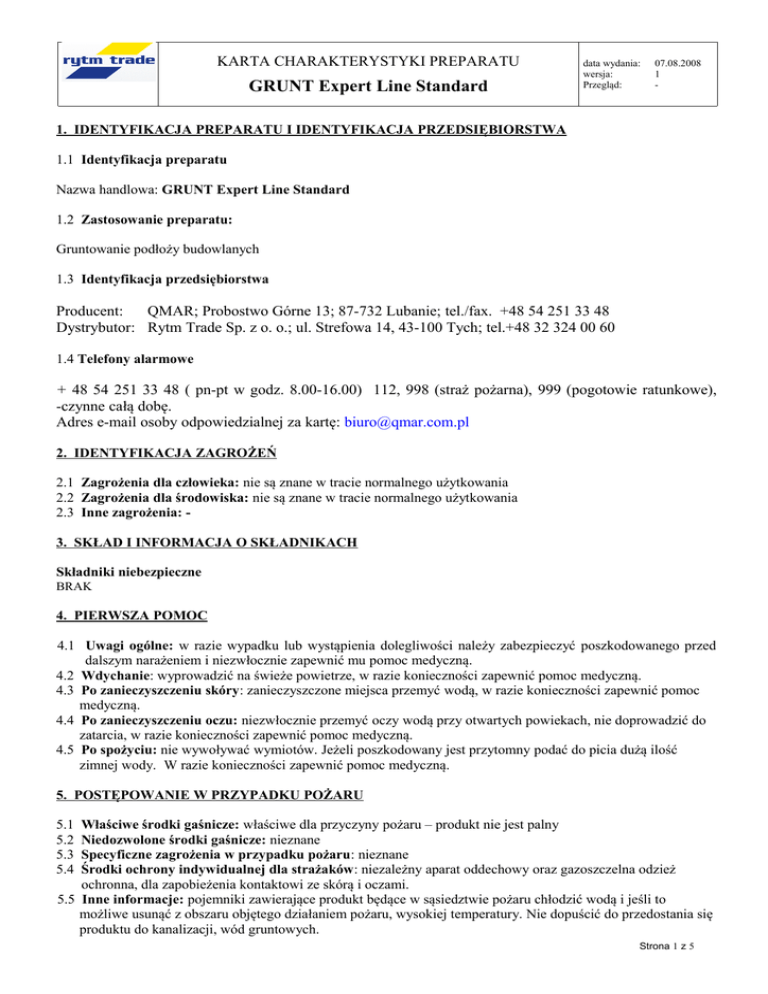 KARTA CHARAKTERYSTYKI PREPARATU GRUNT Expert Line Standard data wydania: wersja: Przegląd: 07.08.2008 1 - 1. IDENTYFIKACJA PREPARATU I IDENTYFIKACJA PRZEDSIĘBIORSTWA 1.1 Identyfikacja preparatu Nazwa handlowa: GRUNT Expert Line Standard 1.2 Zastosowanie preparatu: Gruntowanie podłoży budowlanych 1.3 Identyfikacja przedsiębiorstwa Producent: QMAR; Probostwo Górne 13; 87-732 Lubanie; tel./fax. +48 54 251 33 48 Dystrybutor: Rytm Trade Sp. z o. o.; ul. Strefowa 14, 43-100 Tych; tel.+48 32 324 00 60 1.4 Telefony alarmowe + 48 54 251 33 48 ( pn-pt w godz. 8.00-16.00) 112, 998 (straż pożarna), 999 (pogotowie ratunkowe), -czynne całą dobę. Adres e-mail osoby odpowiedzialnej za kartę: [email protected] 2. IDENTYFIKACJA ZAGROŻEŃ 2.1 Zagrożenia dla człowieka: nie są znane w tracie normalnego użytkowania 2.2 Zagrożenia dla środowiska: nie są znane w tracie normalnego użytkowania 2.3 Inne zagrożenia: 3. SKŁAD I INFORMACJA O SKŁADNIKACH Składniki niebezpieczne BRAK 4. PIERWSZA POMOC 4.1 Uwagi ogólne: w razie wypadku lub wystąpienia dolegliwości należy zabezpieczyć poszkodowanego przed dalszym narażeniem i niezwłocznie zapewnić mu pomoc medyczną. 4.2 Wdychanie: wyprowadzić na świeże powietrze, w razie konieczności zapewnić pomoc medyczną. 4.3 Po zanieczyszczeniu skóry: zanieczyszczone miejsca przemyć wodą, w razie konieczności zapewnić pomoc medyczną. 4.4 Po zanieczyszczeniu oczu: niezwłocznie przemyć oczy wodą przy otwartych powiekach, nie doprowadzić do zatarcia, w razie konieczności zapewnić pomoc medyczną. 4.5 Po spożyciu: nie wywoływać wymiotów. Jeżeli poszkodowany jest przytomny podać do picia dużą ilość zimnej wody. W razie konieczności zapewnić pomoc medyczną. 5. POSTĘPOWANIE W PRZYPADKU POŻARU 5.1 5.2 5.3 5.4 Właściwe środki gaśnicze: właściwe dla przyczyny pożaru – produkt nie jest palny Niedozwolone środki gaśnicze: nieznane Specyficzne zagrożenia w przypadku pożaru: nieznane Środki ochrony indywidualnej dla strażaków: niezależny aparat oddechowy oraz gazoszczelna odzież ochronna, dla zapobieżenia kontaktowi ze skórą i oczami. 5.5 Inne informacje: pojemniki zawierające produkt będące w sąsiedztwie pożaru chłodzić wodą i jeśli to możliwe usunąć z obszaru objętego działaniem pożaru, wysokiej temperatury. Nie dopuścić do przedostania się produktu do kanalizacji, wód gruntowych. Strona 1 z 5 KARTA CHARAKTERYSTYKI PREPARATU GRUNT Expert Line Standard data wydania: wersja: Przegląd: 07.08.2008 1 - 6. POSTĘPOWANIE W PRZYPADKU NIEZAMIERZONEGO UWOLNIENIA DO ŚRODOWISKA 6.1 Środki ochrony osobistej: podstawowe ochrony stosowane przy pracach z chemikaliami 6.2 Środki ochrony środowiska: zapobiec rozprzestrzenianiu się uwolnionego materiału, nie dopuścić do zanieczyszczenia gleby oraz przedostania się do wód powierzchniowych, gruntowych i kanalizacji. 6.3 Metody oczyszczania: uwolniony produkt zostawić do wyschnięcia lub przysypać chłonnym materiałem (piasek, ziemia, itp.), a następnie zebrać do odpowiednio oznaczonego pojemnika, dalsze postępowanie z odpadem zgodnie z p.13. 7. POSTĘPOWANIE Z SUBSTANCJĄ I JEJ MAGAZYNOWANIE 7.1 Postępowanie z substancją lub preparatem: unikać kontaktu z produktem, nie jeść, nie pić i nie palić w miejscu pracy, unikać zanieczyszczenia oczu, skóry i odzieży, stosować środki ochrony indywidualnej opisane w p. 8. Zabezpieczyć dobrą wentylację na stanowisku pracy. 7.2 Magazynowanie: produkt przechowywać w zamkniętych, szczelnych oryginalnych opakowaniach w chłodnym i suchym pomieszczeniu magazynowym odpowiednio przystosowanym, w temperaturze od+10 do + 25ºC. Chronić przed zamarznięciem. 7.3 Specyficzne zastosowania: stosować zgodnie z przeznaczeniem. 8. KONTROLA NARAŻENIA I ŚRODKI OCHRONY INDYWIDUALNEJ Stosowane środki ochrony osobistej powinny spełniać wymogi Rozporządzenia Ministra Gospodarki, Pracy i Polityki Socjalnej z dnia 31 marca 2003 r.(Dz.U. Nr 60, poz.725) 8.1 Wartości graniczne narażenia: Produkt / składnik NDS*) [mg/m3] NDSCh*) [mg/m3] NDSP*) [mg/m3] DSB [mg/kg] nie wyznaczono nie wyznaczono nie wyznaczono nie wyznaczono Grunt Expert Line Standard *)(wg Rozporządzenia Ministra Pracy i Polityki Socjalnej z dnia 29 listopada 2002 r. (Dz.U. Nr 217, poz.1833), wraz z późniejszymi zmianami.) 8.2 Kontrola narażenia Zalecenia dotyczące procedury monitoringu zawartości składników niebezpiecznych w powietrzu – metodyka pomiarów – zgodnie z: Rozporządzeniem Ministra Zdrowia i Opieki Społecznej z dnia 20 kwietnia 2005 w sprawie badań i pomiarów czynników szkodliwych dla zdrowia w środowisku pracy (Dz.U. Nr 73 z 2005 r., poz.645) Uwaga:, gdy stężenie substancji jest ustalone i znane, doboru środków ochrony indywidualnej należy dokonywać z uwzględnieniem stężenia substancji występującego na danym stanowisku pracy, czasu ekspozycji oraz czynności wykonywanych przez pracownika. W sytuacji awaryjnej, jeżeli stężenie substancji na stanowisku pracy nie jest znane, stosować środki ochrony indywidualnej o najwyższej zalecanej klasie ochrony. Pracodawca jest obowiązany zapewnić, aby stosowne środki ochrony indywidualnej oraz odzież i obuwie robocze posiadały właściwości ochronne i użytkowe oraz zapewnić odpowiednie ich pranie, konserwację, naprawę i odkażanie. Zalecane badanie wstępne i okresowe pracowników należy przeprowadzać zgodnie z Rozporządzeniem Ministra Zdrowia i Opieki Społecznej z dnia 30 maja 1996 r., w sprawie przeprowadzania badań lekarskich pracowników, zakres profilaktycznej opieki zdrowotnej nad pracownikami oraz orzeczeń lekarskich wydanych do celów przewidzianych w Kodeksie Pracy (Dz.U. Nr 69 z 1996 ar, poz.332, ze zmianami Dz.U. Nr 37 z 2001 r., poz. 451). 8.3 Ochrona dróg oddechowych: stosować maski jedynie przypadku rozpylania produktu 8.4 Ochrona oczu/twarzy: okulary ochronne 8.5 Ochrona rąk: rękawice ochronne Materiał, którego wykonane s