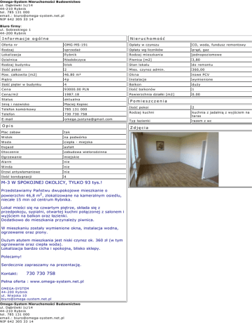 Omega-System Nieruchomości Budownictwo ul. Dąbrówki 1c/14 44-210 Rybnik tel. 785 131 000 email.: [email protected] NIP 642 305 33 14 Biuro firmy: ul. Sobieskiego 1 44-200 Rybnik Informacje ogólne Nieruchomość Oferta nr OMG-MS-191 Opłaty w czynszu CO, woda, fundusz remontowy Rodzaj sprzedaż Opłaty wg liczników prąd, gaz Lokalizacja Rybnik Rodzaj mieszkania jednopoziomowe Dzielnica Niedobczyce Piwnica [m2] 3,80 Rodzaj budynku blok Stan lokalu do remontu Ilość pokoi 2 Mies. czynsz admin. 360,00 Pow. całkowita [m2] 46.80 m² Okna nowe PCV Piętro 4p Instalacje wymienione Ilość pięter w budynku 4 Balkon duży Cena 93000.00 PLN Ilość balkonów 1 Cena/m2 1987.18 Powierzchnia działki [m2] 0.00 Status aktualna Imię i nazwisko Maciej Kopiec Telefon komórkowy 785 131 000 Telefon 730 730 758 E-mail [email protected] Opis Ilość pokoi 2 Rodzaj kuchni kuchnia z jadalnią z wyjściem na taras Typ łazienki razem z wc Zdjęcia Plac zabaw tak Widok na podwórko Woda ciepła - miejska Dojazd asfalt Otoczenie zabudowa wielorodzinna Ogrzewanie miejskie Alarm nie Winda nie Drzwi antywłamaniowe nie Ilość kondygnacji 4 M-3 W SPOKOJNEJ OKOLICY, TYLKO 93 tys.! Przedstawiamy Państwu dwupokojowe mieszkanie o powierzchni 46,8 m2 , zlokalizowane na kameralnym osiedlu, niecałe 15 min od centrum Rybnika. Lokal mieści się na czwartym piętrze, składa się z przedpokoju, sypialni, otwartej kuchni połączonej z salonem i wyjściem na balkon oraz łazienki. Dodatkowo do mieszkania przynależy piwnica. W mieszkaniu zostały wymienione okna, instalacja wodna, ogrzewanie oraz piony. Dużym atutem mieszkania jest niski czynsz ok. 360 zł (w tym ogrzewanie oraz ciepła woda). Lokalizacja bardzo cicha i spokojna, blisko sklepy. Polecamy! Serdecznie zapraszamy na prezentację. Kontakt: Pomieszczenia 730 730 758 Pełna oferta : www.omega-system.net.pl OMEGA-SYSTEM 44-200 Rybnik ul. Wiejska 10 [email protected] Omega-System Nieruchomości Budownictwo ul. Dąbrówki 1c/14 44-210 Rybnik tel. 785 131 000 email.: [email protected] NIP 642 305 33 14 Biuro firmy: ul. Sobieskiego 1 44-200 Rybnik