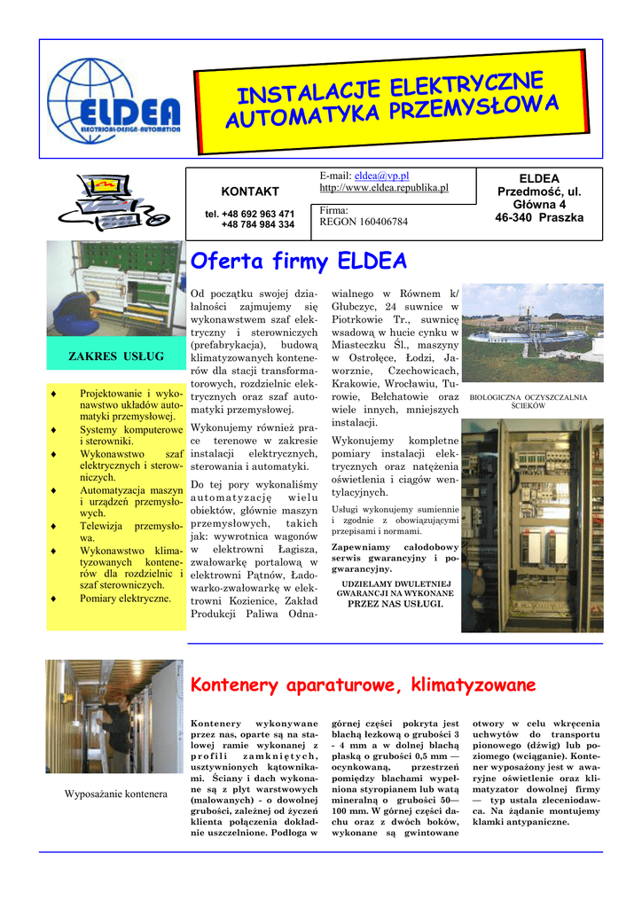RYCZNE T K E L E E J C A L A T S IN SŁOWA Y M E Z R P A K Y T A M AUTO KONTAKT tel. +48 692 963 471 +48 784 984 334 E-mail: [email protected] http://www.eldea.republika.pl Firma: REGON 160406784 ELDEA Przedmość, ul. Główna 4 46-340 Praszka Oferta firmy ELDEA ♦ ♦ ♦ ♦ ♦ ♦ ♦ Od początku swojej działalności zajmujemy się wykonawstwem szaf elektryczny i sterowniczych (prefabrykacja), budową ZAKRES USŁUG klimatyzowanych kontenerów dla stacji transformatorowych, rozdzielnic elekProjektowanie i wyko- trycznych oraz szaf autonawstwo układów auto- matyki przemysłowej. matyki przemysłowej. Systemy komputerowe i sterowniki. Wykonawstwo szaf elektrycznych i sterowniczych. Automatyzacja maszyn i urządzeń przemysłowych. Telewizja przemysłowa. Wykonawstwo klimatyzowanych kontenerów dla rozdzielnic i szaf sterowniczych. Pomiary elektryczne. Wykonujemy również prace terenowe w zakresie instalacji elektrycznych, sterowania i automatyki. Do tej pory wykonaliśmy a ut o ma t yz a c ję wie l u obiektów, głównie maszyn przemysłowych, takich jak: wywrotnica wagonów w elektrowni Łagisza, zwałowarkę portalową w elektrowni Pątnów, Ładowarko-zwałowarkę w elektrowni Kozienice, Zakład Produkcji Paliwa Odna- wialnego w Równem k/ Głubczyc, 24 suwnice w Piotrkowie Tr., suwnicę wsadową w hucie cynku w Miasteczku Śl., maszyny w Ostrołęce, Łodzi, Jaworznie, Czechowicach, Krakowie, Wrocławiu, Turowie, Bełchatowie oraz wiele innych, mniejszych instalacji. BIOLOGICZNA OCZYSZCZALNIA ŚCIEKÓW Wykonujemy kompletne pomiary instalacji elektrycznych oraz natężenia oświetlenia i ciągów wentylacyjnych. Usługi wykonujemy sumiennie i zgodnie z obowiązującymi przepisami i normami. Zapewniamy całodobowy serwis gwarancyjny i pogwarancyjny. UDZIELAMY DWULETNIEJ GWARANCJI NA WYKONANE PRZEZ NAS USŁUGI. Kontenery aparaturowe, klimatyzowane Wyposażanie kontenera Kontenery wykonywane przez nas, oparte są na stalowej ramie wykonanej z profili zamkniętych, usztywnionych kątownikami. Ściany i dach wykonane są z płyt warstwowych (malowanych) - o dowolnej grubości, zależnej od życzeń klienta połączenia dokładnie uszczelnione. Podłoga w górnej części pokryta jest blachą łezkową o grubości 3 - 4 mm a w dolnej blachą płaską o grubości 0,5 mm — ocynkowaną, przestrzeń pomiędzy blachami wypełniona styropianem lub watą mineralną o grubości 50— 100 mm. W górnej części dachu oraz z dwóch boków, wykonane są gwintowane otwory w celu wkręcenia uchwytów do transportu pionowego (dźwig) lub poziomego (wciąganie). Kontener wyposażony jest w awaryjne oświetlenie oraz klimatyzator dowolnej firmy — typ ustala zleceniodawca. Na żądanie montujemy klamki antypaniczne.