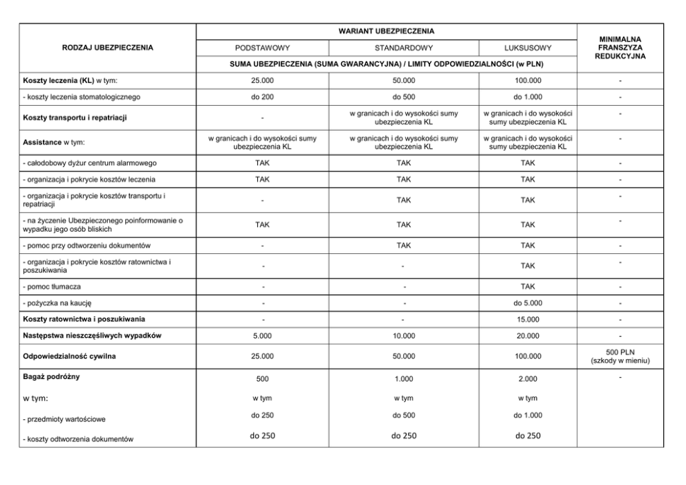 WARIANT UBEZPIECZENIA RODZAJ UBEZPIECZENIA PODSTAWOWY STANDARDOWY LUKSUSOWY MINIMALNA FRANSZYZA REDUKCYJNA SUMA UBEZPIECZENIA (SUMA GWARANCYJNA) / LIMITY ODPOWIEDZIALNOŚCI (w PLN) Koszty leczenia (KL) w tym: 25.000 50.000 100.000 - - koszty leczenia stomatologicznego do 200 do 500 do 1.000 - - w granicach i do wysokości sumy ubezpieczenia KL w granicach i do wysokości sumy ubezpieczenia KL - w granicach i do wysokości sumy ubezpieczenia KL w granicach i do wysokości sumy ubezpieczenia KL w granicach i do wysokości sumy ubezpieczenia KL - - całodobowy dyŜur centrum alarmowego TAK TAK TAK - - organizacja i pokrycie kosztów leczenia TAK TAK TAK - - TAK TAK TAK TAK TAK - pomoc przy odtworzeniu dokumentów - TAK TAK - organizacja i pokrycie kosztów ratownictwa i poszukiwania - - TAK - pomoc tłumacza - - TAK - - poŜyczka na kaucję - - do 5.000 - Koszty ratownictwa i poszukiwania - - 15.000 - Następstwa nieszczęśliwych wypadków 5.000 10.000 20.000 - Odpowiedzialność cywilna 25.000 50.000 100.000 500 PLN (szkody w mieniu) 500 1.000 2.000 - w tym w tym w tym do 250 do 500 do 1.000 do 250 do 250 do 250 Koszty transportu i repatriacji Assistance w tym: - organizacja i pokrycie kosztów transportu i repatriacji - na Ŝyczenie Ubezpieczonego poinformowanie o wypadku jego osób bliskich BagaŜ podróŜny w tym: - przedmioty wartościowe - koszty odtworzenia dokumentów -