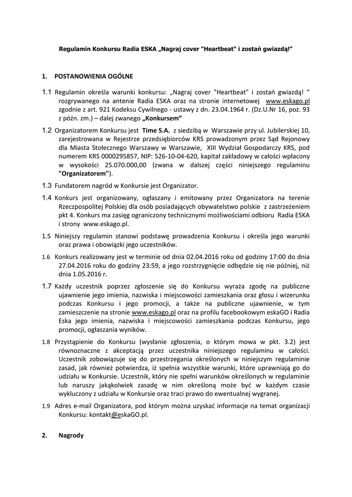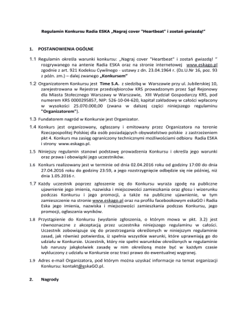 Regulamin Konkursu Radia ESKA „Nagraj cover "Heartbeat" i zostań gwiazdą!” 1. POSTANOWIENIA OGÓLNE 1.1 Regulamin określa warunki konkursu: „Nagraj cover "Heartbeat" i zostań gwiazdą! ” rozgrywanego na antenie Radia ESKA oraz na stronie internetowej www.eskago.pl zgodnie z art. 921 Kodeksu Cywilnego - ustawy z dn. 23.04.1964 r. (Dz.U.Nr 16, poz. 93 z późn. zm.) – dalej zwanego „Konkursem” 1.2 Organizatorem Konkursu jest Time S.A. z siedzibą w Warszawie przy ul. Jubilerskiej 10, zarejestrowana w Rejestrze przedsiębiorców KRS prowadzonym przez Sąd Rejonowy dla Miasta Stołecznego Warszawy w Warszawie, XIII Wydział Gospodarczy KRS, pod numerem KRS 0000295857, NIP: 526-10-04-620, kapitał zakładowy w całości wpłacony w wysokości 25.070.000,00 (zwana w dalszej części niniejszego regulaminu "Organizatorem"). 1.3 Fundatorem nagród w Konkursie jest Organizator. 1.4 Konkurs jest organizowany, ogłaszany i emitowany przez Organizatora na terenie Rzeczpospolitej Polskiej dla osób posiadających obywatelstwo polskie z zastrzeżeniem pkt 4. Konkurs ma zasięg ograniczony technicznymi możliwościami odbioru Radia ESKA i strony www.eskago.pl. 1.5 Niniejszy regulamin stanowi podstawę prowadzenia Konkursu i określa jego warunki oraz prawa i obowiązki jego uczestników. 1.6 Konkurs realizowany jest w terminie od dnia 02.04.2016 roku od godziny 17:00 do dnia 27.04.2016 roku do godziny 23:59, a jego rozstrzygnięcie odbędzie się nie później, niż dnia 1.05.2016 r. 1.7 Każdy uczestnik poprzez zgłoszenie się do Konkursu wyraża zgodę na publiczne ujawnienie jego imienia, nazwiska i miejscowości zamieszkania oraz głosu i wizerunku podczas Konkursu i jego promocji, a także na publiczne ujawnienie, w tym zamieszczenie na stronie www.eskago.pl oraz na profilu facebookowym eskaGO i Radia Eska jego imienia, nazwiska i miejscowości zamieszkania podczas Konkursu, jego promocji, ogłaszania wyników. 1.8 Przystąpienie do Konkursu (wysłanie zgłoszenia, o którym mowa w pkt. 3.2) jest równoznaczne z akceptacją przez uczestnika niniejszego regulaminu w całości. Uczestnik zobowiązuje się do przestrzegania określonych w niniejszym regulaminie zasad, jak również potwierdza, iż spełnia wszystkie warunki, które uprawniają go do udziału w Konkursie. Uczestnik, który nie spełni warunków określonych w regulaminie lub naruszy jakąkolwiek zasadę w nim określoną może być w każdym czasie wykluczony z udziału w Konkursie oraz traci prawo do ewentualnej wygranej. 1.9 Adres e-mail Organizatora, pod którym można uzyskać informacje na temat organizacji Konkursu: [email protected]. 2. Nagrody 2.1 Zwycięzca Konkursu otrzyma nagrodę w postaci udziału w nagraniu utworu wspólnie z Margaret oraz udziału w pamiątkowej sesji zdjęciowej o łącznej wartości 1070 brutto. Dodatkowo zwycięzca otrzyma nagrodę pieniężną w wysokości 100 złotych. 2.2 Organizator oświadcza, że nagroda zostanie zrealizowana zgodnie z obowiązującymi przepisami prawa podatkowego. 2.3 Organizator nie ponosi odpowiedzialności za niemożność zrealizowania lub niezrealizowania którejkolwiek nagrody, z jakiejkolwiek przyczyny leżącej po stronie nagrodzonego uczestnika. 2.4 Organizator nie ponosi odpowiedzialności za zmianę miejsca zamieszkania i/lub podanego przez uczestnika Konkursu adresu lub zmianę innych danych – uniemożliwiającą kontakt z tym uczestnikiem lub odebranie przez niego zestawu nagród/nagrody. 2.5 O szczegółach realizacji nagrody zwycięzca Konkursu zostanie poinformowany przez Organizatora drogą mailową lub za pośrednictwem rozmowy telefonicznej. 2.6 Nagroda nie zrealizowana przez zwycięzcę Konkursu w terminie 30 dni od rozstrzygnięcia Konkursu własność pozostaje do wyłącznej dyspozycji Organizatora. 2.7 Przy realizacji przez zwycięzcę edycji Konkursu nagrody zobowiązany jest on okazać dokument potwierdzający jego tożsamość lub w przypadku realizacji tej nagrody przez pełnomocnika zwycięzcy zobowiązany jest on okazać pisemne upoważnienie od zwycięzcy, który wygrał daną nagrodę, zawierające następujące informacje: imię nazwisko, adres, numer i seria dowodu osobistego, telefon kontaktowy tego zwycięzcy oraz adnotację o upoważnieniu określonej osoby do zrealizowania w jego imieniu danej nagrody, jak również podpis tego zwycięzcy wraz z danymi osoby odbierającej czyli imieniem, nazwiskiem, serią i numerem dowodu osobistego oraz telefonem odbiorcy. W przypadku niespełnienia przez osobę podającą się za pełnomocnika zwycięzcy powyższych warunków nagroda nie będzie jej zrealizowana. 2.8 Wszystkie nagrody pozostają własnością Fundatora do momentu przekazania ich odpowiednio zwycięzcy każdej edycji Konkursu. 3. Zasady uczestnictwa w konkursie 3.1 Ogólne zasady Konkursu podawane są w programie Radia ESKA i w zwiastunach promocyjnych Konkursu emitowanych na antenie Radia ESKA oraz na stronie internetowej www.eskaGO.pl. 3.2 W celu wzięcia udziału w Konkursie należy w dniach od 02.04.2016. od godziny 17 do dnia 27.04.2016 r. do godz. 23:59 dokonać zgłoszenia do Konkursu poprzez wysłanie formularza dostępnego na stronie www.eskago.pl. Wypełnienie formularza polega na wklejeniu linka z YT do wykonanego przez Uczestnika coveru piosenki „Heartbeat”, zarejestrowanego w aplikacji Margaret oraz podaniu imienia i nazwiska, miejsca zamieszkania, numeru telefonu i adresu e-mail. Uczestnik zobowiązany jest posiadać pełnię praw do materiału przesłanego do Konkursu. 3.2.1 Spośród wszystkich kompletnych zgłoszeń do Konkursu, komisja konkursowa wybierze zgłoszenie uczestnika, który w jej ocenie wykonał przedstawione w Konkursie zadanie w sposób najciekawszy i najbardziej oryginalny. 3.3 Zgłoszenia do Konkursu jedna osoba może dokonać nie więcej niż jeden raz. 3.4 Dane zwycięzcy edycji wpisywane są do metryczki konkursowej. Zwycięzca zobowiązany jest do podania Organizatorowi swoic