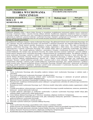 KARTA PRZEDMIOTU KIERUNEK STUDIÓW WYCHOWANIE FIZYCZNE NAZWA PRZEDMIOTU TEORIA WYCHOWANIA FIZYCZNEGO POZIOM STUDIÓW I° ROK I, II SEMESTR II, III TYP PRZEDMIOTU obligatoryjny CEL I ZAŁOŻENIA PUNKTY ECTS 6 Rodzaj zajęć Ilość godz. Stacjon/Niestac. WYKŁADY 20 18 ĆWICZENIA 39 27 METODY NAUCZANIA JĘZYK WYKŁADOWY wykład, ćwiczenia polski Przekazanie studentom wiedzy z zakresu kultury fizycznej ze szczególnym uwzględnieniem teoretycznych podstaw procesu wychowania fizycznego. Zrozumienie funkcji i znaczenia fizycznej edukacji człowieka. Kształtowanie umiejętności uzasadnienia miejsca wychowania fizycznego w edukacji, rozumienia teorii i praw wyjaśniających mechanizmy oddziaływania środkami fizycznymi na organizm oraz środkami społecznymi na osobowość w procesie kształcenia i wychowania fizycznego. Znajomość i posługiwanie się terminologią w zakresie nauk o zdrowiu i kulturze fizycznej. Przekazanie istoty roli i roli zawodu oraz pracy nauczyciela wychowania fizycznego. EFEKTY KSZTAŁCENIA Zna podstawowe definicje związane z teorią wychowania fizycznego. Zna głównych twórców teorii wychowania fizycznego, ich cele i założenia. Zna cele wychowania fizycznego i ich stosowanie w zależności od potrzeb. Zna założenia edukacji fizycznej wg H. Grabowskiego. Potrafi omówić potrzeby uczestnictwa w procesie edukacji w całym życiu. Wie, jakie są biomedyczne podstawy wychowania fizycznego. Zna relacje zachodzące między organizmem a siłami natury. Zna czynniki przyrodnicze wykorzystywane w procesie wychowania fizycznego. Zna czynniki mające wpływ na osobowości wychowanka. Zna funkcje edukacji fizycznej. Zna warunki społeczne, kulturowe i przyrodnicze związane z kształceniem fizycznym. Uwzględnia je w swoich działaniach. Zna metody oceny sprawności fizycznej. Zna zasady nauczania czynności ruchowych w procesie edukacji. Potrafi omówić założenia teorii wychowania fizycznego z umiejscowieniem jej w programach studiów. Zna definicje związane z teorią wychowania fizycznego i potrafi je omówić. Zna i rozumie znaczenie aktywności fizycznej w życiu człowieka. Zna i omawia funkcje aktywności fizycznej. Potrafi omówić znaczenie wychowania fizycznego w kulturze fizycznej. Rozumie i omawia znaczenie edukacji międzypokoleniowej. Omawia cele i funkcje wychowania fizycznego oraz współczesne jego koncepcje. Rozumie i potrafi analizować potrzebę ruchu i znaczenie ruchu w życiu człowieka. Zna podstawowe zagadnienia motoryczności człowieka i omawia je jako czynnik praktyczny wychowania fizycznego. Zna i potrafi zastosować w praktyce zasady uczenia ruchu. Omawia mechanizmy procesu wychowania fizycznego. Rozumie efektywność i skuteczność wychowania fizycznego, potrafi omówić te zagadnienia. Analizuje i potrafi ocenić nowoczesność w wychowaniu fizycznym. Zna i potrafi wskazać główne kompetencje nauczyciela wychowania fizycznego. TREŚCI PROGRAMOWE Wykłady: 1. Teoria wychowania fizycznego jako dyscyplina naukowa (miejsce teorii wychowania fizycznego w rodzinie nauk o człowieku). 2. Trzy wersje polskiej teorii wychowania fizycznego i ich główni twórcy. 3. Teleologia w wychowaniu fizycznym (różnice celów wychowania fizycznego w zależności od potrzeb społecznopolitycznych oraz aktualnych prądów pedagogicznych). 4. Edukacja fizyczna i jej postacie intencjonalne: kształcenie fizyczne i wychowanie fizyczne (wg H. Grabowskiego). 5. Rola procesów socjalizacji (nieintencjonalna postać edukacji) w przygotowaniu człowieka do całożyciowego uczestnictwa w kulturze fizycznej. 6. Biomedyczna teoria wychowania fizycznego wg Z. Gilewicza (model relacji jakie zachodzą między organizmami a siłami natury). 7. Czynniki przyrodnicze wykorzystywane w procesie kształcenia fizycznego (czynniki mechaniczne, termiczne, promieniste, kinetyczne – postacie aktywności ruchowej). 8. Czynniki społeczne wpływające na osobowość wychowanka w procesie wychowania fizycznego (model relacji jakie zachodzą między osobowością a siłami społecznymi). 9. Cztery funkcje edukacji fizycznego wg Z. Gilewicza: stymulacja, adaptacja, korektywa i kompensacja. 10. Warunki przyrodnicze kształcenia fizycznego (wiek, płeć, konstytucja somatyczna, sprawności i zdolności) oraz warunki społeczno-kulturowe wychowania fizycznego. 11. Sprawność fizyczna młodzieży i metody jej oceny. 12. Nauczanie czynności ruchowych w procesie edukacji fizycznej. Ćwiczenia: 1. Teoria wychowania fizycznego, jej przedmiot, treść i miejsce w strukturze studiów. 2. Kultura fizyczna i jej rozumienie (kultura a kultura fizyczna, definicje, historyczne przesłanki koncepcji kultury fizycznej. 3. Rodowód i znaczenie aktywności człowieka (wartości kultury fizycznej, wzory kultury fizycznej). 4. Funkcje aktywności fizycznej (rozwojowa, adaptacyjna, korektywna, kompensacyjna). 5. Wychowanie fizyczne jako podstawa uczestnictwa w kulturze fizycznej. 6. 7. 8. 9. 10. 11. 12. 13. 14. 15. 16. Edukacja fizyczna międzydzypokoleniowym przekazem wzorów wartości i wzorów zachowań dotyczących ciała (podstawowe pojęcia: edukacja, kształcenie, wychowanie, edukacja fizyczna, fizyczne kształcenie). Cele i funkcje wychowania fizycznego. Ewolucja poglądów istoty wychowania fizycznego. Współczesne koncepcje celów wychowania fizycznego. Wpływ aktywności fizycznej na organizm człowieka (ruch jako naturalna potrzeba organizmu człowieka). Motoryczność człowieka, jej aspekty, rodzaje oraz osobnicze uwarunkowania. Rodzaje, metody, uwarunkowania, zasady i fazy uczenia ruchu. Podstawowe pojęcia, mechanizmy i uwarunkowania procesu fizycznego wychowania. Skuteczność kształcenia i wychowania fizycznego. Nowoczesność w procesie fizycznej edukacji. Nauczyciel w procesie wychowania fizycznego. Kompetencje zawodowe nauczycieli wychowania fizycznego. Autorytet. METODY OCENY Studenta obowiązuje znajomość wiedzy zawartej w treściach programu i przedstawionej literatury. 