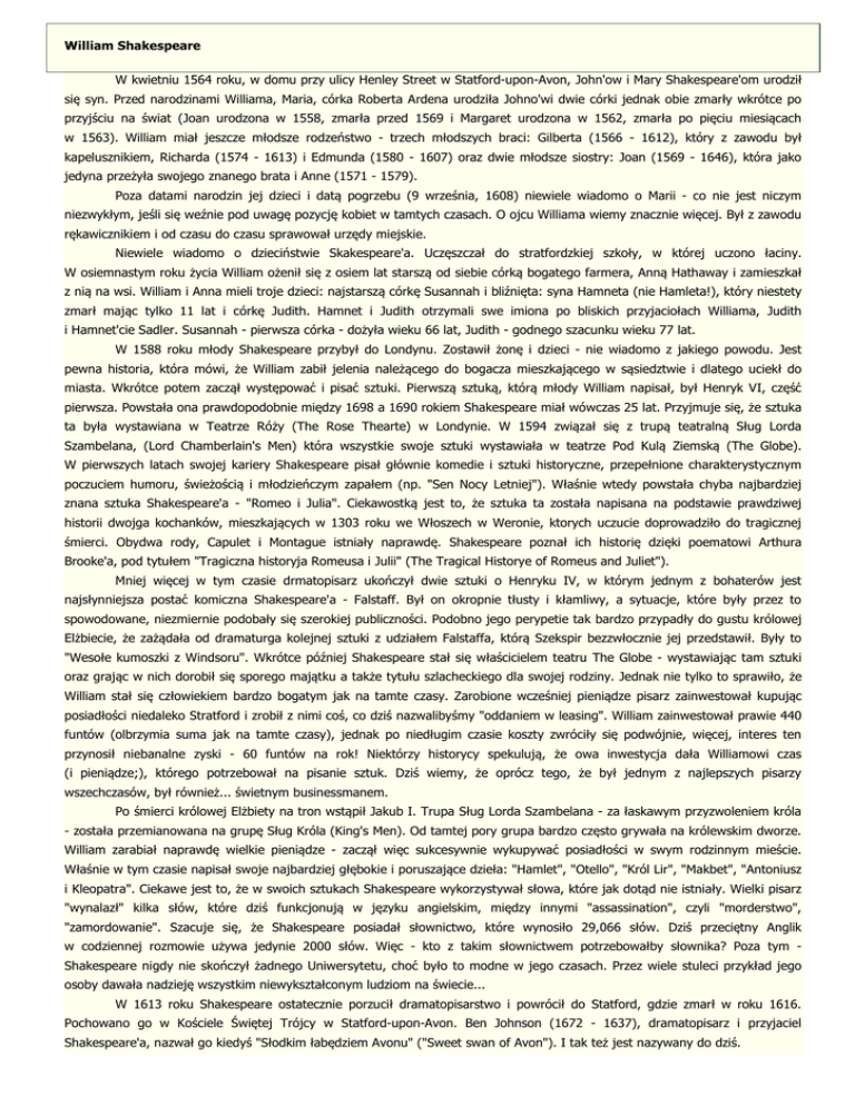 W kwietniu 1564 roku, w domu przy ulicy Henley Street w Statford-upon-Avon, John'ow i Mary Shakespeare'om urodził
