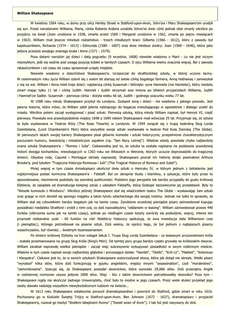 w codziennej rozmowie używa jedynie 2000 słów. Więc - kto z takim słownictwem potrzebowałby słownika? Poza tym Shakespeare nigdy nie skończył żadnego Uniwersytetu, choć było to modne w jego czasach. Przez wiele stuleci przykład jego