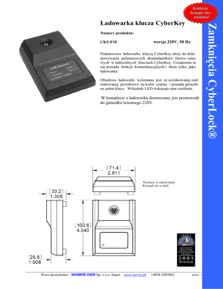 K Koonnttrroollaa ddoossttęęppuu bbeezz zzaassiillaanniiaa!! Numery produktu: wersja 220V, 50 Hz CKS-F10 Podstawowa ładowarka kluczy CyberKey służy do doładowywania polimerowych akumulatorków litowo–ionowych w ładowalnych kluczach CyberKey. Urządzenie to nie posiada funkcji komunikacyjnych i służy tylko jako ładowarka Obudowa ładowarki wykonana jest ze ocynkowanej stali malowanej proszkowo na kolor czarny i posiada gniazdo na jeden klucz. Wskaźnik LED wskazuje stan zasilenia. W komplecie z ładowarką dostarczany jest prostownik do gniazdka ściennego 220V. Zamknięcia CyberLock® Ładowarka klucza CyberKey Wymiary w calach (mm) Rysunek nie w skali Wasz dystrybutor: NAVIMOR OXER Sp. z o.o. Sopot www.navox.pl +4858 5507802 00920 – GCO2730 Cechy wspólne sprzętu Klucze Zamknięcia CyberLock® • Klucze nie dają się kopiować • Klucz pamięta do 3900 zdarzeń i ich metryczek czasu • Standardowy klucz obsługuje do 3300 zamków • Klucz pamięta harmonogramy dostępu co do sekund • Klucz posiada zasilanie z bateryjki lub akumulatora LiIon • Zakres temperatur pracy: od 0° do 50° C Zamki • Brak otworu na klucz, co uniemożliwia wandalizm i forsowanie • Zamek pamięta ostatnie 1100 zdarzeń i ich metryczki czasu • Brak ograniczenia co do ilości kluczy otwierających zamek • Zabezpieczenie przeciw przekręcaniu na dźwignię, traktowaniu ładunkiem elektrycznym i magnesem neodymowym • Zakres temperatur pracy: od -40° do 70° C Poziomy zarządzania zamknięciami CyberLock EntryPoint™ nie posiada oprogramowania i ogranicza się tylko do zainstalowania sprzętu.Wszystkie klucze mają dostęp do wszystkich zamków przez całą dobę. Instalacja obejmuje zamki, klucze i klucz generalny Grand Master. CyberAudit®-Web Lite jest oprogramowaniem na PC lub Macintosh o podstawowych funkcjach kontroli dostępu. Zestaw kompletny obejmuje klucze, zamki, klucz generalny Master Key, enkoder podczerwieni oraz oprogramowanie Lite. Na tym poziomie oprogramowania obsłużyć można do 50 zamków i 50 kluczy. CyberAudit-Web Professional jest oprogramowaniem dla 500 zamków i 500 kluczy napisanym w Java i instalowanym lokalnie lub na serwerze aplikacji. Zestaw kompletny obejmuje zamki, klucze, lokalną Kluczstację autoryzującą klucze i ew. zdalny Autoryzator, klucz Cyber Lock Programmer i/lub USB Programmer oraz oprogramowanie Professional. CyberAudit-Web Enterprise jest pakietem oprogramowania sieciowego przeznaczonego na serwer aplikacji świadczący usługi. System kompletny obejmuje zamki, klucze, serwer Enterprise i jedno lub kilka urządzeń komunikacyjnych. Na poziomie Enterprise zarządzać można geograficznie rozproszonymi instalacjami zamknięć CyberLock. Zestawienie porównawcze funkcji systemu CyberLock • Resetowanie zamków czy dodawanie i usuwanie kluczy dokonywane jest w programie. Zbędnym staje się więc kosztowne intalowanie nowych zamków, czy dorabianie nowych kluczy w razie utraty czy zagubienia klucza. • Zaprogramowane harmonogramy zapewniają kontrolę dat i godzin dostępu w ustawionym okresie. • Święta i dni wolne można za- programować jako odstępstwa od zadanych harmonogramów. Zamki CyberLock Klucze CyberKey Gniazda CyberPoint (kontrola obchodu terenu przez ochronę) Klucze generalne Grand Master Enkoder na podczerwień Hub Autoryzatora Internetowy/sieciowy/modemowy Stacja CyberKey lokalna USB Stacja CyberKey wersja sieciowa Schowki na 1 klucz ze współużytkowaniem kluczy Depozytory na 20 kluczy ze współużytkowaniem kluczy Komunikacja przez telefon komórkowy / PDA Historia zdarzeń Klucze z dostępem wg harmonogramu Klucze awaryjne Master Key IIFFSSEECC Ustawianie terminu wygaśnięcia uprawnień kluczy P PPrrroooddduuucccttt o oofff t tthhheee Y YYeeeaaarrr Powiadamianie mailem o upływie uprawnień klucza 222000000555 Klucze zagubione / utracone Dostęp przy użyciu wielu kluczy i ustawianie zwłoki Powiadamianie o zdarzeniach krytycznych e-mailem Powiadamianie emailem o niskim poziomie baterii klucza Hierarchia administratorów Obsługa grup zamków i użytkowników Obsługa uprawnień dostępu grupami Ściąganie historii zdarzeń zamków kluczem użytkownika Programowanie zamków kluczem użytkownika Misje(szablony ustawień konfiguracji i uprawnień dostępu) Ustawianie różnych stref czasowych Współużytkowanie zamków przez różne bazy danych Wasz dystrybutor: NAVIMOR OXER Sp. z o.o. Sopot www.navox.pl +4858 5507802 00920 – GCO2730