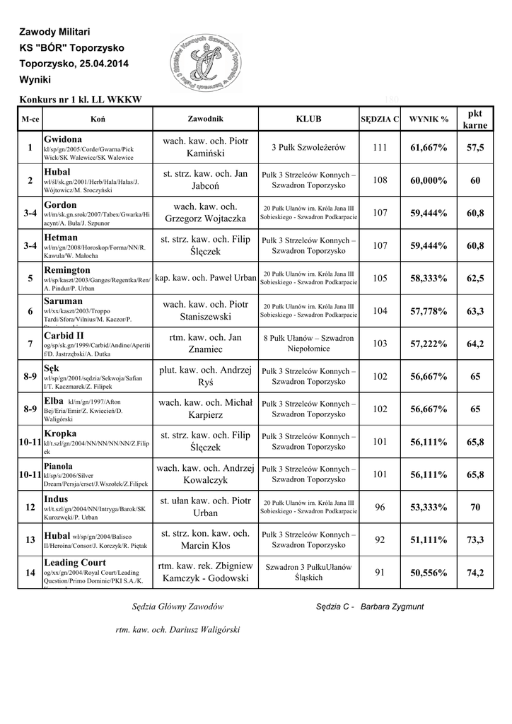 Zawody Militari KS "BÓR" Toporzysko Toporzysko, 25.04.2014 Wyniki 180 Konkurs nr 1 kl. LL WKKW Zawodnik KLUB SĘDZIA C WYNIK % pkt karne wach. kaw. och. Piotr Kamiński 3 Pułk SzwoleŜerów 111 61,667% 57,5 st. strz. kaw. och. Jan Jabcoń Pułk 3 Strzelców Konnych – Szwadron Toporzysko 108 60,000% 60 wach. kaw. och. Grzegorz Wojtaczka 20 Pułk Ułanów im. Króla Jana III Sobieskiego - Szwadron Podkarpacie 107 59,444% 60,8 st. strz. kaw. och. Filip Ślęczek Pułk 3 Strzelców Konnych – Szwadron Toporzysko 107 59,444% 60,8 kap. kaw. och. Paweł Urban 20 Pułk Ułanów im. Króla Jana III Sobieskiego - Szwadron Podkarpacie 105 58,333% 62,5 wach. kaw. och. Piotr Staniszewski 20 Pułk Ułanów im. Króla Jana III Sobieskiego - Szwadron Podkarpacie 104 57,778% 63,3 rtm. kaw. och. Jan Znamiec 8 Pułk Ułanów – Szwadron Niepołomice 103 57,222% 64,2 wł/sp/gn/2001/sędzia/Sekwoja/Safian I/T. Kaczmarek/Z. Filipek plut. kaw. och. Andrzej Ryś Pułk 3 Strzelców Konnych – Szwadron Toporzysko 102 56,667% 65 Elba kl/m/gn/1997/Afton Bej/Eria/Emir/Z. Kwiecień/D. Waligórski wach. kaw. och. Michał Pułk 3 Strzelców Konnych – Szwadron Toporzysko Karpierz 102 56,667% 65 st. strz. kaw. och. Filip Ślęczek Pułk 3 Strzelców Konnych – Szwadron Toporzysko 101 56,111% 65,8 wach. kaw. och. Andrzej Pułk 3 Strzelców Konnych – Szwadron Toporzysko Kowalczyk 101 56,111% 65,8 M-ce 1 2 Koń Gwidona kl/sp/gn/2005/Corde/Gwarna/Pick Wick/SK Walewice/SK Walewice Hubal wł/śl/sk.gn/2001/Herb/Hala/Hałas/J. Wójtowicz/M. Sroczyński Gordon 3-4 wł/m/sk.gn.srok/2007/Tabex/Gwarka/Hi acynt/A. Buła/J. Szpunor 3-4 wł/m/gn/2008/Horoskop/Forma/NN/R. Kawula/W. Małocha Hetman Remington 5 wł/sp/kaszt/2003/Ganges/Regentka/Ren/ A. Pindur/P. Urban 6 wł/xx/kaszt/2003/Troppo Tardi/Sfora/Vilnius/M. Kaczor/P. Staniszewski Saruman 7 8-9 8-9 Carbid II og/sp/sk.gn/1999/Carbid/Andine/Aperiti f/D. Jastrzębski/A. Dutka Sęk Kropka 10-11 kl/t.szl/gn/2004/NN/NN/NN/NN/Z.Filip ek Pianola 10-11 kl/sp/s/2006/Silver Dream/Persja/erset/J.Wszołek/Z.Filipek Indus wł/t.szl/gn/2004/NN/Intryga/Barok/SK Kurozwęki/P. Urban st. ułan kaw. och. Piotr Urban 20 Pułk Ułanów im. Króla Jana III Sobieskiego - Szwadron Podkarpacie 96 53,333% 70 Hubal wł/sp/gn/2004/Balisco 13 II/Heroina/Consor/J. Korczyk/R. Piętak st. strz. kon. kaw. och. Marcin Kłos Pułk 3 Strzelców Konnych – Szwadron Toporzysko 92 51,111% 73,3 rtm. kaw. rek. Zbigniew Kamczyk - Godowski Szwadron 3 PułkuUłanów Śląskich 91 50,556% 74,2 12 Leading Court 14 og/xx/gn/2004/Royal Court/Leading Question/Primo Dominie/PKI S.A./K. Kamczyk Sędzia Główny Zawodów rtm. kaw. och. Dariusz Waligórski Sędzia C - Barbara Zygmunt Zawody Militari, KS "BÓR" Toporzysko, 25.04.2014 Wyniki - próba terenowa czas pkt prz. pkt czas razem wach. kaw. och. Andrzej Pułk 3 Strzelców Konnych – Szwadron Kowalczyk Toporzysko 3,06 0 0 0 Elba kl/m/gn/1997/Afton Bej/Eria/Emir/Z. Kwiecień/D. Waligórski wach. kaw. och. Michał Pułk 3 Strzelców Konnych – Szwadron Karpierz Toporzysko 3,06 0 0 0 3 Leading Court og/xx/gn/2004/Royal Court/Leading Question/Primo Dominie/PKI S.A./K. Kamczyk rtm. kaw. rek. Zbigniew Kamczyk - Godowski 3,20 0 4 4 4 Sęk wł/sp/gn/2001/sędzia/Sekwoja/Safian I/T. Kaczmarek/Z. Filipek plut. kaw. och. Andrzej Pułk 3 Strzelców Konnych – Szwadron Ryś Toporzysko 3,33 0 9,2 9,2 5 Carbid II rtm. kaw. och. Jan Znamiec 8 Pułk Ułanów – Szwadron Niepołomice 3,34 0 9,6 9,6 kap. kaw. och. Paweł Urban 20 Pułk Ułanów im. Króla Jana III Sobieskiego Szwadron Podkarpacie 3,07 20 0 20 wachm. kaw. och. Piotr Staniszewski 20 Pułk Ułanów im. Króla Jana III Sobieskiego Szwadron Podkarpacie 3,27 20 6,8 26,8 st. ułan kaw. och. Piotr Urban 20 Pułk Ułanów im. Króla Jana III Sobieskiego Szwadron Podkarpacie 3,28 20 7,2 27,2 4,38 20 35,2 55,2 4,20 40 28 68 3,54 80 17,6 97,6 5,22 80 52,8 132,8 M-ce Koń Pianola 1-2 kl/sp/s/2006/Silver Dream/Persja/erset/J.Wszołek/Z.Filipek 1-2 6 7 8 9 og/sp/sk.gn/1999/Carbid/Andeline//J. Znamiec Remington wł/sp/kaszt/2003/Ganges/Regentka/Ren/A. Pindur/P. Urban Saruman wł/xx/kaszt/2003/Troppo Tardi/Sfora/Vilnius/M. Kaczor/P. Staniszewski Indus wł/t.szl/gn/2004/NN/Intryga/Barok/SK Kurozwęki/P. Urban Gwidona kl/sp/gn/2005/Corde/Gwarna/Pick Wick/SK Walewice/SK Walewice Hetman 10 wł/m/gn/2008/Horoskop/Forma/NN/R. Kawula/W. Małocha Hubal - - KLUB wachm. kaw. och. Piotr 3 Pułk SzwoleŜerów Kamiński st. strz. kaw. och. Filip Ślęczek Hubal wł/sp/gn/2004/Balisco II/Heroina/Consor/J. Korczyk/R. Piętak st. strz. kon. kaw. och. Marcin Kłos Gordon wach. kaw. och. Grzegorz Wojtaczka 20 Pułk Ułanów im. Króla Jana III Sobieskiego Szwadron Podkarpacie st. strz. kaw. och. Filip Ślęczek Pułk 3 Strzelców Konnych – Szwadron Toporzysko Kropka kl/t.szl/gn/2004/NN/NN/NN/NN/Z.Filipek 2 3 4 5 6a 6b 6c 7 8 9 10 11a 11b 12 13 20 20 20 20 Pułk 3 Strzelców Konnych – Szwadron Toporzysko Pułk 3 Strzelców Konnych – Szwadron Toporzysko Pułk 3 Strzelców Konnych – Szwadron Toporzysko Wójtowicz/M. Sroczyński wł/m/sk.gn.srok/2007/Tabex/Gwarka/Hiacynt/ A. Buła/J. Szpunor 1 Szwadron 3 PułkuUłanów Śląskich st. strz. kaw. och. Jan Jabcoń 11 wł/śl/sk.gn/2001/Herb/Hala/Hałas/J. 12 Zawodnik Sędzia Główny Zawodów Sędzia rtm. kaw. och. Dariusz Waligórski Barbara Zygmunt 20 20 20 40 20 20 40 20 20 40 el 20 el 20 40 el el dystans tempo norma czasu podwójna norma 1450 450 m/min 3,10 min 6,20 min liczba przeszkód liczba skoków wystartowało zawodników ukończyło zawodników 13 16 14 12 Zawody Militari KS Bór Toporzysko WYNIKI KONKURS SKOKI - kl. LL – WKKW 26.04.2014 M-ce koń 1 Remington 2 Pianola 3 wł/sp/kaszt/2003/Ganges/Regentka/Ren/A. Pindur/P. Urban kl/sp/s/2006/Silver Dream/Persja/erset/J.Wszołek/Z.Filipek Carbid II og/sp/sk.gn/1999/Carbid/Andeline//J. Znamiec zawodnik klub p.k. skoki czas p.k. czas p.k. razem kap. kaw. och. Paweł Urban 20 Pułk Ułanów im. Króla Jana III Sobieskiego - Szwadron Podka