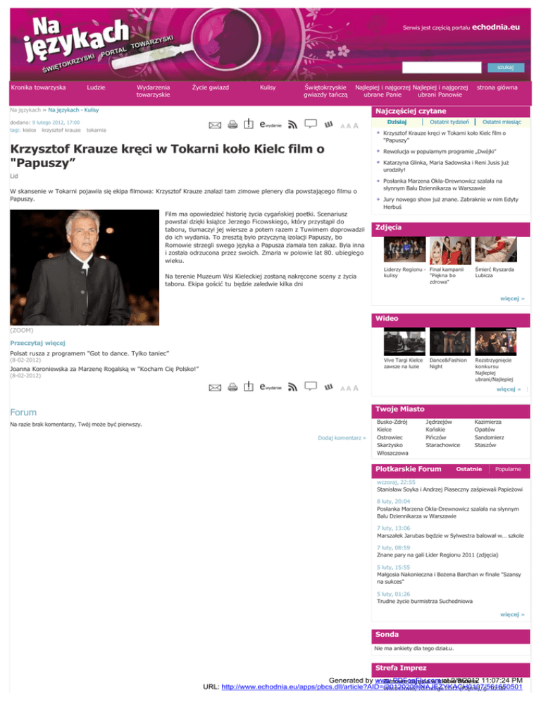 Serwis jest częścią portalu echodnia.eu szukaj Kronika towarzyska Ludzie Wydarzenia towarzyskie Życie gwiazd Kulisy Świętokrzyskie gwiazdy tańczą Najlepiej i najgorzej Najlepiej i najgorzej ubrane Panie ubrani Panowie Na językach » Na językach - Kulisy strona główna Najczęściej czytane dodano: 9 lutego 2012, 17:00 AA tagi: kielce krzysztof krauze tokarnia A Dzisiaj Ostatni tydzień Ostatni miesiąc Krzysztof Krauze kręci w Tokarni koło Kielc film o "Papuszy” Krzysztof Krauze kręci w Tokarni koło Kielc film o "Papuszy” Rewolucja w popularnym programie „Dwójki” Katarzyna Glinka, Maria Sadowska i Reni Jusis już urodziły! Lid W skansenie w Tokarni pojawiła się ekipa filmowa: Krzysztof Krauze znalazł tam zimowe plenery dla powstającego filmu o Papuszy. Film ma opowiedzieć historię życia cygańskiej poetki. Scenariusz powstał dzięki książce Jerzego Ficowskiego, który przystąpił do taboru, tłumaczył jej wiersze a potem razem z Tuwimem doprowadził do ich wydania. To zresztą było przyczyną izolacji Papuszy, bo Romowie strzegli swego języka a Papusza złamała ten zakaz. Była inna i została odrzucona przez swoich. Zmarła w połowie lat 80. ubiegłego wieku. Na terenie Muzeum Wsi Kieleckiej zostaną nakręcone sceny z życia taboru. Ekipa gościć tu będzie zaledwie kilka dni Posłanka Marzena Okła-Drewnowicz szalała na słynnym Balu Dziennikarza w Warszawie Jury nowego show już znane. Zabraknie w nim Edyty Herbuś Zdjęcia Liderzy Regionu Finał kampanii kulisy "Piękna bo zdrowa" Śmierć Ryszarda Lubicza więcej » Wideo (ZOOM) Przeczytaj więcej Polsat rusza z programem "Got to dance. Tylko taniec” Vive Targi Kielce Dance&Fashion Rozstrzygnięcie zawsze na luzie Night konkursu Najlepiej ubrani/Najlepiej (8-02-2012) Joanna Koroniewska za Marzenę Rogalską w "Kocham Cię Polsko!” (8-02-2012) AA A więcej » | Forum Twoje Miasto Na razie brak komentarzy, Twój może być pierwszy. Busko-Zdrój Kielce Ostrowiec Skarżysko Włoszczowa Dodaj komentarz » Jędrzejów Końskie Pińczów Starachowice Plotkarskie Forum Kazimierza Opatów Sandomierz Staszów Ostatnie Popularne wczoraj, 22:55 Stanisław Soyka i Andrzej Piaseczny zaśpiewali Papieżowi 8 luty, 20:04 Posłanka Marzena Okła-Drewnowicz szalała na słynnym Balu Dziennikarza w Warszawie 7 luty, 13:06 Marszałek Jarubas będzie w Sylwestra balował w… szkole 7 luty, 08:59 Znane pary na gali Lider Regionu 2011 (zdjęcia) 5 luty, 15:55 Małgosia Nakonieczna i Bożena Barchan w finale "Szansy na sukces" 5 luty, 01:26 Trudne życie burmistrza Suchedniowa więcej » Sonda Nie ma ankiety dla tego dziaŁu. Strefa Imprez Generated by www.PDFonFly.com at 2/9/2012 Zimowe zajęcia w klubie fitness 11:07:24 PM URL: http://www.echodnia.eu/apps/pbcs.dll/article?AID=/20120209/NAJEZYKACH0107/561650501 Włoszczowa, 10 Lutego 2012 (Piątek), g. 10:00 Rocznica śmierci Antoniego Hedy "Szarego" Starachowice, 10 Lutego 2012 (Piątek), g. 11:50 Piotr Wyleżoł Trio Busko-Zdrój, 10 Lutego 2012 (Piątek), g. 16:00 Król lew Jędrzejów, 10 Lutego 2012 (Piątek), g. 17:00 Przepis na miłość i Dziennik zakrapiany rumem Suchedniów, 10 Lutego 2012 (Piątek), g. 17:00 więcej » Chińczycy otwierają w Kielcach sklep za sklepem Znany szczegóły otwarcia Galerii Korona w Kielcach – wielka zabawa przez pięć dni! Chłodnie Kieleckie do likwidacji W Kielcach rozdano certyfikaty Solidna Firma 2011 Związkowcy Siarkopolu obawiają się prywatyzacji i piszą do premiera Zobacz na głównej Tagi ada milcarz bal aktor aktorka ciąża karnawał córka dyrektor andrzej piaseczny dziecko kielce koncert matka miss miss polonia moda ojciec ojciec mateusz ostrowiec poseł program serial show studniówka syn ślub śmierć tvn tvn style tvp Wszelkie prawa zastrzeżone. Media Regionalne sp. z o.o. 2001-2012 kontakt reklama redakcja Generated by www.PDFonFly.com at 2/9/2012 11:07:24 PM URL: http://www.echodnia.eu/apps/pbcs.dll/article?AID=/20120209/NAJEZYKACH0107/561650501