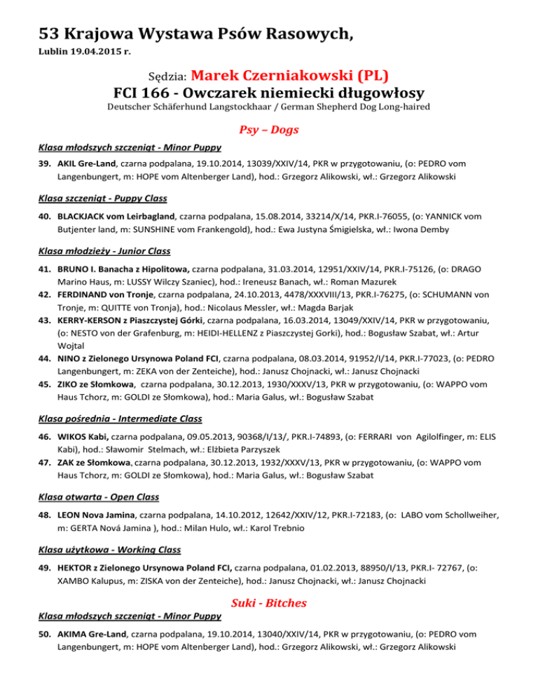 53 Krajowa Wystawa Psów Rasowych, Lublin 19.04.2015 r. Sędzia: Marek Czerniakowski (PL) FCI 166 - Owczarek niemiecki długowłosy Deutscher Schäferhund Langstockhaar / German Shepherd Dog Long-haired Psy – Dogs Klasa młodszych szczeniąt - Minor Puppy 39. AKIL Gre-Land, czarna podpalana, 19.10.2014, 13039/XXIV/14, PKR w przygotowaniu, (o: PEDRO vom Langenbungert, m: HOPE vom Altenberger Land), hod.: Grzegorz Alikowski, wł.: Grzegorz Alikowski Klasa szczeniąt - Puppy Class 40. BLACKJACK vom Leirbagland, czarna podpalana, 15.08.2014, 33214/X/14, PKR.I-76055, (o: YANNICK vom Butjenter land, m: SUNSHINE vom Frankengold), hod.: Ewa Justyna Śmigielska, wł.: Iwona Demby Klasa młodzieży - Junior Class 41. BRUNO I. Banacha z Hipolitowa, czarna podpalana, 31.03.2014, 12951/XXIV/14, PKR.I-75126, (o: DRAGO Marino Haus, m: LUSSY Wilczy Szaniec), hod.: Ireneusz Banach, wł.: Roman Mazurek 42. FERDINAND von Tronje, czarna podpalana, 24.10.2013, 4478/XXXVIII/13, PKR.I-76275, (o: SCHUMANN von Tronje, m: QUITTE von Tronja), hod.: Nicolaus Messler, wł.: Magda Barjak 43. KERRY-KERSON z Piaszczystej Górki, czarna podpalana, 16.03.2014, 13049/XXIV/14, PKR w przygotowaniu, (o: NESTO von der Grafenburg, m: HEIDI-HELLENZ z Piaszczystej Gorki), hod.: Bogusław Szabat, wł.: Artur Wojtal 44. NINO z Zielonego Ursynowa Poland FCI, czarna podpalana, 08.03.2014, 91952/I/14, PKR.I-77023, (o: PEDRO Langenbungert, m: ZEKA von der Zenteiche), hod.: Janusz Chojnacki, wł.: Janusz Chojnacki 45. ZIKO ze Słomkowa, czarna podpalana, 30.12.2013, 1930/XXXV/13, PKR w przygotowaniu, (o: WAPPO vom Haus Tchorz, m: GOLDI ze Słomkowa), hod.: Maria Galus, wł.: Bogusław Szabat Klasa pośrednia - Intermediate Class 46. WIKOS Kabi, czarna podpalana, 09.05.2013, 90368/I/13/, PKR.I-74893, (o: FERRARI von Agilolfinger, m: ELIS Kabi), hod.: Sławomir Stelmach, wł.: Elżbieta Parzyszek 47. ZAK ze Słomkowa, czarna podpalana, 30.12.2013, 1932/XXXV/13, PKR w przygotowaniu, (o: WAPPO vom Haus Tchorz, m: GOLDI ze Słomkowa), hod.: Maria Galus, wł.: Bogusław Szabat Klasa otwarta - Open Class 48. LEON Nova Jamina, czarna podpalana, 14.10.2012, 12642/XXIV/12, PKR.I-72183, (o: LABO vom Schollweiher, m: GERTA Nová Jamina ), hod.: Milan Hulo, wł.: Karol Trebnio Klasa użytkowa - Working Class 49. HEKTOR z Zielonego Ursynowa Poland FCI, czarna podpalana, 01.02.2013, 88950/I/13, PKR.I- 72767, (o: XAMBO Kalupus, m: ZISKA von der Zenteiche), hod.: Janusz Chojnacki, wł.: Janusz Chojnacki Suki - Bitches Klasa młodszych szczeniąt - Minor Puppy 50. AKIMA Gre-Land, czarna podpalana, 19.10.2014, 13040/XXIV/14, PKR w przygotowaniu, (o: PEDRO vom Langenbungert, m: HOPE vom Altenberger Land), hod.: Grzegorz Alikowski, wł.: Grzegorz Alikowski 51. CECYLIA Wolf-Gang, czarna podpalana, 20.10.2014, 92104/I/ 14, PKR w przygotowaniu, (o: YOKER vom Pendler, m: POLA Wolf-Gang), hod.: Ireneusz Kajak, wł.: Grażyna Rudasz Klasa szczeniąt - Puppy Class 52. BEATIT vom Leirbagland, czarna podpalana, 15.08.2014, 12978/XXIV/14, PKR w przygotowaniu, (o: YANNICK vom Butjenter Land, m: SUNSHINE vom Frankengold), hod.: Ewa I Gabriel Peńsko, wł.: Agnieszka Weiner 53. ELSA-ALASKA Megy's Garden, czarna podpalana, 08.09.2014, 13064/XXIV/14, PKR w przygotowaniu, (o: LEON Nová Jamina, m: APHRODITE Megy's Garden), hod.: Kazimierz Gruszka, wł.: Kazimierz Gruszka 54. PEGGY Krukolandia, czarna podpalana, 04.09.2014, 8911/XIV/14, PKR w przygotowaniu, (o: GECK z Kojca Elbikame, m: MUZA Rodiaz), hod.: Grzegorz Krukowski, wł.: Grzegorz Krukowski Klasa młodzieży - Junior Class 55. GRETEL von Tronje, czarna podpalana, 28.11.2013, 4479/XXXVIII/13, PKR.I-76276, (o: BALLACK von der Brucknerallee, m: ANUSCHKA de Jovipe), hod.: Nikolaus Meblerk, wł.: Krzysztof Krasuski 56. LUSI Kalupus, czarna podpalana, 10.05.2014, 91422/I/14, PKR.I-76245, (o: DASTY von Melachthon, m: DEGRA Kalupus), hod.: Magda Barjak & Roman Rolnik, wł.: Waldemar Łodzinski 57. NINA z Zielonego Ursynowa Poland FCI, czarna podpalana, 08.03.2014, 12928/XXIV/14, PKR.I-76731, (o: PEDRO VOM Langenbunger, m: ZEKA von der Zenteiche), hod.: Janusz Chojnacki, wł.: Roman Mazurek Klasa pośrednia - Intermediate Class 58. MIRA z Zielonego Ursynowa Poland FCI, czarna podpalana, 23.11.2013, 90281/1/13, PKR.I-74608, (o: PEDRO vom Langenbungert, m: RICKE von der Piste Trophe), hod.: Janusz Chojnacki , wł.: Beata Białobrzeska 59. QVANDA z Agiru Bohemia, czarna podpalana, 22.08.2013, 91391/I/13, PKR.I-76283, (o: LEO von der Zenteiche, m: BAFFY z Agiru Bohemia), hod.: Michał Sasak, wł.: Władysław Gładysz 60. ZULA ze Słomkowa, czarna podpalana, 30.12.2013, 1933/XXXV/13, PKR w przygotowaniu, (o: WAPPO vom Haus Tchorz, m: GOLDI ze Słomkowa), hod.: Maria Galus, wł.: Bogusław Szabat Klasa otwarta - Open Class 61. DOŚKA Mavic Poland, czarna podpalana, 05.11.2012, 12682/XXIV/12, PKR.I-73996, (o: PACCO vom Langenbungert, m: VARINA vom Farbenspiel), hod.: Adrian Dobrzański, wł.: Karol Surmacz 62. ENZIE Luberland, czarna podpalana, 24.04.2013, 12544/XXIV/13, PKR.I-74267, (o: ROKY Kabi, m: YABA vom Frankengold), hod.: Dariusz Grzesiuk, wł.: Ewa Wojciechowska 63. HOPE vom Altenberger Land, czarna podpalana, 01.01.2012, 12557/XXIV/12, PKR.I-74239, (o: CANYON von der Lars-Aus, m: QUEEN vom Muhlenblick), hod.: Norbert Schleuter, wł.: Grzegorz Alikowski 64. KAJA z Lepos (FCI), czarna podpalana, 16.06.2012, 12179/XXIV/12, PKR.I-72059, (o: Falkoen`s BAX, m: LIZA Animar), hod.: Beata Wiśniewska, wł.: Daniel Banach 65. KAJA z Zielonego Ursynowa Poland FCI, czarna podpalana, 07.05.2013, 89924/I/13, PKR.I-74165, (o: XAMBO Kalupus, m: RICKE von der Piste Trophe), hod.: Janusz Chojnacki, wł.: Janusz Chojnacki Klasa użytkowa - Working Class 66. XENA Kalupus, czarna podpalana, 24.01.2011, 85473/I/11, PKR.I-68296, (o: WEGAS vom Fichtenschlag, m: OLA Kalupus), hod.: Magda Barjak & Roman Rolnik, wł.: Marcin Smolewski Sędzia: Marek Czerniakowski (PL) FCI 166 - Owczarek niemiecki krótkowłosy Deutscher Schäferhund Stockhaar