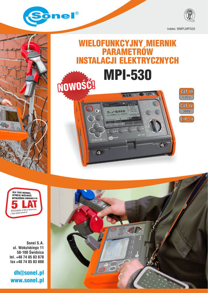Indeks: WMPLMPI530 WIELOFUNKCYJNY MIERNIK PARAMETRÓW INSTALACJI ELEKTRYCZNYCH NOWOŚĆ! Sonel S.A. ul. Wokulskiego 11 58-100 Świdnica tel. +48 74 85 83 878 fax +48 74 85 83 808 [email protected] www.sonel.pl MPI-530 MPI-530 Wielofunkcyjny miernik parametrów instalacji elektrycznych · Pomiary impedancji pętli zwarcia: ·Niskonapięciowy pomiar rezystancji połączeń ochronnych i wyrównawczych: - pomiar impedancji pętli zwarcia z rodzielczością 0,001 Ω prądem rzędu 23 A (44 A przy napięciu międzyfazowym) - rezystor zwarciowy Rzw = 10 Ω, - pomiar ciągłości przewodu ochronnego prądem ≥200 mA w dwóch kierunkach, - zakres napięć pomiarowych: 95...440 V, częstotliwości 45...65 Hz, - pomiar impedancji pętli zwarcia z rozdzielczością do 0,01 Ω, w instalacjach zabezpieczonych wyłącznikami RCD o IΔn ≥ 30 mA bez ich zadziałania, - automatyczne wyliczanie prądu zwarciowego; rozróżnianie napięcia fazowego i międzyfazowego, - pomiary przy użyciu wtyczki UNI-Schuko z przyciskiem wyzwalającym pomiar (również przy zamienionych przewodach L i N) lub przewodów o długości 1,2 m, 5 m, 10 m, 20 m z ewentualnym wykorzystaniem adapterów gniazd 3-faz. (AGT), - pomiar małym prądem z sygnalizacją akustyczną, - autokalibracja przewodów pomiarowych - możliwość stosowania przewodów dowolnej długości. ·Pomiary rezystancji uziemienia: - pomiar metodą techniczną 3 i 4-przewodową, - pomiar metodą techniczną 3-przewodową z wykorzystaniem dodatkowych cęgów, - pomiar metodą dwucęgową, z wykorzystaniem dodatkowych cęgów. ·Pomiar rezystywności gruntu metodą Wennera. - wybór zabezpieczeń instalacji oraz automatyczna ocena wyniku pomiaru. ·Pomiar natężenia oświetlenia. ·Badanie wyłączników różnicowoprądowych typu AC, A i B: ·Szybkie sprawdzanie poprawności podłączenia przewodu ochronnego PE - pomiar wyłączników zwykłych, krótkozwłocznych i selektywnych o znamionowych prądach różnicowych 10, 30, 100, 300, 500 i 1000 mA, - funkcja automatycznego pomiaru pełnego zestawu parametrów wyłącznika (po jednorazowym naciśnięciu przycisku „START” miernik wykonuje cały zaprogramowany cykl pomiarów łącznie z możliwością pomiaru impedancji pętli zwarcia L-PE prądem 15 mA), - kształt przebiegu wymuszanego prądu upływu wybierany przez użytkownika: sinusoidalny (start od zbocza narastającego lub opadającego), jednokierunkowy pulsujący (dodatni lub ujemny), jednokierunkowy pulsujący z podkładem prądu stałego (dodatni i ujemny), stały (dodatni i ujemny), za pomocą elektrody dotykowej. ·Pomiar i rejestracja napięcia, częstotliwości, prądu przemiennego, cosφ oraz mocy (czynnej, biernej, pozornej), harmonicznych napięcia i prądu do 40, współczynników THD. ·Sprawdzanie kolejności faz i obrotów silnika. ·Pamięć o strukturze drzewiastej, dynamicznie zarządzana (max. po 10000 wyników każdego rodzaju pomiaru) z możliwością opisu punktów pomiarowych, obiektów, nazw klientów. · Zasilanie z akumulatora lub baterii (opcja), wbudowana szybka ładowarka. Możliwość ładowania z sieci oraz z zapalniczki samochodowej (12 V). - pomiar prądu wyzwalania IA prądem narastającym, - pomiar czasu zadziałania tA przy prądach ½IΔn, 1IΔn, 2IΔn i 5IΔn , - pomiar napięcia dotykowego UB i rezystancji przewodu ochronnego RE bez wyzwalania wyłącznika, - wykrywanie zamiany przewodów L i N w gniazdku; nie wpływa na wykonywanie pomiarów, - możliwość pomiaru prądu zadziałania IA oraz rzeczywistego czasu zadziałania tAI przy jednym wyłączeniu RCD, - pomiary dla napięcia 95...270 V. ·Pomiary rezystancji izolacji: - napięcia pomiarowe: 50 V, 100 V, 250 V, 500 V i 1000 V, - pomiar rezystancji izolacji do 10 GΩ, - możliwość pomiaru w gnieździe za pomocą adaptera UNI-Schuko, - zabezpieczenie miernika przed obecnością napięcia na obiekcie i pojawieniem się napięcia w trakcie pomiaru, - samoczynne rozładowywanie pojemności mierzonego obiektu po zakończeniu pomiaru, - automatyczny pomiar wszystkich kombinacji rezystancji w przewodach 3-, 4i 5-żyłowych przy wykorzystaniu dodatkowego adaptera AutoISO-1000C, - akustyczne wyznaczanie pięciosekundowych odcinków czasu ułatwiające zdjęcie charakterystyk czasowych przy pomiarze rezystancji izolacji. Wyposażenie standardowe miernika MPI-530: - adapter WS-03 wyzwalający pomiar z wtykiem UNI-Schuko - przewód 1,2m żółty zakończony wtykami bananowymi - przewód 1,2m niebieski zakończony wtykami bananowymi - przewód 1,2m czerwony zakończony wtykami bananowymi - przewód 15m niebieski na szpuli zakończony wtykami bananowymi - przewód 30m czerwony na szpuli zakończony wtykami bananowymi - przewód do transmisji danych USB - sonda ostrzowa żółta z gniazdem bananowym - sonda ostrzowa czerwona z gniazdem bananowym - sonda ostrzowa niebieska z gniazdem bananowym - krokodylek żółty K02 - krokodylek czerwony K02 - sonda do wbijania w grunt (30cm) 2 szt. - futerał L2 - szelki do miernika - zasilacz ładowarki Z7 - przewód do zasilacza (230V) - przewód do ładowania z gniazda zapalniczki samochodowej - pakiet akumulatorów NiMH 4,8V 4,2Ah - program „Sonel Reader” (odczyt danych z pamięci) - certyfikat kalibracji WAADAWS03 WAPRZ1X2YEBB WAPRZ1X2BUBB WAPRZ1X2REBB WAPRZ015BUBBSZ WAPRZ030REBBSZ WAPRZUSB WASONYEOGB1 WASONREOGB1 WASONBUOGB1 WAKROYE20K02 WAKRORE20K02 WASONG30 WAFUTL2 WAPOZSZEKPL WAZASZ7 WAPRZLAD230 WAPRZLAD12SAM WAAKU07 Miernik MPI-530 umożliwia analizę parametrów zasilania, ich rejestrację oraz wizualizację na ekranie miernika ? Bezpieczeństwo elektryczne: - rodzaj izolacji podwójna, zgodnie z PN-EN 61010-1 i IEC 61557 - kategoria pomiarowa IV 300 V (III 600 V) wg PN-EN 61010-1 - stopień ochrony obudowy wg PN-EN 60529 IP54 Pozostałe dane techniczne: - zasilanie miernika akumulator Ni-MH lub baterie alkaliczne LR14 (4 szt.) (opcja) - wymiary 288 x 223 x 75 mm - masa miernika ok. 2,2 kg Wyposażenie dodatkowe mier