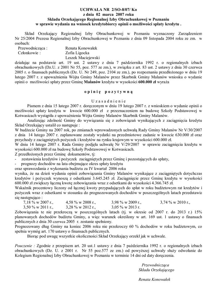 UCHWAŁA NR 2/SO-8/07/ Ko z dnia 02 marca 2007 roku Składu Orzekającego Regionalnej Izby Obrachunkowej w Poznaniu w sprawie wydania na wniosek kredytobiorcy opinii o możliwości spłaty kredytu . Skład Orzekający Regionalnej Izby Obrachunkowej w Poznaniu wyznaczony Zarządzeniem Nr 25/2004 Prezesa Regionalnej Izby Obrachunkowej w Poznaniu z dnia 09 listopada 2004 roku ze zm. w osobach: Przewodnicząca : Renata Konowałek Członkowie : Zofia Ligocka Leszek Maciejewski działając na podstawie art. 19 ust. 2 ustawy z dnia 7 października 1992 r. o regionalnych izbach obrachunkowych (Dz.U. z 2001 Nr 55, poz. 577 ze zm.), w związku z art. 83 ust. 2 ustawy z dnia 30 czerwca 2005 r. o finansach publicznych (Dz. U. Nr 249, poz. 2104 ze zm.), po rozpoznaniu przedłożonego w dniu 19 lutego 2007 r. z upoważnienia Wójta Gminy Malanów przez Skarbnik Gminy Malanów wniosku o wydanie opinii o możliwości spłaty przez Gminę Malanów kredytu w wysokości 600.000 zł wyraża opinię pozytywną Uzasadnienie Pismem z dnia 15 lutego 2007 r. doręczonym w dniu 19 lutego 2007 r. z wnioskiem o wydanie opinii o możliwości spłaty kredytu w kwocie 600.000 zł z przeznaczeniem na budowę Szkoły Podstawowej w Kotwasicach wystąpiła z upoważnienia Wójta Gminy Malanów Skarbnik Gminy Malanów. Analizując zdolność Gminy do wywiązania się z zobowiązań wynikających z zaciągnięcia kredytu Skład Orzekający ustalił co następuje : W budżecie Gminy na 2007 rok, po zmianach wprowadzonych uchwałą Rady Gminy Malanów Nr V/30/2007 z dnia 14 lutego 2007 r. zaplanowane zostały wydatki na przedmiotowe zadanie w kwocie 630.000 zł oraz przychody z zaciągniętych pożyczek i kredytów na rynku krajowym w wysokości 600.000 zł. W dniu 14 lutego 2007 r. Rada Gminy podjęła uchwałę Nr V/29/2007 w sprawie zaciągnięcia kredytu w wysokości 600.000 zł na budowę Szkoły Podstawowej w Kotwasicach. Z przedłożonych przez Gminę dokumentów, tj: - zestawienia kredytów i pożyczek zaciągniętych przez Gminę i pozostających do spłaty, - prognozy dochodów na lata obejmujące okres spłaty kredytu oraz sprawozdania z wykonania budżetu za IV kwartał 2006 roku wynika, że na dzień wydania opinii zobowiązania Gminy Malanów wynikające z zaciągniętych dotychczas kredytów i pożyczek wynoszą z odsetkami 3.645.245 zł. Zaciągnięcie przez Gminę kredytu w wysokości 600.000 zł zwiększy łączną kwotę zobowiązania wraz z odsetkami do wysokości 4.366.745 zł. Wskaźnik procentowy liczony od łącznej kwoty przypadających do spłat w roku budżetowym rat kredytów i pożyczek wraz z odsetkami w stosunku do prognozowanych dochodów w poszczególnych latach przedstawia się następująco : 7,18 % w 2007 r., 4,58 % w 2008 r., 3,98 % w 2009 r., 3,74 % w 2010 r., 3,50 % w 2011 r., 3,28 % w 2012 r., 3,05 % w 2013 r. Zobowiązania te nie przekroczą w poszczególnych latach (tj. w okresie od 2007 r. do 2013 r.) 15% planowanych dochodów budżetu Gminy, a więc warunek określony w art. 169 ust. 1 ustawy o finansach publicznych z dnia 30 czerwca 2005 r. zostanie spełniony. Prognozowany dług Gminy na koniec 2006 roku nie przekroczy 60 % dochodów w roku budżetowym, co spełnia wymóg art. 170 ustawy o finansach publicznych. Biorąc pod uwagę wszystkie okoliczności Skład Orzekający orzekł jak w uchwale. Pouczenie : Zgodnie z przepisem art. 20 ust.1 ustawy z dnia 7 października 1992 r. o regionalnych izbach obrachunkowych (Dz. U. z 2001 r. Nr 55 poz.577 ze zm.) od powyższej uchwały służy odwołanie do Kolegium Regionalnej Izby Obrachunkowej w Poznaniu w terminie 14 dni od daty doręczenia. Przewodnicząca Składu Orzekającego Renata Konowałek