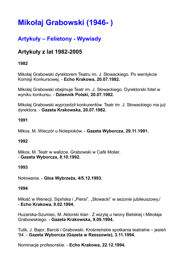 Mikołaj Grabowski (1946- ) Artykuły – Felietony - Wywiady Artykuły z lat 1982-2005 1982 Mikołaj Grabowski dyrektorem Teatru im. J. Słowackiego. Po werdykcie Komisji Konkursowej. - Echo Krakowa, 20.07.1982. Mikołaj Grabowski obejmuje Teatr im. J. Słowackiego. Dyrektorski fotel w wyniku konkursu. - Dziennik Polski, 20.07.1982. Mikołaj Grabowski wyprzedził konkurentów. Teatr im. J. Słowackiego ma już dyrektora. - Gazeta Krakowska, 20.07.1982. 1991 Mikos, M. Wieczór u Nolepioków. - Gazeta Wyborcza, 29.11.1991. 1992 Mikos, M. Teatr w walizce. Grabowski w Café Molier. - Gazeta Wyborcza, 8.10.1992. 1993 Notowania. - Głos Wybrzeża, 4/5.12.1993. 1994 Miłość w Wenecji, Sipińska i „Piersi”. „Słowacki” w sezonie jubileuszowy,/ - Echo Krakowa, 9.02.1994. Huzarska-Szumiec, M. Aktorski klan : Z wizytą u Iwony Bielskiej i Mikołaja Grabowskiego. - Gazeta Krakowska, 9.09.1994. Tulik, J. Bajor, Barciś i Grabowski. Krośnieńskie spotkania teatralne – jesień '94. - Gazeta Wyborcza (Gazeta w Rzeszowie), 3.11.1994. Nominacje profesorskie. - Echo Krakowa, 22.12.1994. 1995 Lista nieobecności usprawiedliwionych. Sopot. Przyjechały krakusy. - Gazeta Wyborcza (Gazeta Morska), 13.06.1995. 1996 Kowalczyk, J. R. Chodzenie po krawędzi. - Rzeczpospolita (tele), 11/17.05.1996. 1997 Okulicka, J. Iwona Bielska i Mikołaj Grabowski: w ciągu paru sekund odmienił się nam świat... - Życie Na Gorąco, 9.01.1997. Bajka, A. Grabowscy górą. Raut aktorów. Rozdano Złote Maski. - Gazeta Wyborcza (Gazeta w Krakowie), 24.03.1997. Reżyser i... ...aktorka. - Gazeta Wyborcza (Gazeta Łódzka), 27.10.1997. 1998 Ziemianin, M. Mieszkanie z biglem. - Gazeta Krakowska (Magazyn Piątek), 2.01.1998. Dni Klanu Grabowskich. Wiosenne spotkania w Andrychowie. - Rzeczpospolita, 28.04.1998. Aktualności z życia uczelni. Państwowa Wyższa Szkoła Teatralna. - Dziennik Polski, 6.07.1998. Prorok Ilia przed karierą. Studenci pod wodzą Mikołaja Grabowskiego. - Gazeta Krakowska, 21/22.11.1998. 1999 Mikołaj Grabowski. - Polityka, 31.07.1999. Romanowski, G. Słobodzianek na etacie. Łódź. Plany Mikołaja Grabowskiego w Teatrze Nowym. - Rzeczpospolita, 4/5.09.1999. 2000 Obyczaje po Grabowskiemu. - Gazeta Krakowska, 22.02.2000. Piech, A. Wilk, I. Wielkanocne kręcenie. Teatr Telewizji. Widowisko Mikołaja Grabowskiego. - Gazeta Wyborcza, 21.04.2000. 2001 Górski, K. Czy przyjedzie Brook? Skończył się Festiwal Szekspirowski w Gdańsku. - Gazeta Wyborcza, 14/15.08.2001. Czapska, I. N. Kraków w Buffo. Mikołaj Grabowski i jego teatr. - Życie Warszawy, 28.09.2001. Grabowscy. - Dziennik Polski, 6.12.2001. Malatyńska-Stankiewicz, A. Wybrany Mikołaj Grabowski. Nowy dyrektor artystyczny Starego Teatru. - Dziennik Polski, 22.12.2001. 2002 Mikołaj Grabowski dyrektorem „Starego”. Minister podpisał nominację. - Dziennik Polski, 2.01.2002. Grabowski nominowany. - Gazeta Wyborcza, 3.01.2002. Grabowski w Starym Teatrze. - Rzeczpospolita, 9.01.2002. Waga Starego Teatru. Mikołaj Grabowski odebrał nominację na stanowisko dyrektora artystycznego. - 10.01.2002. Grabowski nominowany. Dyrektor Starego Teatru od 1 września. - Gazeta Krakowska, 10.01.2002. Jurasz, W. Grabowski jako tragarz puchu. - Życie, 11.01.2002. Jurasz, W. Mleczko niczym Dostojewski. Nowy sezon w Starym Teatrze. - Gazeta Krakowska, 27.09.2002. „Stary” z nowym dyrektorem. Pierwsza konferencja Mikołaja Grabowskiego. - Dziennik Polski, 27.09.2002. Imiona dla dzielnic. - Gazeta Krakowska, 15.11.2002. Minister w teatrze. Spotkanie z Waldemarem Dąbrowskim. - Gazeta Krakowska, 19.11.2002. Huzarska-Szumiec, M. Jurasz, W. Twarda ręka dyrektora. - Gazeta Krakowska, 13.12.2002. 2003 Kossowska-Banasik, E. Chłopcy z Alwerni. To nie jest film o mnie – zapewnia Mikołaj Grabowski. - Gazeta Krakowska, 26/27.07.2003. Dwie nominacje. - Dziennik Polski, 29.08.2003. Monopol Grabowskiego. Zmiany w kierownictwie Starego Teatru. - Gazeta Krakowska, 29.08.2003. Mikołaj Grabowski, dyrektor Narodowego Starego Teatru. - Gazeta Wyborcza, 15.09.2003. Bartosik, M. Świat braci Grabowskich. Witkor, Mikołaj i Andrzej z Alwerni. - Gazeta Krakowska, 24/26.12.2003. [skan] 2005 Przemontowane jak film. Stary Teatr. Kabarety od nowa. - Gazeta Wyborcza, 14.01.2005. Jurasz, W. Stary Teatr zastanawia się nad kulturową tożsamością płci i... Czeka na Putina. - Gazeta Krakowska, 22/23.01.2005. W roli kardynała. - Dziennik Polski, 16.09.2005. Zapotoczny, A. Wielkie przeżycie. - Dziennik Polski, 19.11.2005. 2006 Molier Grabowskiego. W Starym Teatrze „Tartuffe”. - Gazeta Wyborcza (Co jest grane Kraków), 9/15.06.2006. 2007 Huzarska-Szumiec, M. Re_wizje antyczne. Starożytny projekt w krakowskim Starym Teatrze. Arystofanes. Sofokles. Kochanowski. - Gazeta Krakowska, 3.01.2007. Mikołaj Grabowski. Kto jest Kim w Krakowie. - Dziennik Polski, 1.04.2007. 2009 Bogusław Schaeffer, Najniezwyklejszy polski kompozytor, pianista, muzykolog, dramaturg i tak dalej, i tak dalej... - Przekrój, 4.06.2009. [razem z wywiadem z tego dnia] 2010 Derkaczew, J. Polska, która nie jest najważniejsza. - Gazeta Wyborcza, 23.12.2010. 2012 Ciosek, J. Stary Teatr z dyrektorem Mikołajem Grabowskim czy bez? - Dziennik Polski, 7/8.04.2012. Ciosek, J. Stary Teatr z dyrektorem Mikołajem Grabowskim czy bez? - Dziennik Polski, 7/8.042012. Drewniak, Ł. Argentyńska przygoda. - Dziennik, 2012. Felietony z lat 1992-1987 1992 Grabowski, M. Mój kulturalny Kraków. - Gazeta Wyborcza, 15.08.1992. 1995 Grabowski, M. Nie bójmy się klasyki. - Teatr nr 5, maj 1995. Wywiady z lat 1982-2013 1982 „Sens teatru polega dla mnie na tym czy to co w nim pokazujemy staje się tematem rozmowy”. - Echo Krakowa, 21/22.07.19982. 1983 Otałęga, Z. Ciągle ten sam spektakl – polskość i Polacy. - Gazeta Krakowska, 25/26.06.1983. Miejsce święte czy przeklęte... - Dziennik Polski, 12/13.11.1983. 1985 Stankiewiczówna, T. L. Nieufność i odpowiedzialność. Tożsamość młodych twórców : [wywiad]. -
