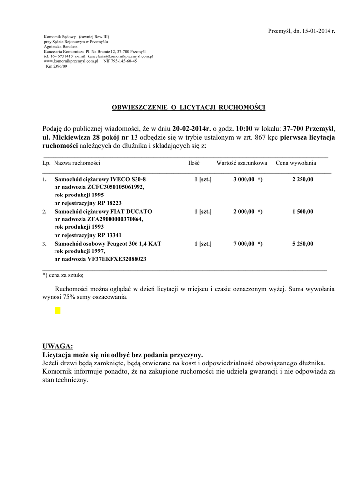Przemyśl, dn. 15-01-2014 r. Komornik Sądowy (dawniej Rew.III) przy Sądzie Rejonowym w Przemyślu Agnieszka Bandosz Kancelaria Komornicza Pl. Na Bramie 12, 37-700 Przemyśl tel. 16 - 6751413 e-mail: [email protected] www.komornikprzemysl.com.pl NIP 795-145-60-45 Km 2396/09 OBWIESZCZENIE O LICYTACJI RUCHOMOŚCI Podaję do publicznej wiadomości, że w dniu 20-02-2014r. o godz. 10:00 w lokalu: 37-700 Przemyśl, ul. Mickiewicza 28 pokój nr 13 odbędzie się w trybie ustalonym w art. 867 kpc pierwsza licytacja ruchomości należących do dłużnika i składających się z: _______________________________________________________________________________________________________________________ Lp. Nazwa ruchomości Ilość Wartość szacunkowa Cena wywołania _________________________________________________________________________________________________________________________ 1. 2. 3. Samochód ciężarowy IVECO S30-8 nr nadwozia ZCFC3050105061992, rok produkcji 1995 nr rejestracyjny RP 18223 Samochód ciężarowy FIAT DUCATO nr nadwozia ZFA29000000370864, rok produkcji 1993 nr rejestracyjny RP 13341 Samochód osobowy Peugeot 306 1,4 KAT rok produkcji 1997, nr nadwozia VF37EKFXE32088023 1 [szt.] 3 000,00 *) 2 250,00 1 [szt.] 2 000,00 *) 1 500,00 1 [szt.] 7 000,00 *) 5 250,00 _______________________________________________________________________________________________________________________ *) cena za sztukę Ruchomości można oglądać w dzień licytacji w miejscu i czasie oznaczonym wyżej. Suma wywołania wynosi 75% sumy oszacowania. UWAGA: Licytacja może się nie odbyć bez podania przyczyny. Jeżeli drzwi będą zamknięte, będą otwierane na koszt i odpowiedzialność obowiązanego dłużnika. Komornik informuje ponadto, że na zakupione ruchomości nie udziela gwarancji i nie odpowiada za stan techniczny.