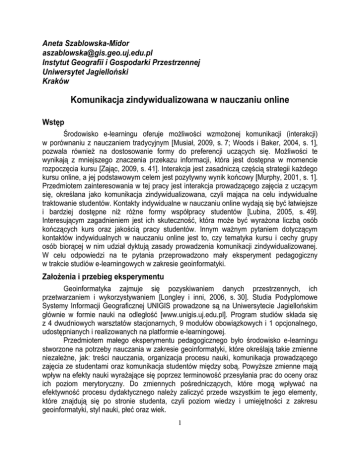 Aneta Szablowska-Midor [email protected] Instytut Geografii i Gospodarki Przestrzennej Uniwersytet Jagielloński Kraków Komunikacja zindywidualizowana w nauczaniu online Wstęp Środowisko e-learningu oferuje możliwości wzmożonej komunikacji (interakcji) w porównaniu z nauczaniem tradycyjnym [Musiał, 2009, s. 7; Woods i Baker, 2004, s. 1], pozwala również na dostosowanie formy do preferencji uczących się. Możliwości te wynikają z mniejszego znaczenia przekazu informacji, która jest dostępna w momencie rozpoczęcia kursu [Zając, 2009, s. 41]. Interakcja jest zasadniczą częścią strategii każdego kursu online, a jej podstawowym celem jest pozytywny wynik końcowy [Murphy, 2001, s. 1]. Przedmiotem zainteresowania w tej pracy jest interakcja prowadzącego zajęcia z uczącym się, określana jako komunikacja zindywidualizowana, czyli mająca na celu indywidualne traktowanie studentów. Kontakty indywidualne w nauczaniu online wydają się być łatwiejsze i bardziej dostępne niż różne formy współpracy studentów [Lubina, 2005, s. 49]. Interesującym zagadnieniem jest ich skuteczność, która może być wyrażona liczbą osób kończących kurs oraz jakością pracy studentów. Innym ważnym pytaniem dotyczącym kontaktów indywidualnych w nauczaniu online jest to, czy tematyka kursu i cechy grupy osób biorącej w nim udział dyktują zasady prowadzenia komunikacji zindywidualizowanej. W celu odpowiedzi na te pytania przeprowadzono mały eksperyment pedagogiczny w trakcie studiów e-learningowych w zakresie geoinformatyki. Założenia i przebieg eksperymentu Geoinformatyka zajmuje się pozyskiwaniem danych przestrzennych, ich przetwarzaniem i wykorzystywaniem [Longley i inni, 2006, s. 30]. Studia Podyplomowe Systemy Informacji Geograficznej UNIGIS prowadzone są na Uniwersytecie Jagiellońskim głównie w formie nauki na odległość [www.unigis.uj.edu.pl]. Program studiów składa się z 4 dwudniowych warsztatów stacjonarnych, 9 modułów obowiązkowych i 1 opcjonalnego, udostępnianych i realizowanych na platformie e-learningowej. Przedmiotem małego eksperymentu pedagogicznego było środowisko e-learningu stworzone na potrzeby nauczania w zakresie geoinformatyki, które określają takie zmienne niezależne, jak: treści nauczania, organizacja procesu nauki, komunikacja prowadzącego zajęcia ze studentami oraz komunikacja studentów między sobą. Powyższe zmienne mają wpływ na efekty nauki wyrażające się poprzez terminowość przesyłania prac do oceny oraz ich poziom merytoryczny. Do zmiennych pośredniczących, które mogą wpływać na efektywność procesu dydaktycznego należy zaliczyć przede wszystkim te jego elementy, które znajdują się po stronie studenta, czyli poziom wiedzy i umiejętności z zakresu geoinformatyki, styl nauki, płeć oraz wiek. 1 W trakcie eksperymentu postawiono następującą hipotezę: zapobieganie powstaniu luk i zaległości w przygotowywaniu zaliczeń oraz systematyczne wykrywanie i likwidowanie opóźnień, pozwala skuteczniej ograniczać rozmiary porażki edukacyjnej w zakresie nauczania systemów informacji geograficznej na odległość, aniżeli praca dydaktyczna, w której wymienione zabiegi nie występują. Porażka edukacyjna w pracy definiowana jest jako sytuacja, w której student nie spełnia wymagań przewidzianych w programie studiów. W module 1. „Wstęp do geoinformatyki”, który był przedmiotem badań eksperymentalnych, przewidziano 4 prace pisemne, które podlegają ocenie i stanowią o zaliczeniu modułu. Brak pracy zaliczeniowej lub przesłanie pracy, która otrzymała ocenę niedostateczną traktowano jako porażkę edukacyjną. W celu zweryfikowania powyższej hipotezy manipulowano jedną z powyższych zmiennych niezależnych – komunikacją prowadzącej zajęcia ze studentami. Może ona mieć charakter zbiorowy lub indywidualny. Komunikacja zbiorowa ma miejsce wówczas, gdy prowadząca zajęcia komunikuje się jednocześnie z całą grupą. Komunikacja indywidualna to komunikacja prowadzącej zajęcia z pojedynczym studentem. W badaniu eksperymentalnym zastosowano technikę grup równoległych, która zakłada wyodrębnienie spośród badanej grupy dwóch grup – eksperymentalnej i kontrolnej podobnych pod względem poziomu wiedzy, płci oraz wieku. Grupy dobrano spośród studentów studiów UNIGIS rocznika 2010. 48 studentów podzielono losowo na dwie grupy po 24 osoby na podstawie uśrednionego wyniku dwóch testów wiedzy. Obie grupy posiadały identyczną strukturę płci ze zdecydowaną przewagą mężczyzn (71%). W obu grupach występowała taka sama dominująca liczba osób w wieku do 30 lat (75%). Eksperyment został przeprowadzony w ciągu 10 tygodni od lutego do kwietnia 2010 roku przez osobę uczącą przedmiotu „Wstęp do geoinformatyki”. W obydwu grupach uruchomiono następujące zmienne niezależne: treści nauczania, organizacja procesu nauki, komunikacja prowadzącej zajęcia ze studentami oraz komunikacja studentów między sobą. W przypadku zmiennej niezależnej – komunikacja prowadzącej ze studentami – w obydwu grupach miała miejsce komunikacja zbiorowa, natomiast jedynie w grupie eksperymentalnej prowadząca zajęcia kontaktowała się ze studentami również indywidualnie. Komunikacja zbiorowa odbywała się za pomocą forów dyskusyjnych oraz poczty elektronicznej (e-mail), natomiast komunikacja indywidualna jedynie za pomocą poczty e-mail. Studenci należący do grupy eksperymentalnej otrzymywali od prowadzącej indywidualne wiadomości związane bezpośrednio z zaliczeniami przewidzianymi w module. Na 2 do 4 dni przed terminem nadesłania zaliczenia 1. i 2. studenci grupy eksperymentalnej otrzymywali wiadomość z zapytaniem o stan prac nad zaliczeniem, zachęcającą do kontaktu w przypadku napotykania problemów. W przypadku zaliczenia 3. i 4. przeprowadzająca eksperyment zmieniła taktykę i zapytania e-mailowe dotyczące tych zaliczeń przesyła