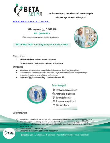 Szukasz nowych doświadczeń zawodowych i chcesz być lepsza od innych? www.beta-aktiv.com/pl Oferta pracy Nr P 2015 018 PIELĘGNIARKA Z darmowym zakwaterowaniem i wyżywieniem BETA aktiv GbR- stała i legalna praca w Niemczech Miejsce pracy: Niewielki dom opieki - praca zmianowa Zakwaterowanie i wyżywienie zapewnia pracodawca Wymagania: wykształcenie kierunkowe: pielęgniarka dyplomowana (lub licencjat/magister) samodzielność i odpowiedzialność związana z wykonywaniem zawodu pielęgniarskiego gotowość do wyjazdu za granicę na minimum rok znajomość języka niemieckiego: poziom minimum A2 Opis stanowiska: pielęgnacja i opieka nad pacjentami oraz sporządzanie dokumentacji o wykonanej pielęgnacji doradztwo i pomoc wobec pacjenta opieka i doradztwo wobec bliskich pielęgnowanego pacjenta samodzielne i odpowiedzialne wykonywanie obowiązków według obowiązujących zasad nauki opieki medycznej monitorowanie, podawanie leków współpraca z lekarzami i personelem medycznym Beta aktiv GbR | E. Sobiech, A. M. Schimizek | Paul-Hartmann-Str. 61 | 89522 Heidenheim Oferujemy: umowę o pracę bezpośrednio z niemieckim pracodawcą na niemieckich warunkach, pełny pakiet socjalny (ubezpieczenie zdrowotne, emerytalne, od wypadków przy pracy) zatrudnienie na 100% etatu zakwaterowanie w pokoju pracowniczym – darmowe wyżywienie - darmowe dodatkowe wynagrodzenie za pracę w nocy, niedziele oraz dni świąteczne okres wprowadzenia w zakres obowiązków 28 dni roboczych urlopu dobry klimat w miejscu pracy wynagrodzenie do nostryfikacji: 1.800 euro brutto + dodatki wynagrodzenie po nostryfikacji: 2.300 euro brutto + dodatki polskojęzyczną osobistą obsługę podczas podejmowania pracy w Niemczech pomoc w procesach rejestracyjnych wymaganych w Niemczech. przeprowadzamy uznanie dyplomu Jak z sukcesem i bez ryzyka podjąć się tej pracy? Skontaktuj się z naszym przedstawicielem w Polsce pod numer 505 123 391. Po pozytywnym przejściu pierwszej rozmowy kwalifikacyjnej: wypełnij otrzymany formularz. W ciągu 5 dni roboczych zgłosimy się do Ciebie telefonicznie. Zaprosimy Cię na 2 dni próbnej pracy u Twojego przyszłego pracodawcy. Podpiszesz umowę o pracę bezpośrednio z niemieckim pracodawcą. Bądźmy partnerami. Przyłącz się do grupy pielęgniarek, które skorzystały już z naszej oferty pracy Prosimy o przesłanie wstępnej aplikacji na adres: [email protected] Zapraszamy do kontaktu telefonicznego na numer 0048 505 123 391 Erreichen Sie zusammen mit uns schnell und effektiv Ihre Ziele. Paul-Hartmann-Straße 61 89522 Heidenheim Tel.: +49 (7321) 315 047 Oferujemy zatrudnienie dyplomowanym pielęgniarkom i pielęgniarzom w Niemczech. Dysponujemy miejscami pracy w wielu miejscowościach. Beta aktiv GbR | E. Sobiech, A. M. Schimizek | Paul-Hartmann-Str. 61 | 89522 Heidenheim