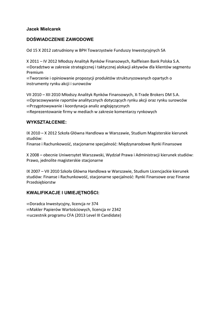 Jacek Mielcarek DOŚWIADCZENIE ZAWODOWE Od 15 X 2012 zatrudniony w BPH Towarzystwie Funduszy Inwestycyjnych SA X 2011 – IV 2012 Młodszy Analityk Rynków Finansowych, Raiffeisen Bank Polska S.A. • Doradztwo w zakresie strategicznej i taktycznej alokacji aktywów dla klientów segmentu Premium • Tworzenie i opiniowanie propozycji produktów strukturyzowanych opartych o instrumenty rynku akcji i surowców VII 2010 – XII 2010 Młodszy Analityk Rynków Finansowych, X-Trade Brokers DM S.A. • Opracowywanie raportów analitycznych dotyczących rynku akcji oraz rynku surowców • Przygotowywanie i koordynacja analiz anglojęzycznych • Reprezentowanie firmy w mediach w zakresie komentarzy rynkowych WYKSZTAŁCENIE: IX 2010 – X 2012 Szkoła Główna Handlowa w Warszawie, Studium Magisterskie kierunek studiów: Finanse i Rachunkowość, stacjonarne specjalność: Międzynarodowe Rynki Finansowe X 2008 – obecnie Uniwersytet Warszawski, Wydział Prawa i Administracji kierunek studiów: Prawo, jednolite magisterskie stacjonarne IX 2007 – VII 2010 Szkoła Główna Handlowa w Warszawie, Studium Licencjackie kierunek studiów: Finanse i Rachunkowość, stacjonarne specjalność: Rynki Finansowe oraz Finanse Przedsiębiorstw KWALIFIKACJE I UMIEJĘTNOŚCI: • Doradca Inwestycyjny, licencja nr 374 • Makler Papierów Wartościowych, licencja nr 2342 • uczestnik programu CFA (2013 Level III Candidate)