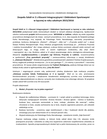 Sprawozdanie merytoryczne z działalności ekologicznej Zespołu Szkół nr 2 z Klasami Integracyjnymi i Oddziałami Sportowymi w Łęcznej w roku szkolnym 2015/2016 Zespół Szkół nr 2 z Klasami Integracyjnymi i Oddziałami Sportowymi w Łęcznej w roku szkolnym 2015/2016 podejmował wiele różnorodnych działań w ramach edukacji ekologicznej. Społeczność szkolna realizowała projekt dofinansowany przez WFOSiGW w Lublinie, odbyło się wiele wyjazdów przyrodniczo-ekologicznych do miejsc cennych przyrodniczo, m.in. dwa wyjazdy do Świętokrzyskiego Parku Narodowego, trzy wyjazdy do Poleskiego Parku Narodowego, warsztaty przyrodnicze, prelekcje, konkursy ekologiczne „Ekotest”, „Olimpus”, „Mój Las” i „Przyroda wokół nas” z okazji Święta Polskiej Niezapominajki. Klasy młodsze przygotowały inscenizację pt.: „Królewna Przyroda i siedmiu krasnoludków” dla I etapu edukacji, podczas której uczniowie usłyszeli wiele cennych rad dotyczących tego, co mogą zrobić w swoim najbliższym środowisku, aby ulżyć Ziemi i zaprzyjaźnić się z nią. Braliśmy udział w VI edycji powiatowego alertu ekologiczno-zdrowotnego. Aktywnie współpracowaliśmy z zarządem Ligi Ochrony Przyrody w Lublinie. Uczestniczyliśmy w spotkaniach „Przy pomnikach przyrody” i zamieszczaliśmy informacje o swojej działalności w „Zielonym Biuletynie”. Wielokrotnie gościliśmy przedstawicieli Lubelskich Parków Krajobrazowych, którzy wygłaszali prelekcje tematyczne: „Co to jest geologia ?”, „Co wiemy o pszczołach” i warsztaty przyrodnicze. W naszej szkole zorganizowany był Tydzień Ekologiczny, podczas którego dzieci po raz kolejny brały udział w ogólnopolskiej akcji „Listy dla Ziemi”. Istotnym i angażującym prawie całą społeczność szkolną działaniem była realizacja projektu „Edukacja uczniów Szkoły Podstawowej nr 4 w Łęcznej". Miał on na celu promowanie bioróżnorodności przyrody i zwiększenie świadomości ekologicznej uczniów oraz kształtowanie postawy odpowiedzialności za obecny i przyszły stan środowiska oraz własnego zdrowia. W projekcie wzięło udział 420 uczniów oraz 30 nauczycieli. Projekt obejmował: 1. Moduł „Przyroda i my to jeden organizm” Realizowane działania: Wyjazd do nadleśnictwa Milejów - uczniowie kl. I wzięli udział w prelekcji leśniczego, która dotyczyła następujących tematów: drzewa liściaste i drzewa iglaste - różnica w budowie, budowa lasu, zwierzęta zamieszkałe w lesie, rodzaje „domków dla zwierząt”, rośliny chronione w lesie, zasady zachowania się w lesie, stopnie zagrożenia pożarem, jak człowiek oddziałuje na las. Budowa karmnika - uczestnicy zajęć świetlicowych z klas I budowali domki dla ptaków, omawiając przy tym dokarmianie ich w różnych porach roku. Wyjazd edukacyjny do Poleskiego Parku Narodowego - zwiedzanie ścieżki „Dąb Dominik”. Poprzez realizację całego modułu, w którym brały udział dzieci klas I-III, ukazano ścisłe powiązanie przyrody i człowieka za sobą oraz wyjaśniono zależności współistnienia człowieka ze środowiskiem. Sposób przeprowadzonych działań był w pełni dostosowany do uczniów, przez co 1 w przyjazny i prosty sposób mogły przyswoić wiedzę, poznać zasoby oraz sposoby ochrony przyrody w najbliższym otoczeniu. Uczestnicy poszerzyli umiejętności prowadzenia i dokumentowania obserwacji za pomocą lupy, mikroskopu, mapy. Utrwalanie wiedzy odbywało się poprzez zabawę i turnieje ramach zajęć świetlicowych. Uczniowie zwiększyli wiedzę z zakresu przyrody, ukształtowana została też ich właściwa postawa przyrodnicza oraz wrażliwość na otaczającą nas przyrodę. 2. Moduł „Segregacja odpadów i recykling jako styl życia proekologiczny” Realizowane działania: Wizyta w PGKiM Łęczna w sortowni śmieci - w Zakładzie Utylizacji Odpadów i Oczyszczalni Ścieków mieszczącym się w Starej Wsi k /Łęcznej. Uczestnicy zostali oprowadzeni po sortowni śmieci z omówieniem poszczególnych stanowisk pracy oraz zasad ich funkcjonowania. Sortowanie śmieci i ich oznaczenie. Do sali świetlicowej zostały zakupione pojemniki ze specjalnymi oznaczeniami na makulaturę i butelki pet. W ramach tego działania przeprowadzono zbiórkę makulatury i butelek plastikowych, w której udział wzięły klasy I-III. Cykliczne prelekcje. Uczniowie uzyskali wiedzę na temat zasad prawidłowej segregacji odpadów oraz znaczenia recyklingu. W dalszym ciągu kształtowano wrażliwość na problemy środowiska, zdolność jego obserwacji oraz chęć działania na rzecz jego poprawy. W szkole systematycznie prowadzona była zbiórka zużytych baterii, tonerów i nakrętek plastikowych. 3. Moduł „ Ekologiczne ABC” Realizowane działania: Test wiedzy ekologiczno-przyrodniczej dla klas II-VI o tytuł „Najlepszego przyrodnika”. Konkurs „Mój pierwszy zielnik” dla uczniów klas IV. Jego podsumowanie odbyło się w Dniu Ziemi, tj. 22 kwietnia 2016r., w połączeniu z prelekcją „Wielkie prace małej pszczoły” przygotowaną przez pracowników Zespołu Lubelskich Parków Krajobrazowych w Lublinie. Konkurs plastyczny dla klas I-VI pod hasłem Dnia Ziemi 2016 „Palący temat - niska emisja!”. Organizowane konkursy zaktywizowały uczniów do utrwalenia i pogłębienia wiadomości przyrodniczo-ekologicznych oraz były okazją do zaprezentowania swojej wiedzy i umiejętności w zdrowej rywalizacji międzyklasowej. 4. Moduł „ Tropem form ochrony przyrody” Realizowane działania: Wycieczka do Zamościa i Roztoczańskiego Parku Narodowego dla 45-osobowej grupy uczniów z klasy IIIB i klas IV-VI szczególnie zainteresowanych przyrodą, w tym należących do szkolnego koła LOP. Uczniowie poznali walory kolejnego parku narodowego położonego na Lubelszczyźnie. Mieli okazję poznać zwierzęta z wielu regionów świata zwiedzając ZOO w Zamościu. 2 5. Moduł „ Poznajemy świat przez zabawę i doświadczenia