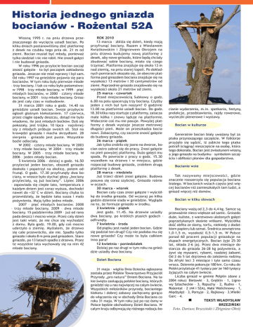Historia jednego gniazda bocianów - Rożental 52A Wiosną 1995 r. na pniu drzewa przeznaczonego do wycięcia usiadł bocian. Po kilku dniach postanowiliśmy zbić platformę z desek na czubku tego pnia ok. 21 m od ziemi. Bocian musiał być młody, ponieważ tylko siedział i nic nie robił. Nie znosił gałęzi i nie budował gniazda. W roku 1996 po przylocie bocian zaczął znosić gałęzie – to był początek zakładania gniazda. Jeszcze nie miał wprawy i był sam. Od roku 1997 na gnieździe pojawia się para bocianów. W tym roku były pierwsze młode – trzy bociany. I tak co roku było potomstwo: w 1998 – trzy młode bociany, w 1999 – pięć młodych bocianów, w 2000 – cztery młode bociany, w 2001 – trzy młode bociany. Gniazdo jest cały czas w rozbudowie. 31 marca 2001 roku o godz. 14.40 na gnieździe usiadł bocian. Swoje przybycie ogłosił głośnym klekotaniem. 17 czerwca, przez ciągłe opady deszczu, dotąd nie było wiadomo, ile jest młodych boćków. Dziś się pokazały, jest trójka. 10 lipca – najsilniejszy z młodych próbuje swoich sił. Stoi na krawędzi gniazda i macha skrzydłami. 28 sierpnia – gniazdo jest puste. Wszystkie boćki odleciały. W 2002 – cztery młode bociany. W 2003 – trzy młode bociany. W 2004 – trzy młode bociany. W 2005 – trzy młode bociany. W 2006 – jeden młody bocian. 5 kwietnia 2006 – dzisiaj o godz. 16.50 przyleciał jeden bocian, obszedł gniazdo dookoła i popatrzył na okolicę, potem odfrunął. O godz. 17.30 przyfrunęły dwa bociany, w wiosce było słychać głosy „bociany przyleciały, są już bociany”. Lipiec 2006 – zapowiada się ciepłe lato, temperatura z każdym dniem jest coraz wyższa, dochodzi nawet do +32°C w dzień. Bociany chyba to przewidziały, że będzie taka susza i mało pożywienia. Mają tylko jedno młode. 2007 – pięć młodych bocianów. 2008 – trzy młode bociany. 2009 – dwa młode bociany. 15 października 2009 – już od rana pada deszcz i mocno wieje. Przez cały dzień jest taki wiatr, że nie chce się wychodzić z domu. Była godz. 19.00, gdy coś mocno uderzyło o ziemię. Myślałem, że drzewo się całe przewróciło, ale nie. Spadło tylko gniazdo i około 8 m pnia pod gniazdem. Stare gniazdo, po 13 latach spadło z drzewa. Przez te wszystkie lata wychowały się na nim 42 młode bociany. ROK 2010 13 marca – zbliża się dzień, kiedy mają przyfrunąć bociany. Razem z Wiesławem Kwiatkowskim i Zbigniewem Okrojem na pniu drzewa budujemy nową platformę z desek, aby nowe gniazdo, które będą chciały zbudować sobie bociany, miało się czego trzymać. Platforma znajduje się około 13 m nad ziemią, na pniu starej topoli. Po dokładnych pomiarach okazało się, że obecnie platforma pod gniazdem bociana znajduje się na wysokości 13 metrów i 30 centymetrów od ziemi. Poprzednie gniazdo znajdowało się na wysokości około 21 metrów od ziemi. 25 marca – czwartek Przed miejscowością Subkowy o godz. 6.00 na polu spacerują trzy bociany. Czyżby jeden z nich był tym naszym? O godzinie 13.00 na platformie usiadł bocian. Do godz. 18.30 kilka razy startuje z platformy, zatacza małe kółka i znowu ląduje na platformie. Widocznie coś mu nie pasuje. Powyżej platformy z desek wystaje jeszcze metrowej długości pień. Może on przeszkadza bocianowi. Zobaczymy, czy zacznie znosić gałęzie do budowy gniazda. 26 marca – piątek Jak tylko zrobiło się jasno na dworze, bocian ostro zabrał się do pracy. Znosi gałęzie na pień powyżej platformy. Dużo gałęzi mu spada. Po powrocie z pracy o godz. 15.30 wszedłem na drzewo i w miejscu, gdzie rozpoczął budowę gniazda, zrobiłem drugą platformę z desek. 28 marca – niedziela Już trzeci dzień znosi gałęzie. Budowa posuwa się coraz szybciej. Gniazdo rośnie w oczach. 30 marca – wtorek Bocian cały czas znosi gałęzie i wyściółkę do środka gniazda. Od wczoraj po kilka godzin dziennie siada w gnieździe. Wygląda na to, że formuje gniazdo w środku. 2 kwietnia – piątek Jest godz. 11.45. Na drzewie usiadły dwa bociany. po krótkich ptasich godach – odfrunęły. 7 kwietnia – środa Od piątku jest nadal jeden bocian. Gdzie się podział ten drugi? Czy nie podoba mu się nowe gniazdo? Czy może to była całkiem inna para? 12 kwietnia – poniedziałek Dzisiaj po raz drugi w tym roku na gnieździe usiadły dwa bociany. Dzień Bociana 31 maja – wigilia Dnia Dziecka ogłoszona została przez Polskie Towarzystwo Przyjaciół Przyrody „pro natura” Dniem Bociana. Na takie święto zasługują polskie bociany, których gnieździ się u nas najwięcej na całym świecie. Wszystkich miłośników przyrody, bocianiego klekotu i dobrej zabawy zachęcamy gorąco do włączenia się w obchody Dnia Bociana co roku 31 maja. W tym roku już po raz ósmy w Polsce będzie obchodzony Dzień Bociana. W całym kraju odbywają się różnego rodzaju bo- 10 INFORMATOR PELPLIŃSKI cianie wydarzenia, m.in. spotkania, festyny, prelekcje, przedstawienia, rajdy rowerowe, wycieczki plenerowe i wystawy. Bocian w kulturze Generalnie bocian biały uważany był za ptaka przynoszącego szczęście. W folklorze przyjęło się sądzić, iż zabicie tego ptaka potrafi ściągnąć nieszczęście na osobę, która tego dokonała. Bocian jest zwiastunem wiosny, a jego gniazdo na budynku – symbolem szczęścia i obfitości plonów dla gospodarstwa. Bocianie wsie Tak nazywamy miejscowości, gdzie znacznie rozszerzyła się populacja bociana białego. W bocianich wsiach często jest więcej bocianów niż zamieszkałych tam ludzi, a gniazd więcej niż domów. Bocian w kilku słowach Bociany ważą od 2,3 do 4,4 kg. Samce są przeważnie nieco większe od samic. Gniazdo duże, kuliste, z warstwowo ułożonych gałęzi poprzetykanych skośnie witkami. Wyściółka dość obfita ze słomy, torfu, niekiedy z dodatkiem papieru lub szmat. Średnica zewnętrzna 1,0-1,5 m, wysokość 0,5-1,5 m. W Polsce po