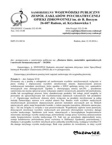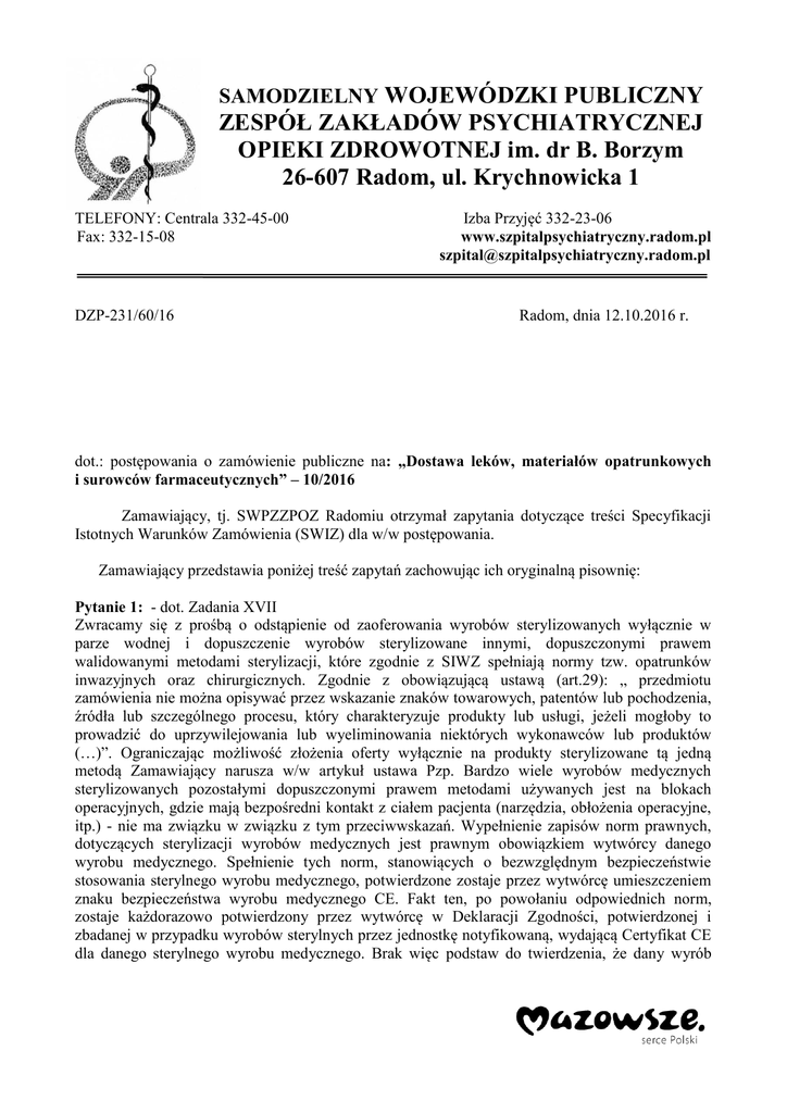 SAMODZIELNY WOJEWÓDZKI PUBLICZNY ZESPÓŁ ZAKŁADÓW PSYCHIATRYCZNEJ OPIEKI ZDROWOTNEJ im. dr B. Borzym 26-607 Radom, ul. Krychnowicka 1 TELEFONY: Centrala 332-45-00 Fax: 332-15-08 DZP-231/60/16 Izba Przyjęć 332-23-06 www.szpitalpsychiatryczny.radom.pl [email protected] Radom, dnia 12.10.2016 r. dot.: postępowania o zamówienie publiczne na: „Dostawa leków, materiałów opatrunkowych i surowców farmaceutycznych” – 10/2016 Zamawiający, tj. SWPZZPOZ Radomiu otrzymał zapytania dotyczące treści Specyfikacji Istotnych Warunków Zamówienia (SWIZ) dla w/w postępowania. Zamawiający przedstawia poniżej treść zapytań zachowując ich oryginalną pisownię: Pytanie 1: - dot. Zadania XVII Zwracamy się z prośbą o odstąpienie od zaoferowania wyrobów sterylizowanych wyłącznie w parze wodnej i dopuszczenie wyrobów sterylizowane innymi, dopuszczonymi prawem walidowanymi metodami sterylizacji, które zgodnie z SIWZ spełniają normy tzw. opatrunków inwazyjnych oraz chirurgicznych. Zgodnie z obowiązującą ustawą (art.29): „ przedmiotu zamówienia nie można opisywać przez wskazanie znaków towarowych, patentów lub pochodzenia, źródła lub szczególnego procesu, który charakteryzuje produkty lub usługi, jeżeli mogłoby to prowadzić do uprzywilejowania lub wyeliminowania niektórych wykonawców lub produktów (…)”. Ograniczając możliwość złożenia oferty wyłącznie na produkty sterylizowane tą jedną metodą Zamawiający narusza w/w artykuł ustawa Pzp. Bardzo wiele wyrobów medycznych sterylizowanych pozostałymi dopuszczonymi prawem metodami używanych jest na blokach operacyjnych, gdzie mają bezpośredni kontakt z ciałem pacjenta (narzędzia, obłożenia operacyjne, itp.) - nie ma związku w związku z tym przeciwwskazań. Wypełnienie zapisów norm prawnych, dotyczących sterylizacji wyrobów medycznych jest prawnym obowiązkiem wytwórcy danego wyrobu medycznego. Spełnienie tych norm, stanowiących o bezwzględnym bezpieczeństwie stosowania sterylnego wyrobu medycznego, potwierdzone zostaje przez wytwórcę umieszczeniem znaku bezpieczeństwa wyrobu medycznego CE. Fakt ten, po powołaniu odpowiednich norm, zostaje każdorazowo potwierdzony przez wytwórcę w Deklaracji Zgodności, potwierdzonej i zbadanej w przypadku wyrobów sterylnych przez jednostkę notyfikowaną, wydającą Certyfikat CE dla danego sterylnego wyrobu medycznego. Brak więc podstaw do twierdzenia, że dany wyrób sterylizowany konkretną metodą sterylizacyjną jest bezpieczniejszy czy w jakimkolwiek stopniu „lepszy” od innego wyrobu. Odpowiedź: Zamawiający dopuszcza wyroby sterylizowane innymi, dopuszczonymi prawem walidowanymi metodami sterylizacji, które spełniają normy tzw. Opatrunków inwazyjnych oraz chirurgicznych. Pytanie 2: - dot. Zadania XVII Czy zamawiający dopuści w poz. 1 gazę sterylizowaną tlenkiem etylu, pozostałe parametry zgodne z SIWZ? Odpowiedź: Zamawiający dopuszcza sterylizację tlenkiem etylu. Pytanie 3: - dot. Zadania XVII Czy zamawiający dopuści w poz. 1 gazę 17 nitkową, pozostałe parametry zgodne z SIWZ? Odpowiedź: Zamawiający dopuszcza gazę 17 nitkową w poz. 1. Pytanie 4: - dot. Zadania XVII Czy Zamawiający wymaga w poz. 2 gazy 17 nitkowej 90 cm x 100mb w składce? Odpowiedź: Zamawiający dopuszcza w składce lub rolce. Pytanie 5: - dot. Zadania XVII Czy Zamawiający dopuści w poz. 6 i 7 kompresy sterylizowany w tlenkiem etylenu czyli jedną z dopuszczony do stosowania metod sterylizacji, pozostałe parametry zgodne SIWZ? Odpowiedź: Zamawiający dopuszcza sterylizację tlenkiem etylenu poz. 6 i 7. Pytanie 6: - dot. Zadania XVII poz. 1 Czy zamawiający dopuści gazę sterylizowaną tlenkiem etylenu? Odpowiedź: Zamawiający dopuszcza. Pytanie 7: - dot. Zadania XVIII Zwracamy się z prośbą o wydzielenie pozycji 2-5 do osobnego pakietu, co umożliwi złożenie naszej firmie konkurencyjnej oferty. Odpowiedź: Zamawiający wyraża zgodę na wydzielenie z Zadania XVIII pozycji 2-5 i tworzy Zadanie XVIIIA. Nowo utworzone Zadanie XVIIIA dostępne na stronie internetowej Zamawiającego. Jednocześnie zmienia się wysokość wadium i wynosi: w Zadaniu XVIII wynosi: 300 00 zł., wysokość wadium w Zadaniu XVIII A wynosi: 1 900,00 zł. Pytanie 8: - dot. Zadania XVIII Czy Zamawiający dopuści w poz. 6 plaster pakowany a’12 sztuk, z przeliczeniem zamawianej ilości? Odpowiedź: Zamawiający dopuszcza. Pytanie 9: - dot. Zadania XVIII Czy Zamawiający dopuści w poz. 9 plaster włókninowy na rolce pakowany a’12 sztuk, z przeliczeniem, zamawianych ilości. Odpowiedź: Zamawiający dopuszcza. Pytanie 10: - dot. Zadania XVIII Czy Zamawiający dopuści w poz. 20 opatrunek oczny z wkładem chłonnym w kolorze białym oraz włókniną w kolorze białym. Odpowiedź: Zamawiający dopuszcza. Pytanie 11: - dot. Zadania IV Czy Zamawiający wyrazi zgodę na zaoferowanie w Zadaniu IV pozycji 10 preparatu Mannitol o stężeniu 15% w opakowaniu typu worek Viaflo, o pojemności 250 ml ponieważ: mannitol 15% i 20% mają wskazania do stosowania w tych samych jednostkach chorobowych a dawkowanie mieści się w rozpiętości zakresu terapeutycznego leku. Roztwory Mannitolu 15% nie krystalizują podczas przechowywania w temperaturze pokojowej ( w przeciwieństwie do mannitolu 20%), a zatem może być gotowy do użycia bez czasochłonnego rozpuszczania gorącej kąpieli wodnej. Nadruk informacji o leku na worku Viaflo zabezpiecza użytkownika przed odklejeniem etykiety oznakowania leku przez co zmniejsza możliwość wystąpienia pomyłki Mannitol 15% w worku Viaflo eliminuje ryzyko stłuczenia opakowania oraz zapewnia łatwość zawieszenia przy pacjencie ze względu na wieszak stanowiący integralną część worka. Odpowiedź: Zamawiający nie wyraża zgody wg Rozporządzenia Ministra Zdrowia z dnia 12.01. 2011 r. (Załącznik 2) – wykaz produktów leczniczych wchodzących w skład zestawu przeciwwstrząsowego jest Mannitolum 200 mg/ml (20%) 