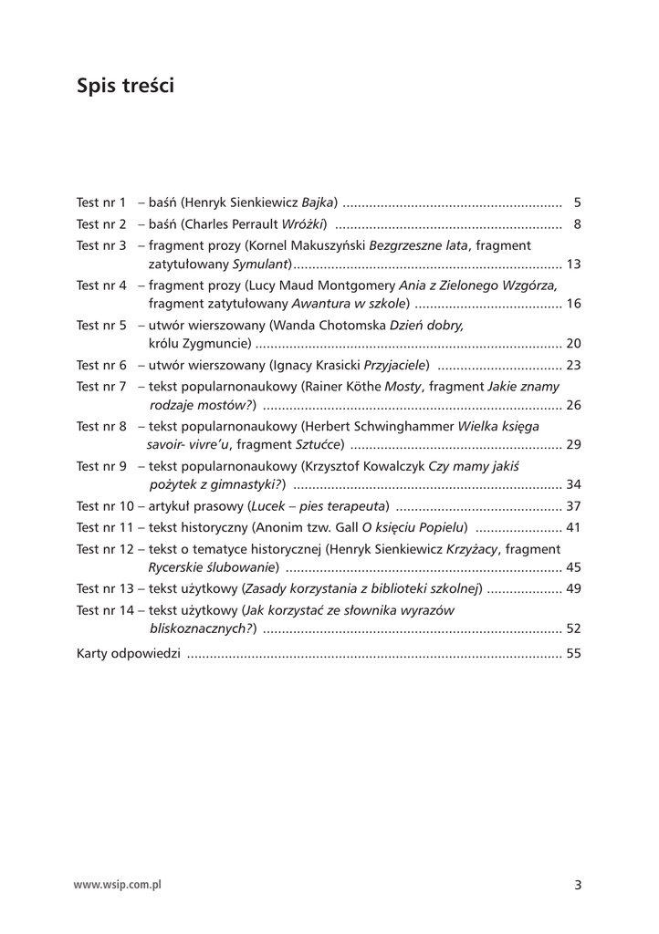 Spis treści Test nr 1 – baśń (Henryk Sienkiewicz Bajka) .......................................................... 5 Test nr 2 – baśń (Charles Perrault Wróżki) ............................................................ 8 Test nr 3 – fragment prozy (Kornel Makuszyński Bezgrzeszne lata, fragment zatytułowany Symulant) ....................................................................... 13 Test nr 4 – fragment prozy (Lucy Maud Montgomery Ania z Zielonego Wzgórza, fragment zatytułowany Awantura w szkole) ....................................... 16 Test nr 5 – utwór wierszowany (Wanda Chotomska Dzień dobry, królu Zygmuncie) ................................................................................. 20 Test nr 6 – utwór wierszowany (Ignacy Krasicki Przyjaciele) ................................. 23 Test nr 7 – tekst popularnonaukowy (Rainer Köthe Mosty, fragment Jakie znamy rodzaje mostów?) ............................................................................... 26 Test nr 8 – tekst popularnonaukowy (Herbert Schwinghammer Wielka księga savoir- vivre’u, fragment Sztućce) ........................................................ 29 Test nr 9 – tekst popularnonaukowy (Krzysztof Kowalczyk Czy mamy jakiś pożytek z gimnastyki?) ....................................................................... 34 Test nr 10 – artykuł prasowy (Lucek – pies terapeuta) ............................................ 37 Test nr 11 – tekst historyczny (Anonim tzw. Gall O księciu Popielu) ....................... 41 Test nr 12 – tekst o tematyce historycznej (Henryk Sienkiewicz Krzyżacy, fragment Rycerskie ślubowanie) ......................................................................... 45 Test nr 13 – tekst użytkowy (Zasady korzystania z biblioteki szkolnej) .................... 49 Test nr 14 – tekst użytkowy (Jak korzystać ze słownika wyrazów bliskoznacznych?) ............................................................................... 52 Karty odpowiedzi ................................................................................................... 55 www.wsip.com.pl 3