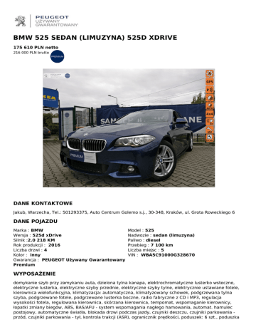 BMW 525 SEDAN (LIMUZYNA) 525D XDRIVE 175 610 PLN netto 216 000 PLN brutto DANE KONTAKTOWE Jakub, Warzecha, Tel.: 501293375, Auto Centrum Golemo s.j., 30-348, Kraków, ul. Grota Roweckiego 6 DANE POJAZDU Marka : BMW Wersja : 525d xDrive Silnik :2.0 218 KM Rok produkcji : 2016 Liczba drzwi : 4 Kolor : inny Gwarancja : PEUGEOT Używany Gwarantowany Premium Model : 525 Nadwozie : sedan (limuzyna) Paliwo : diesel Przebieg : 7 100 km Liczba miejsc : 5 VIN : WBA5C91000G328670 WYPOSAŻENIE domykanie szyb przy zamykaniu auta, dzielona tylna kanapa, elektrochromatyczne lusterko wsteczne, elektryczne lusterka, elektryczne szyby przednie, elektryczne szyby tylne, elektrycznie ustawiane fotele, kierownica wielofunkcyjna, klimatyzacja: automatyczna, klimatyzowany schowek, podgrzewana tylna szyba, podgrzewane fotele, podgrzewane lusterka boczne, radio fabryczne z CD i MP3, regulacja wysokości fotela, regulowana kierownica, skórzana kierownica, tempomat, wspomaganie kierownicy, łopatki zmiany biegów, ABS, BAS/AFU - system wspomagania nagłego hamowania, automat. hamulec postojowy, automatyczne światła, blokada drzwi podczas jazdy, czujniki deszczu, czujniki parkowania przód, czujniki parkowania - tył, kontrola trakcji (ASR), ogranicznik prędkości, poduszek: 6 szt., poduszka pow. kierowcy, poduszka pow. pasażera, poduszki pow. boczne - przód, poduszki pow. kurtynowe - przód, stabilizacja toru jazdy (ESP), uchwyt ISOFIX, światła do jazdy dziennej, światła przeciwmgielne, aluminiowe felgi, autoalarm, bluetooth, centralny zamek, gniazdo USB, immobiliser, komputer pokładowy, nawigacja satelitarna, reflektory biksenony, zestaw głośnomówiący, światła LED WYPOSAŻENIE DODATKOWE bezwypadkowy, garażowany, gwarancja, książka serwisowa, serwisowany w ASO, stan bardzo dobry, właściciel niepalący OPIS POJAZDU Czujnik ciśnienia w ogumieniu, Asystent hamowania, Czujnik deszczu z automatyczną kontrolą świateł mijania, Airbag 6 sztuk: poduszki powietrzne czołowe i boczne dla kierowcy i pasażera, kurtyny powietrzne, Czujnik kolizji, ABS, Dywaniki welurowe, Lusterka boczne regulowane elektrycznie, ogrzewane, Dzielone i składane oparcie kanapy z tyłu, Klimatyzacja automatyczna z regulacją 2-strefową, rozszerzony zakres funkcji, Komputer pokładowy, Immobilizer, Dodatkowe gniazda 12V, Opony z funkcją jazdy awaryjnej (Runflat), Lusterka zewnętrzne - asferyczne, Servotronic, Radio BMW Professional, Reflektory biksenonowe ze spryskiwaczami, Układ dynamicznej kontroli stabilności DSC z asystentem ruszania, Zestaw Bluetooth z interfejsem USB, Śruby do kół zabezpieczające przed kradzieżą, Czujniki odległości przy parkowaniu (PDC) przód i tył, Lakier metalik, Listwy ozdobne, szlifowane aluminium, Kierownica sportowa typu M, Pakiet Polski, Ogrzewanie przednich foteli, Oświetlenie ambientowe, System nawigacji satelitarnej Professional z ekranem kolorowym 10,2 cala, Fotele przednie sportowe, Felgi aluminiowe 18 Double Spoke 609 z ogumieniem, Pakiet Sportowy M, Podsufitka Individual w kolorze antracytowym, Obramowania Shadow Line Individual, wysoki połysk, Rękaw na narty, System alarmowy sterowany pilotem, Pakiet serwisowy BMW Service Inclusive Plus 5 lat / 100 km, Światła przeciwmgielne w technologii LED, Lusterko wsteczne przyciermniające się automatycznie Pierwszy właściciel, Bezwypadkowy, Kupiony w ASO w Polsce, Pojazd regularnie serwisowany, Pojazd garażowany, cena nowego 281000 zł Samochód sprzedawany w programie PEUGEOT Używany Gwarantowany PREMIUM: Roczna Gwarancja Umowna Certyfikat Jakości Pojazdu Dekra Opieka Peugeot Assitance Specjalna Oferta Ubezpieczeniowa Specjalna Oferta Finansowania Zakupu Wymiana w 30 Dni Dowiedz się więcej na : http://www.UzywanyGwarantowany.pl !!! W przypadku zainteresowania naszą ofertą prosimy o wcześniejszy kontakt w celu potwierdzenia dostępności oraz lokalizacji samochodu !!! Więcej informacji na temat tego samochodu oraz całej naszej oferty: Autoryzowany salon Peugeot Kraków ul. Grota Roweckiego 6 Jakub Warzecha - doradca handlowy Tel. +48 501 29 33 75 Agnieszka Szymańska-Uchwat - specjalista ds. Kredytów, Lesingów i Ubezpieczeń Tel. +48 693 93 25 21 Autoryzowany salon Citroen Kraków ul. Opolska 9 Tomasz Meus – Kierownik Samochodów Używanych Tel. +48 693 93 27 67 Michał Mikołajczak - doradca handlowy Tel. +48 609 44 10 28 Agnieszka Szczuka-Łach - specjalista ds. Kredytów, Lesingów i Ubezpieczeń Tel. +48 693 93 27 69 Autoryzowany salon Peugeot Nowy Targ ul. Podtatrzańska 3 Marcin Gerlach – kierownik salonu Tel. +48 607 30 52 55 Stasik Paweł - specjalista d/s ubezpieczeń Tel. +48 725 29 16 16 QR CODE DLA OGŁOSZENIA W SERWISIE UZYWANYGWARANTOWANY.PL Powered by TCPDF (www.tcpdf.org)