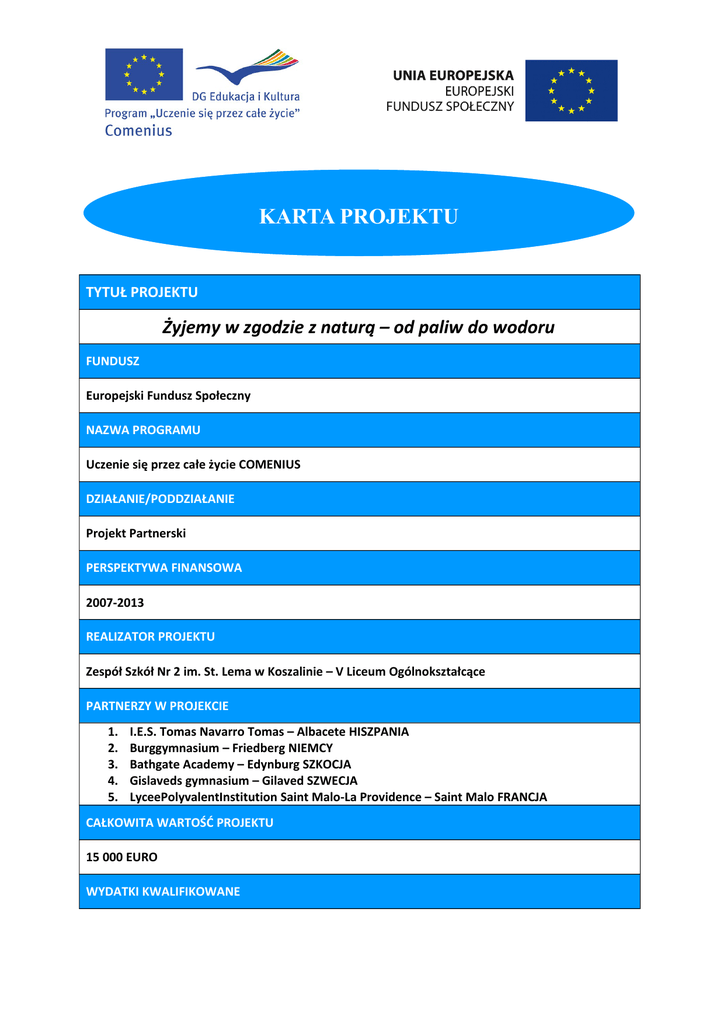 KARTA PROJEKTU TYTUŁ PROJEKTU Żyjemy w zgodzie z naturą – od paliw do wodoru FUNDUSZ Europejski Fundusz Społeczny NAZWA PROGRAMU Uczenie się przez całe życie COMENIUS DZIAŁANIE/PODDZIAŁANIE Projekt Partnerski PERSPEKTYWA FINANSOWA 2007-2013 REALIZATOR PROJEKTU Zespół Szkół Nr 2 im. St. Lema w Koszalinie – V Liceum Ogólnokształcące PARTNERZY W PROJEKCIE 1. 2. 3. 4. 5. I.E.S. Tomas Navarro Tomas – Albacete HISZPANIA Burggymnasium – Friedberg NIEMCY Bathgate Academy – Edynburg SZKOCJA Gislaveds gymnasium – Gilaved SZWECJA LyceePolyvalentInstitution Saint Malo-La Providence – Saint Malo FRANCJA CAŁKOWITA WARTOŚĆ PROJEKTU 15 000 EURO WYDATKI KWALIFIKOWANE 15 000 EURO WARTOŚĆ DOFINANSOWANIA 15 000 EURO WARTOŚĆ DOFINANSOWANIA UE 15 000 EURO WARTOŚĆ DOFINANSOWANIA Z INNYCH ŹRÓDEŁ PROCENT DOFINANSOWANIA 100 % OKRES REALIZACJI 01.08.2010 r. – 31.07.2012 r. NUMER UMOWY O DOFINANSOWANIE 2010-1-ES1-COM06-20438 6 DATA PODPISANIA UMOWY 27.10.2010 r. OPIS PROJEKTU Celem projektu było kształtowanie świadomości ekologicznej i konieczności współdziałania międzynarodowego na rzecz środowiska, promowanie czynnego uczestnictwa w życiu wspólnoty europejskiej, rozwijanie inteligencji emocjonalnej i ekologicznej, aktywny sposób poznawania i uczenia się języków obcych, zwiększenie wykorzystywania nowoczesnych technologii informacyjno- komunikacyjnych, połączenie nauki, techniki i sztuki, wychowanie w tolerancji, szacunku i równości oraz poznawanie dziedzictwa kulturowego różnych narodów. W ramach programu szkoły promowały ekologiczną postawę w codziennych zachowaniach, w szczególności dotyczących oszczędności energii, korzystania z transportu, wykorzystania źródeł energii odnawialnej, wykorzystania materiałów ekologicznych w różnych dziedzinach życia, wyboru ekologicznych kosmetyków. Każda szkoła była odpowiedzialna za przeprowadzenie konkretnych działań dla realizacji zaplanowanych zadań. Szkoła z Hiszpanii była odpowiedzialna za koordynację realizacji zadań wynikających z działalności artystycznej i komunikacji elektronicznej, szkoła ze Szkocji koordynowała realizację zadań wynikających z zagadnień związanych z nauką i techniką, rozwijaniem umiejętności językowych, szkoła z Niemiec odpowiadała za realizację zadań związanych ze sztuką, polityką, historią i ekonomią, szkoła z Francji odpowiadała za realizację zadań wynikających z zagadnień związanych z nauką i działaniami praktycznymi, szkoła z Polski odpowiadała za realizację zadań dotyczących zagadnień związanych z zastosowaniem technologii komputerowych i z nauką.