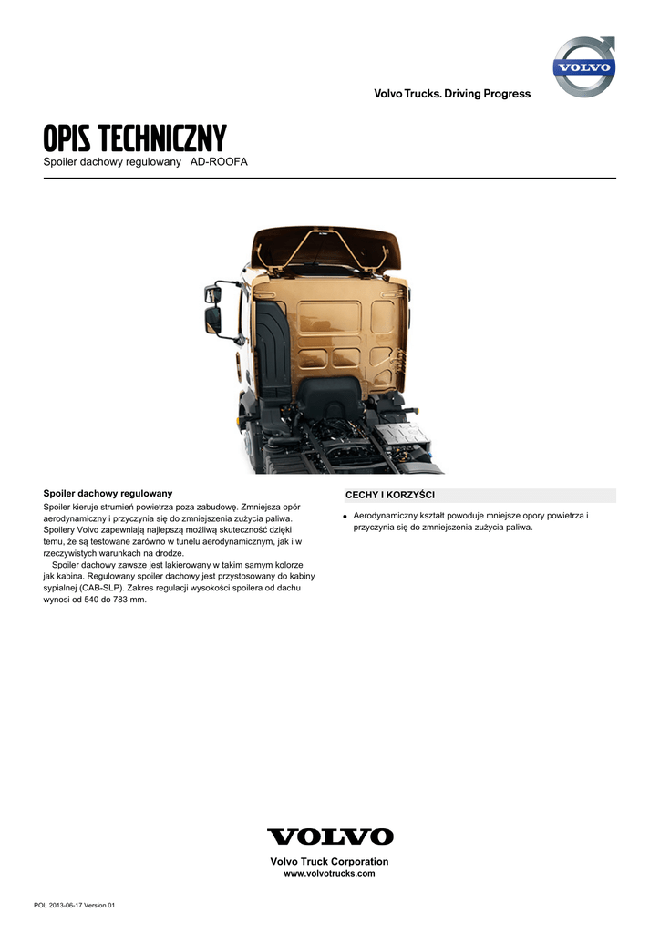 OPIS TECHNICZNY Spoiler dachowy regulowany AD-ROOFA Spoiler dachowy regulowany CECHY I KORZYŚCI Spoiler kieruje strumień powietrza poza zabudowę. Zmniejsza opór aerodynamiczny i przyczynia się do zmniejszenia zużycia paliwa. Spoilery Volvo zapewniają najlepszą możliwą skuteczność dzięki temu, że są testowane zarówno w tunelu aerodynamicznym, jak i w rzeczywistych warunkach na drodze. Spoiler dachowy zawsze jest lakierowany w takim samym kolorze jak kabina. Regulowany spoiler dachowy jest przystosowany do kabiny sypialnej (CAB-SLP). Zakres regulacji wysokości spoilera od dachu wynosi od 540 do 783 mm. Aerodynamiczny kształt powoduje mniejsze opory powietrza i przyczynia się do zmniejszenia zużycia paliwa. Volvo Truck Corporation www.volvotrucks.com POL 2013-06-17 Version 01