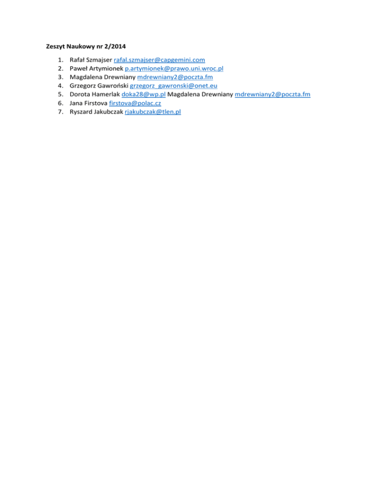 Zeszyt Naukowy nr 2/2014 1. 2. 3. 4. 5. 6. 7. Rafał Szmajser [email protected] Paweł Artymionek [email protected] Magdalena Drewniany [email protected] Grzegorz Gawroński [email protected] Dorota Hamerlak [email protected] Magdalena Drewniany [email protected] Jana Firstova [email protected] Ryszard Jakubczak [email protected]