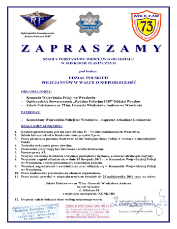 Ogólnopolskie Stowarzyszenie „Rodzina Policyjna 1939” SZKOŁY PODSTAWOWE WROCŁAWIA DO UDZIAŁU W KONKURSIE PLASTYCZNYM pod hasłem: UDZIAŁ POLSKICH POLICJANTÓW W WALCE O NIEPODLEGŁOŚĆ ORGANIZATORZY: − Komenda Wojewódzka Policji we Wrocławiu − Ogólnopolskie Stowarzyszenie „Rodzina Policyjna 1939” Oddział Wrocław − Szkoła Podstawowa nr 73 im. Generała Władysława Andersa we Wrocławiu PATRONAT: − Komendant Wojewódzki Policji we Wrocławiu - inspektor Arkadiusz Golanowski REGULAMIN KONKURSU: Konkurs przeznaczony jest dla uczniów klas IV - VI szkół podstawowych Wrocławia. Szkoła biorąca udział w Konkursie może przysłać 5 prac. Praca plastyczna powinna ilustrować udział funkcjonariuszy Policji w walkach o niepodległość Polski. 4. Technika wykonania pracy dowolna. 5. Elementem pracy mogą być ilustrowane źródła historyczne. 6. Format pracy A3. 7. Wszyscy uczestnicy Konkursu otrzymają pamiątkowe dyplomy, a laureaci atrakcyjne nagrody. 8. Wręczenie nagród odbędzie się w dniu 10 listopada 2016 r. w Komendzie Wojewódzkiej Policji we Wrocławiu, o czym powiadomimy oddzielnym pismem. 9. Wernisaż nagrodzonych i wyróżnionych prac odbędzie się w Komendzie Wojewódzkiej Policji we Wrocławiu. 10. Prace konkursowe przechodzą na własność organizatora. 11. Prace należy przysłać w nieprzekraczalnym terminie do 25 października 2016 roku na adres: 1. 2. 3. Szkoła Podstawowa nr 73 im. Generała Władysława Andersa 50-525 Wrocław ul. Gliniana 30 z dopiskiem na kopercie: KONKURS 12. Do pracy należy dołączyć dane według załączonego wzoru. KONKURS PLASTYCZNY pod hasłem: UDZIAŁ POLSKICH POLICJANTÓW W WALCE O NIEPODLEGŁOŚĆ Lp. Dane autora pracy: 1. Imię: 2. Nazwisko: 3. Klasa: Nazwa szkoły/placówki oświatowej: 4. 5. Nauczyciel /opiekun Imię i nazwisko Tel. kontaktowy Wyrażam zgodę na przetwarzanie moich danych osobowych przez Organizatora na potrzeby Konkursu (ustawa o ochronie danych osobowych z dn. 29 sierpnia 1997 r. Dz. U. Nr 133, z późn. zm.) 6. ................................................................... Podpis Rodzica / prawnego opiekuna