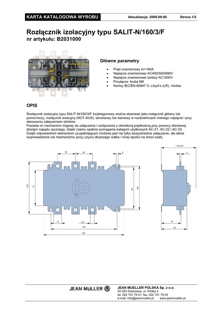 KARTA KATALOGOWA WYROBU Aktualizacja: 2009-09-09 Strona 1/2 Rozłącznik izolacyjny typu SALIT-N/160/3/F nr artykułu: B2031000 Główne parametry • • • • • Prąd znamionowy In=160A Napięcie znamionowe AC400/500/690V Napięcie znamionowe izolacji AC1000V Przyłącze: śruba M6 Normy IEC/EN 60947-3, LIoyd’s (LR), Veritas OPIS Rozłącznik izolacyjny typu SALIT-N/160/3/F trzybiegunowy można stosować jako rozłącznik główny lub pomocniczy, rozłącznik awaryjny (NOT-AUS), serwisowy lub sieciowy w rozdzielnicach niskiego napięcia i przy sterowaniu załączeniem silników. Posiada on mechanizm migowy do załączania i rozłączania z określoną prędkością przy pomocy obrotowej dźwigni napędu ręcznego, dzięki czemu spełnia wymagania kategorii użytkowych AC-21, AC-22 i AC-23. Dzięki odpowiednim elementom uzupełniającym możliwe jest nie tylko bezpośrednie załączanie, ale także wyprowadzenie osi mechanizmu (przy użyciu dłuższego wałka i innej rączki) na drzwi szafy. JEAN MUELLER POLSKA Sp. z o.o. 02-293 Warszawa, ul. Krótka 4 tel. 022 751 79 01, fax. 022 751 79 03 e-mail: [email protected] www.jeanmueller.pl KARTA KATALOGOWA WYROBU Aktualizacja: 2009-09-09 Strona 2/2 Rozłącznik izolacyjny typu SALIT-N/160/3/F nr artykułu: B2031000 DANE TECHNICZNE Parametry elektryczne Napięcie znamionowe łączeniowe Prąd znamionowy łączeniowy Prąd cieplny z bezpiecznikiem Częstotliwość znamionowa Napięcie znamionowe izolacji Znamionowa zwarciowa zdolność załączania Warunkowy znamionowy prąd zwarciowy z bezpiecznikiem Bezpiecznik zewnętrzny Dopuszczalny prąd wytrzymywany bezpieczników Całka Joule’a Znamionowy prąd roboczy dla kategorii AC-21 Znamionowy prąd roboczy dla kategorii AC-22 Znamionowy prąd roboczy dla kategorii AC-23 Zdolność łączeniowa silnika dla kategorii AC-23 Znamionowe napięcie udarowe wytrzymywane Elektryczna trwałość łączeniowa (cykle) Całkowita strata mocy przy prądzie Ith Ue Ie Ith Ui Icm IN ID I²t Ie Ie Ie P Uimp Pv V A A Hz V kA kAeff A kA kA²s A A A kW kV W AC400 160 160 50-60 AC1000 17,6 50/100 160/100 17/15,5 600/67 160 160 154 90 8 1000 11 AC500 160 160 50-60 AC1000 17,6 50/100 160/100 17/15,5 600/67 160 160 106 75 8 1000 11 AC690 160 160 50-60 AC1000 17,6 50/100 160/100 17/15,5 600/67 125 125 8 1000 11 Parametry mechaniczne Mechaniczny okres użytkowania (cykle łączeniowe) Waga (bez opakowania) Stopień ochrony (od frontu) 8 000 1,1 kg IP30 Przyłącze kablowe Przyłącze płaskie Średnica otworu Moment dokręcenia Ma mm² Nm M8 14 Tu °C - 25 do + 55 praca ciągła niezależne uruchomienie ręczne w poziomie i w pionie do 2000 3 III Warunki pracy Temperatura otoczenia Zakładany tryb pracy Uruchomienie Położenie montażowe Maksymalna wysokość montażu Stopień zabrudzenia Kategoria przepięcia mm Elementy uzupełniające Napęd bezpośredni Wałek napędowy 116 mm Typ: A160-116/SALIT Nr art. B8000014 Rączka napędu Typ: DA01 Nr art. B8000044 Napęd wyprowadzony na drzwi szafy Wałek napędowy 270 mm Typ: A160-270/SALIT Nr art. B8000015 Rączka napędu Typ: TDA01 Nr art. B8000061 JEAN MUELLER POLSKA Sp. z o.o. 02-293 Warszawa, ul. Krótka 4 tel. 022 751 79 01, fax. 022 751 79 03 e-mail: [email protected] www.jeanmueller.pl