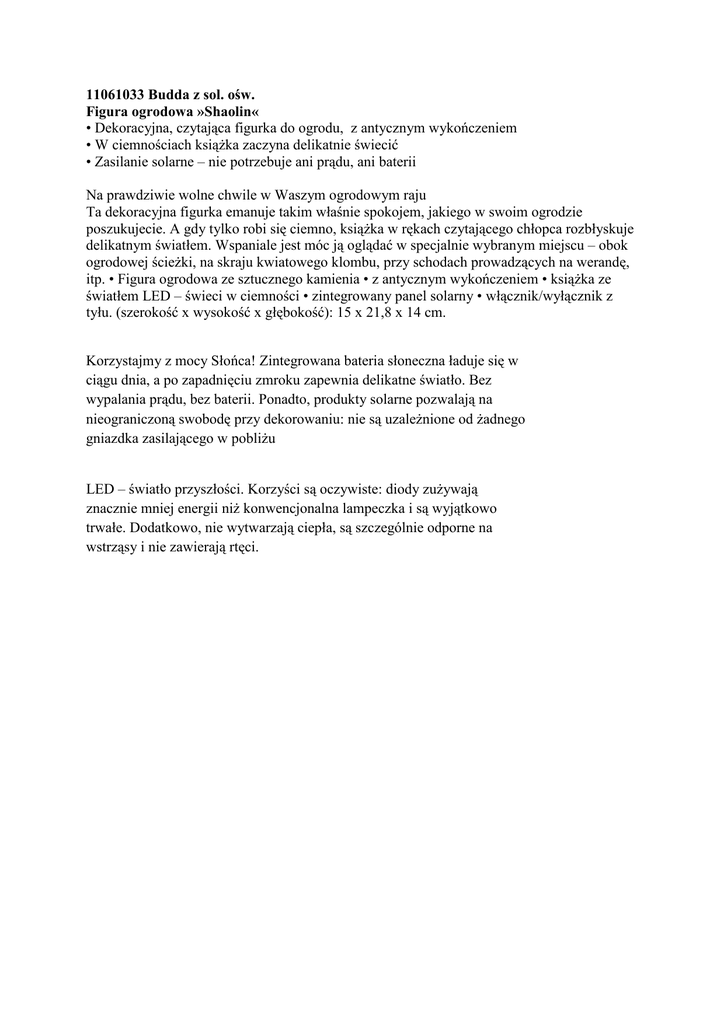 11061033 Budda z sol. ośw. Figura ogrodowa »Shaolin« • Dekoracyjna, czytająca figurka do ogrodu, z antycznym wykończeniem • W ciemnościach książka zaczyna delikatnie świecić • Zasilanie solarne – nie potrzebuje ani prądu, ani baterii Na prawdziwie wolne chwile w Waszym ogrodowym raju Ta dekoracyjna figurka emanuje takim właśnie spokojem, jakiego w swoim ogrodzie poszukujecie. A gdy tylko robi się ciemno, książka w rękach czytającego chłopca rozbłyskuje delikatnym światłem. Wspaniale jest móc ją oglądać w specjalnie wybranym miejscu – obok ogrodowej ścieżki, na skraju kwiatowego klombu, przy schodach prowadzących na werandę, itp. • Figura ogrodowa ze sztucznego kamienia • z antycznym wykończeniem • książka ze światłem LED – świeci w ciemności • zintegrowany panel solarny • włącznik/wyłącznik z tyłu. (szerokość x wysokość x głębokość): 15 x 21,8 x 14 cm. Korzystajmy z mocy Słońca! Zintegrowana bateria słoneczna ładuje się w ciągu dnia, a po zapadnięciu zmroku zapewnia delikatne światło. Bez wypalania prądu, bez baterii. Ponadto, produkty solarne pozwalają na nieograniczoną swobodę przy dekorowaniu: nie są uzależnione od żadnego gniazdka zasilającego w pobliżu LED – światło przyszłości. Korzyści są oczywiste: diody zużywają znacznie mniej energii niż konwencjonalna lampeczka i są wyjątkowo trwałe. Dodatkowo, nie wytwarzają ciepła, są szczególnie odporne na wstrząsy i nie zawierają rtęci.