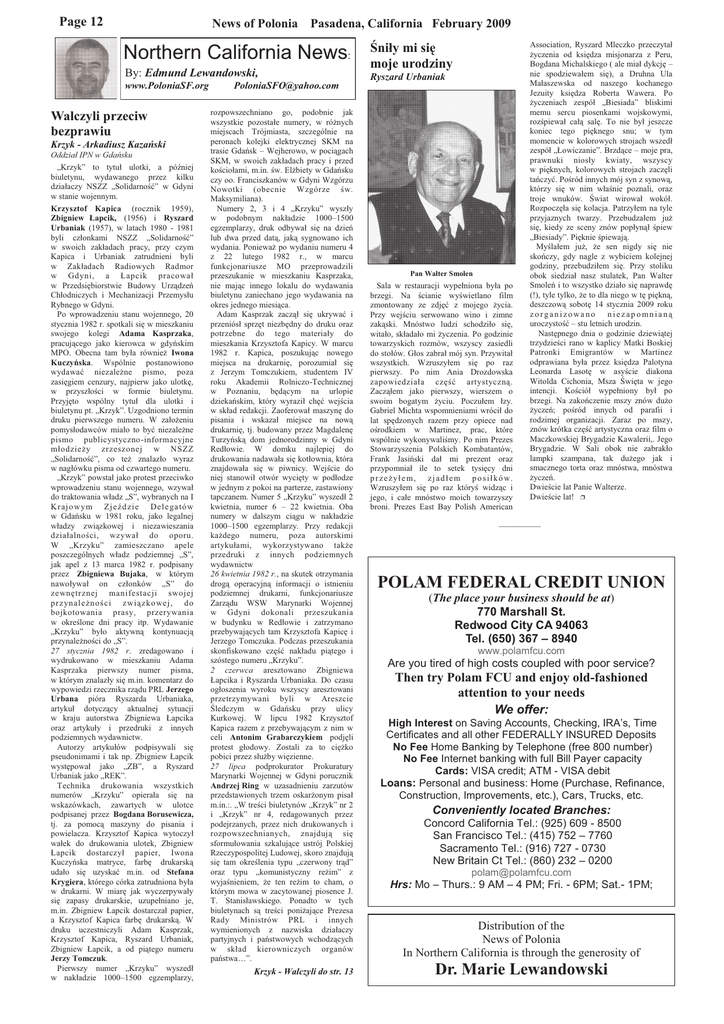 Page 12 News of Polonia Pasadena, California February 2009 Northern California News: By: Edmund Lewandowski, www.PoloniaSF.org Walczyli przeciw bezprawiu Krzyk - Arkadiusz Kazański Oddział IPN w Gdańsku „Krzyk” to tytuł ulotki, a później biuletynu, wydawanego przez kilku działaczy NSZZ „Solidarność” w Gdyni w stanie wojennym. Krzysztof Kapica (rocznik 1959), Zbigniew Łapcik, (1956) i Ryszard Urbaniak (1957), w latach 1980 - 1981 byli członkami NSZZ „Solidarność” w swoich zakładach pracy, przy czym Kapica i Urbaniak zatrudnieni byli w Zakładach Radiowych Radmor w Gdyni, a Łapcik pracował w Przedsiębiorstwie Budowy Urządzeń Chłodniczych i Mechanizacji Przemysłu Rybnego w Gdyni. Po wprowadzeniu stanu wojennego, 20 stycznia 1982 r. spotkali się w mieszkaniu swojego kolegi Adama Kasprzaka, pracującego jako kierowca w gdyńskim MPO. Obecna tam była również Iwona Kuczyńska. Wspólnie postanowiono wydawać niezależne pismo, poza zasięgiem cenzury, najpierw jako ulotkę, w przyszłości w formie biuletynu. Przyjęto wspólny tytuł dla ulotki i biuletynu pt. „Krzyk”. Uzgodniono termin druku pierwszego numeru. W założeniu pomysłodawców miało to być niezależne pismo publicystyczno-informacyjne młodzieży zrzeszonej w NSZZ „Solidarność”, co też znalazło wyraz w nagłówku pisma od czwartego numeru. „Krzyk” powstał jako protest przeciwko wprowadzeniu stanu wojennego, wzywał do traktowania władz „S”, wybranych na I Kraj o wy m Zj eźd zi e Del e ga tó w w Gdańsku w 1981 roku, jako legalnej władzy związkowej i niezawieszania działalności, wzywał do oporu. W „Krzyku” zamieszczano apele poszczególnych władz podziemnej „S”, jak apel z 13 marca 1982 r. podpisany przez Zbigniewa Bujaka, w którym nawoływał on członków „S” do zewnętrznej manifestacji swojej p r zynależno ści z wiązk o wej , do bojkotowania prasy, przerywania w określone dni pracy itp. Wydawanie „Krzyku” było aktywną kontynuacją przynależności do „S”. 27 stycznia 1982 r. zredagowano i wydrukowano w mieszkaniu Adama Kasprzaka pierwszy numer pisma, w którym znalazły się m.in. komentarz do wypowiedzi rzecznika rządu PRL Jerzego Urbana pióra Ryszarda Urbaniaka, artykuł dotyczący aktualnej sytuacji w kraju autorstwa Zbigniewa Łapcika oraz artykuły i przedruki z innych podziemnych wydawnictw. Autorzy artykułów podpisywali się pseudonimami i tak np. Zbigniew Łapcik występował jako „ZB”, a Ryszard Urbaniak jako „REK”. Technika drukowania wszystkich numerów „Krzyku” opierała się na wskazówkach, zawartych w ulotce podpisanej przez Bogdana Borusewicza, tj. za pomocą maszyny do pisania i powielacza. Krzysztof Kapica wytoczył wałek do drukowania ulotek, Zbigniew Łapcik dostarczył papier, Iwona Kuczyńska matryce, farbę drukarską udało się uzyskać m.in. od Stefana Krygiera, którego córka zatrudniona była w drukarni. W miarę jak wyczerpywały się zapasy drukarskie, uzupełniano je, m.in. Zbigniew Łapcik dostarczał papier, a Krzysztof Kapica farbę drukarską. W druku uczestniczyli Adam Kasprzak, Krzysztof Kapica, Ryszard Urbaniak, Zbigniew Łapcik, a od piątego numeru Jerzy Tomczuk. Pierwszy numer „Krzyku” wyszedł w nakładzie 1000–1500 egzemplarzy, [email protected] rozpowszechniano go, podobnie jak wszystkie pozostałe numery, w różnych miejscach Trójmiasta, szczególnie na peronach kolejki elektrycznej SKM na trasie Gdańsk – Wejherowo, w pociągach SKM, w swoich zakładach pracy i przed kościołami, m.in. św. Elżbiety w Gdańsku czy oo. Franciszkanów w Gdyni Wzgórzu Nowotki (obecnie Wzgórze św. Maksymiliana). Numery 2, 3 i 4 „Krzyku” wyszły w podobnym nakładzie 1000–1500 egzemplarzy, druk odbywał się na dzień lub dwa przed datą, jaką sygnowano ich wydania. Ponieważ po wydaniu numeru 4 z 22 lutego 1982 r., w marcu funkcjonariusze MO przeprowadzili przeszukanie w mieszkaniu Kasprzaka, nie mając innego lokalu do wydawania biuletynu zaniechano jego wydawania na okres jednego miesiąca. Adam Kasprzak zaczął się ukrywać i przeniósł sprzęt niezbędny do druku oraz potrzebne do tego materiały do mieszkania Krzysztofa Kapicy. W marcu 1982 r. Kapica, poszukując nowego miejsca na drukarnię, porozumiał się z Jerzym Tomczukiem, studentem IV roku Akademii Rolniczo-Technicznej w Poznaniu, będącym na urlopie dziekańskim, który wyraził chęć wejścia w skład redakcji. Zaoferował maszynę do pisania i wskazał miejsce na nową drukarnię, tj. budowany przez Magdalenę Turzyńską dom jednorodzinny w Gdyni Redłowie. W domku najlepiej do drukowania nadawała się kotłownia, która znajdowała się w piwnicy. Wejście do niej stanowił otwór wycięty w podłodze w jednym z pokoi na parterze, zastawiony tapczanem. Numer 5 „Krzyku” wyszedł 2 kwietnia, numer 6 – 22 kwietnia. Oba numery w dalszym ciągu w nakładzie 1000–1500 egzemplarzy. Przy redakcji każdego numeru, poza autorskimi artykułami, wykorzystywano także przedruki z innych podziemnych wydawnictw 26 kwietnia 1982 r., na skutek otrzymania drogą operacyjną informacji o istnieniu podziemnej drukarni, funkcjonariusze Zarządu WSW Marynarki Wojennej w Gdyni dokonali przeszukania w budynku w Redłowie i zatrzymano przebywających tam Krzysztofa Kapicę i Jerzego Tomczuka. Podczas przeszukania skonfiskowano część nakładu piątego i szóstego numeru „Krzyku”. 2 czerwca aresztowano Zbigniewa Łapcika i Ryszarda Urbaniaka. Do czasu ogłoszenia wyroku wszyscy aresztowani przetrzymywani byli w Areszcie Śledczym w Gdańsku przy ulicy Kurkowej. W lipcu 1982 Krzysztof Kapica razem z przebywającym z nim w celi Antonim Grabarczykiem podjęli protest głodowy. Zostali za to ciężko pobici przez służby więzienne. 27 lipca podprokurator Prokuratury Marynarki Wojennej w Gdyni porucznik Andrzej Ring w uzasadnieniu zarzutów przedstawionych trzem oskarżonym pisał m.in.:. „W treści biuletyn