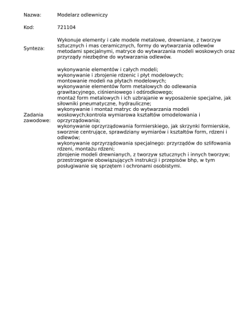 Nazwa: Modelarz odlewniczy Kod: 721104 Synteza: Wykonuje