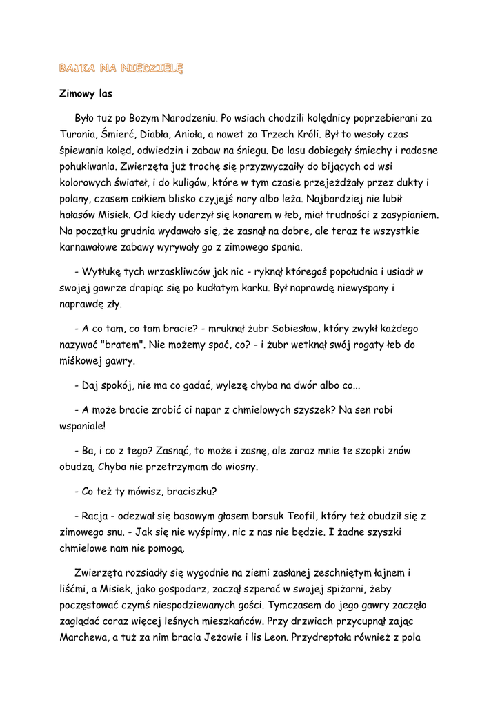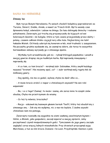Zimowy las Było tuż po Bożym Narodzeniu. Po wsiach chodzili kolędnicy poprzebierani za Turonia, Śmierć, Diabła, Anioła, a nawet za Trzech Króli. Był to wesoły czas śpiewania kolęd, odwiedzin i zabaw na śniegu. Do lasu dobiegały śmiechy i radosne pohukiwania. Zwierzęta już trochę się przyzwyczaiły do bijących od wsi kolorowych świateł, i do kuligów, które w tym czasie przejeżdżały przez dukty i polany, czasem całkiem blisko czyjejś nory albo leża. Najbardziej nie lubił hałasów Misiek. Od kiedy uderzył się konarem w łeb, miał trudności z zasypianiem. Na początku grudnia wydawało się, że zasnął na dobre, ale teraz te wszystkie karnawałowe zabawy wyrywały go z zimowego spania. - Wytłukę tych wrzaskliwców jak nic - ryknął któregoś popołudnia i usiadł w swojej gawrze drapiąc się po kudłatym karku. Był naprawdę niewyspany i naprawdę zły. - A co tam, co tam bracie? - mruknął żubr Sobiesław, który zwykł każdego nazywać "bratem". Nie możemy spać, co? - i żubr wetknął swój rogaty łeb do miśkowej gawry. - Daj spokój, nie ma co gadać, wylezę chyba na dwór albo co... - A może bracie zrobić ci napar z chmielowych szyszek? Na sen robi wspaniale! - Ba, i co z tego? Zasnąć, to może i zasnę, ale zaraz mnie te szopki znów obudzą. Chyba nie przetrzymam do wiosny. - Co też ty mówisz, braciszku? - Racja - odezwał się basowym głosem borsuk Teofil, który też obudził się z zimowego snu. - Jak się nie wyśpimy, nic z nas nie będzie. I żadne szyszki chmielowe nam nie pomogą. Zwierzęta rozsiadły się wygodnie na ziemi zasłanej zeschniętym łajnem i liśćmi, a Misiek, jako gospodarz, zaczął szperać w swojej spiżarni, żeby poczęstować czymś niespodziewanych gości. Tymczasem do jego gawry zaczęło zaglądać coraz więcej leśnych mieszkańców. Przy drzwiach przycupnął zając Marchewa, a tuż za nim bracia Jeżowie i lis Leon. Przydreptała również z pola kuropatwa Pelagia, a zgłębi lasu przykuśtykał stary wilk Leopold. Jeszcze trochę i Misiek nie miał gdzie usadzać wciąż przybywających zwierząt. Wokół rozlegało się tylko pochrząkiwanie, mruczenie, tupanie, warczenie i mlaskanie, ponieważ gospodarz rozczęstował między przybyłych prawie wszystkie swoje zimowe zapasy. Gdy już pierwszy głód był zaspokojony i zapanował jaki taki ład, rozpoczęła się bardzo ważna narada. Jako pierwszy głos zabrał Sobiesław: - Bracia, tak dalej być nie może - żubr zawiesił głos, coś niewyraźnie mruknął i zakończył swoją przemowę. Inne zwierzęta pokiwały głowami na znak, że ich pobratymiec dobrze mówi i całkowicie się z nim zgadzają. Kuropatwa, znana pieśniarka ludowa poderwała się, zamachała skrzydełkami i na poczekaniu zanuciła kuplecik: - Gdy zwierz się nie wyśpi To się groźne staje Oj, nie chodźta ludzie Wtedy na rozstaje. Uha! - Brawo, brawo! - zakrzyknęły zwierzęta i już zamierzały ruszyć w tany, lecz powstrzymał je ochrypły głos Leopolda. - Spokój mi tu! Trzeba radzić, a nie zajmować się głupotami. Siadać z powrotem hołoto! - Trzeba przyznać, że Leopold nigdy nie był uprzejmy, ale zwierzęta wolały nie zwracać mu uwagi i wszystkie grzecznie zajęły swoje miejsca. - Stary wilk jestem - ciągnął już spokojniejszym głosem - i niejeden kulig przepłoszyłem. Ale tu sprawa jest bardziej skomplikowana. Wprawdzie możemy z Leonem pogonić jeszcze sanki i konie, ale co dalej? Ludzie przestaną jeździć na kuligi lecz hałasy we wsi zostaną? Co zrobić z tymi kolędnikami i zabawami? Tam nasze wycie i warczenie nie pomoże. - Może zaatakować wieś całym lasem? - zaproponował Misiek ziewając, bo po posiłku znów zachciało mu się trochę spać. - Braciszkowie, nie można tak. Wszak to czas Bożego Narodzenia, nie będziemy nikogo atakować i prowadzić wojen... - O to, to - podchwycił Marchewa. - lepiej jakoś w zgodzie.. Może przy wspólnym stole?... - Przy wspólnym stole? Hi, hi - zaśmiali się bracia Jeżowie. - Uważaj zając, żebyś nie znalazł się raczej na stole i do tego w sąsiedztwie buraczków, hi, hi. - No, no! Nie pozwalajcie sobie! - Cicho! Ja mam pomysł! - wykrzyknął Teofil. - Skoro my, miłośnicy zimowego snu - tu spojrzał na Miśka, który zwiesił łeb i zaczął pochrapywać - nie możemy na dobre zasnąć, to trzeba kupić specjalne kaski i nauszniki, żeby nic nie słyszeć! - No, dobra - zapiszczały Wiewióry - a skąd weźmiemy na to pieniądze? - Zacznijmy sami kolędować! Piosenki ułoży Pelagia, przebrań nam specjalnie nie potrzeba, bo mamy na sobie futra, pióra i sierści różnej maści. - No, a kogo będziemy odwiedzać? Przecież do wsi nie pójdziemy, bo nas psami poszczują. - Będziemy odwiedzać okoliczne gajówki i leśniczówki. Tam nie przychodzą przecież kolędnicy. - To jest myśl, to jest pomysł! - zakrzyknęły zgromadzone zwierzęta i odtańczyły taniec radości. Już nazajutrz grupa złożona z Sobiesława, Marchewy, Leona, Pelagii, Wiewiór i czterech Saren wyruszyła z kolędowaniem do pierwszej gajówki. Zwierzęta zostały przyjęte bardzo serdecznie, a pan gajowy tak się wzruszył, że poczęstował niezwykłych kolędników kompotem z suszonych owoców, a do woreczka uszytego przez braci Jeżów wrzucił złoty pieniążek. Z każdym dniem w woreczku przybywało monet, a leśnicy długo wspominali występy ich futerkowych podopiecznych. Kolędowanie zbliżało się już ku końcowi i Leopold przeliczył zebrane pieniądze. - Wystarczy - powiedział, po czym gwizdnął na cietrzewia, który nieźle znał się na modzie - Hej , Boguś, leć no do miasteczka i kup jakieś nauszniki, czapki, czy coś, no tego, sam wiesz najlepiej. Coś takiego, co osłoni uszy przed hałasem. - Jasne, już się robi! Uwielbiam latać na zakupy! Bogumił długo nie wracał, ale kiedy w końcu pojawił się przed miśkową gawrą, zwierzęta nie posiadały się z zachwytu. Ciet