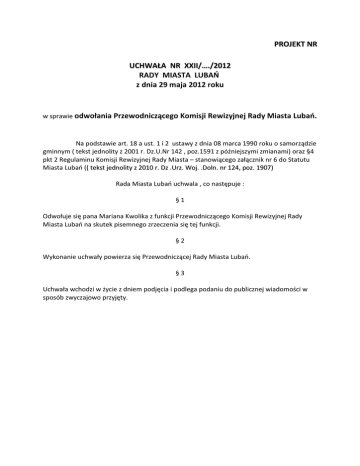 PROJEKT NR UCHWAŁA NR XXII/…./2012 RADY MIASTA LUBAŃ z dnia 29 maja 2012 roku w sprawie odwołania Przewodniczącego Komisji Rewizyjnej Rady Miasta Lubań. Na podstawie art. 18 a ust. 1 i 2 ustawy z dnia 08 marca 1990 roku o samorządzie gminnym ( tekst jednolity z 2001 r. Dz.U.Nr 142 , poz.1591 z późniejszymi zmianami) oraz §4 pkt 2 Regulaminu Komisji Rewizyjnej Rady Miasta – stanowiącego załącznik nr 6 do Statutu Miasta Lubań (( tekst jednolity z 2010 r. Dz .Urz. Woj. .Doln. nr 124, poz. 1907) Rada Miasta Lubań uchwala , co następuje : §1 Odwołuje się pana Mariana Kwolika z funkcji Przewodniczącego Komisji Rewizyjnej Rady Miasta Lubań na skutek pisemnego zrzeczenia się tej funkcji. §2 Wykonanie uchwały powierza się Przewodniczącej Rady Miasta Lubań. §3 Uchwała wchodzi w życie z dniem podjęcia i podlega podaniu do publicznej wiadomości w sposób zwyczajowo przyjęty. Uzasadnienie do projektu uchwały w sprawie odwołania Przewodniczącego Komisji Rewizyjnej Rady Miasta Lubań. W związku ze złożeniem w dniu 24 kwietnia 2012 roku przez pana Mariana Kwolika pisemnej rezygnacji z funkcji Przewodniczącego Komisji Rewizyjnej Rady Miasta Lubań -spowodowanej wniesieniem odrębnego zdania do sprawozdania Komisji Rewizyjnej z przeprowadzonej kontroli dotyczącej wykorzystania limitów na telefony służbowe w Urzędzie Miasta Lubań za rok 2011 oraz z uwagi na zapisy prawne regulujące odwołanie Przewodniczącego Komisji w drodze uchwały Rady - podjęcie uchwały w sprawie odwołania Przewodniczącego Komisji Rewizyjnej jest zasadne.