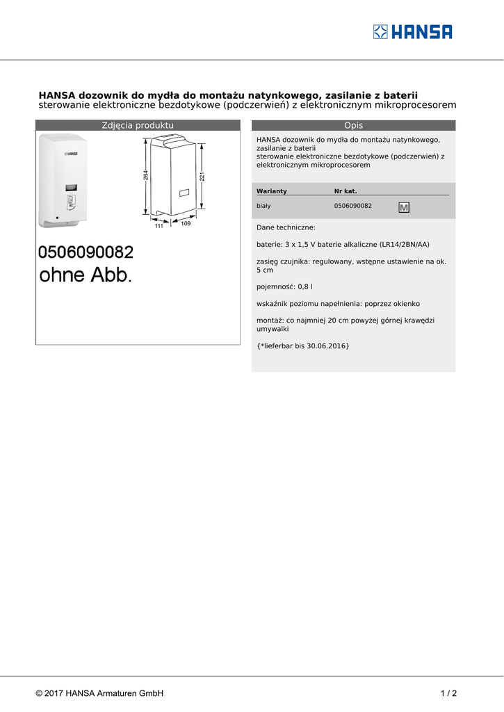 HANSA dozownik do mydła do montażu natynkowego, zasilanie z