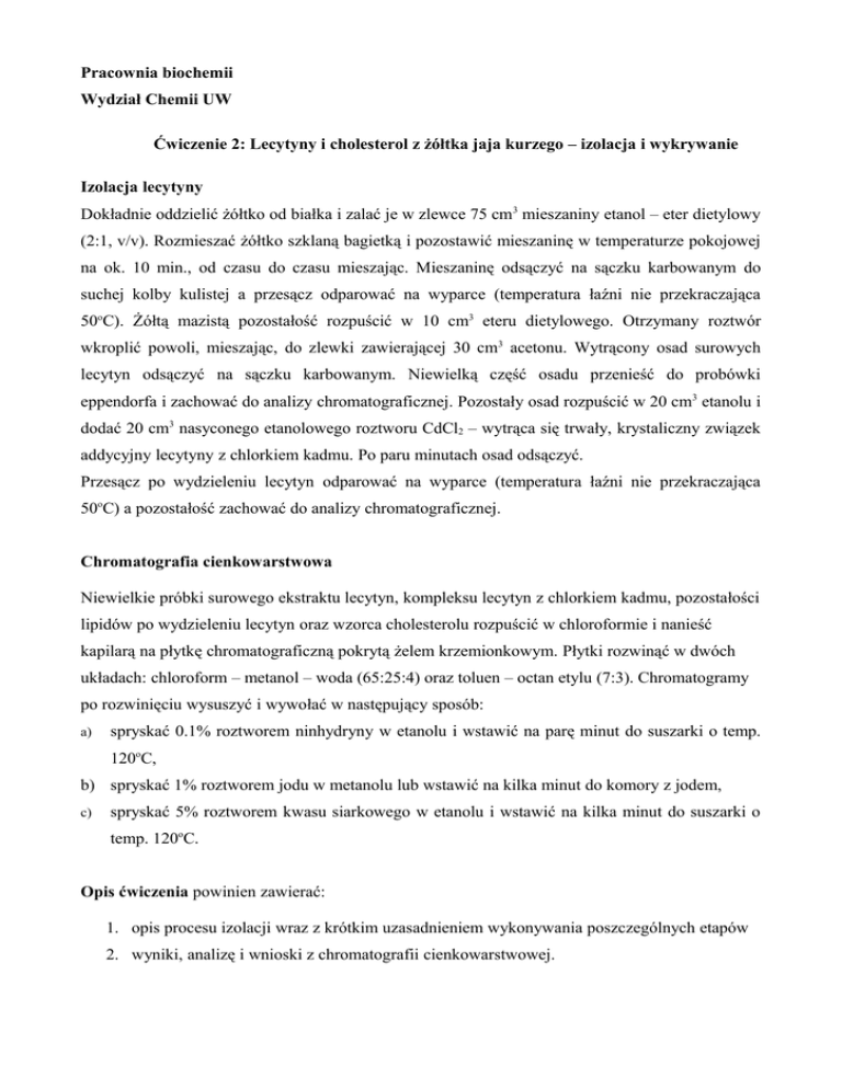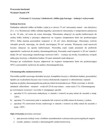 Pracownia biochemii Wydział Chemii UW Ćwiczenie 2: Lecytyny i cholesterol z żółtka jaja kurzego – izolacja i wykrywanie Izolacja lecytyny Dokładnie oddzielić żółtko od białka i zalać je w zlewce 75 cm 3 mieszaniny etanol – eter dietylowy (2:1, v/v). Rozmieszać żółtko szklaną bagietką i pozostawić mieszaninę w temperaturze pokojowej na ok. 10 min., od czasu do czasu mieszając. Mieszaninę odsączyć na sączku karbowanym do suchej kolby kulistej a przesącz odparować na wyparce (temperatura łaźni nie przekraczająca 50oC). Żółtą mazistą pozostałość rozpuścić w 10 cm3 eteru dietylowego. Otrzymany roztwór wkroplić powoli, mieszając, do zlewki zawierającej 30 cm3 acetonu. Wytrącony osad surowych lecytyn odsączyć na sączku karbowanym. Niewielką część osadu przenieść do probówki eppendorfa i zachować do analizy chromatograficznej. Pozostały osad rozpuścić w 20 cm3 etanolu i dodać 20 cm3 nasyconego etanolowego roztworu CdCl2 – wytrąca się trwały, krystaliczny związek addycyjny lecytyny z chlorkiem kadmu. Po paru minutach osad odsączyć. Przesącz po wydzieleniu lecytyn odparować na wyparce (temperatura łaźni nie przekraczająca 50oC) a pozostałość zachować do analizy chromatograficznej. Chromatografia cienkowarstwowa Niewielkie próbki surowego ekstraktu lecytyn, kompleksu lecytyn z chlorkiem kadmu, pozostałości lipidów po wydzieleniu lecytyn oraz wzorca cholesterolu rozpuścić w chloroformie i nanieść kapilarą na płytkę chromatograficzną pokrytą żelem krzemionkowym. Płytki rozwinąć w dwóch układach: chloroform – metanol – woda (65:25:4) oraz toluen – octan etylu (7:3). Chromatogramy po rozwinięciu wysuszyć i wywołać w następujący sposób: a) spryskać 0.1% roztworem ninhydryny w etanolu i wstawić na parę minut do suszarki o temp. 120oC, b) spryskać 1% roztworem jodu w metanolu lub wstawić na kilka minut do komory z jodem, c) spryskać 5% roztworem kwasu siarkowego w etanolu i wstawić na kilka minut do suszarki o temp. 120oC. Opis ćwiczenia powinien zawierać: 1. opis procesu izolacji wraz z krótkim uzasadnieniem wykonywania poszczególnych etapów 2. wyniki, analizę i wnioski z chromatografii cienkowarstwowej.