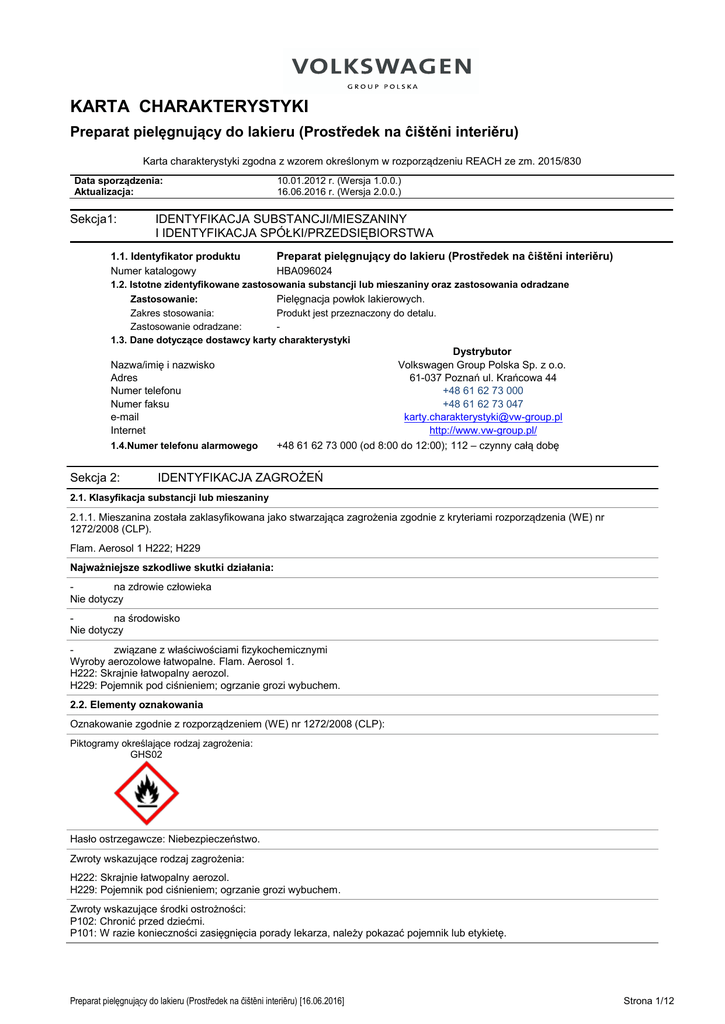 KARTA CHARAKTERYSTYKI Preparat pielęgnujący do lakieru (Prostředek na ĉištěni interiěru) Karta charakterystyki zgodna z wzorem określonym w rozporządzeniu REACH ze zm. 2015/830 Data sporządzenia: Aktualizacja: Sekcja1: 10.01.2012 r. (Wersja 1.0.0.) 16.06.2016 r. (Wersja 2.0.0.) IDENTYFIKACJA SUBSTANCJI/MIESZANINY I IDENTYFIKACJA SPÓŁKI/PRZEDSIĘBIORSTWA 1.1. Identyfikator produktu Numer katalogowy Preparat pielęgnujący do lakieru (Prostředek na ĉištěni interiěru) HBA096024 1.2. Istotne zidentyfikowane zastosowania substancji lub mieszaniny oraz zastosowania odradzane Zastosowanie: Pielęgnacja powłok lakierowych. Zakres stosowania: Produkt jest przeznaczony do detalu. Zastosowanie odradzane: 1.3. Dane dotyczące dostawcy karty charakterystyki Dystrybutor Volkswagen Group Polska Sp. z o.o. 61-037 Poznań ul. Krańcowa 44 +48 61 62 73 000 +48 61 62 73 047 [email protected] http://www.vw-group.pl/ Nazwa/imię i nazwisko Adres Numer telefonu Numer faksu e-mail Internet 1.4.Numer telefonu alarmowego Sekcja 2: +48 61 62 73 000 (od 8:00 do 12:00); 112 – czynny całą dobę IDENTYFIKACJA ZAGROŻEŃ 2.1. Klasyfikacja substancji lub mieszaniny 2.1.1. Mieszanina została zaklasyfikowana jako stwarzająca zagrożenia zgodnie z kryteriami rozporządzenia (WE) nr 1272/2008 (CLP). Flam. Aerosol 1 H222; H229 Najważniejsze szkodliwe skutki działania: na zdrowie człowieka Nie dotyczy na środowisko Nie dotyczy związane z właściwościami fizykochemicznymi Wyroby aerozolowe łatwopalne. Flam. Aerosol 1. H222: Skrajnie łatwopalny aerozol. H229: Pojemnik pod ciśnieniem; ogrzanie grozi wybuchem. 2.2. Elementy oznakowania Oznakowanie zgodnie z rozporządzeniem (WE) nr 1272/2008 (CLP): Piktogramy określające rodzaj zagrożenia: GHS02 Hasło ostrzegawcze: Niebezpieczeństwo. Zwroty wskazujące rodzaj zagrożenia: H222: Skrajnie łatwopalny aerozol. H229: Pojemnik pod ciśnieniem; ogrzanie grozi wybuchem. Zwroty wskazujące środki ostrożności: P102: Chronić przed dziećmi. P101: W razie konieczności zasięgnięcia porady lekarza, należy pokazać pojemnik lub etykietę. Preparat pielęgnujący do lakieru (Prostředek na ĉištěni interiěru) [16.06.2016] Strona 1/12 KARTA CHARAKTERYSTYKI Preparat pielęgnujący do lakieru (Prostředek na ĉištěni interiěru) Sekcja 2: IDENTYFIKACJA ZAGROŻEŃ P210: Przechowywać z dala od źródeł ciepła, gorących powierzchni, źródeł iskrzenia, otwartego ognia i innych źródeł zapłonu. Nie palić. P211: Nie rozpylać nad otwartym ogniem lub innym źródłem zapłonu. P251: Nie przekłuwać ani nie spalać, nawet po zużyciu. P261: Unikać wdychania rozpylonej cieczy. P271: Stosować wyłącznie na zewnątrz lub w dobrze wentylowanym pomieszczeniu. P410+P412: Chronić przed światłem słonecznym. Nie wystawiać na działanie temperatury przekraczającej 50°C/122°F. P501: Zawartość/pojemnik usuwać na składowiska odpadów niebezpiecznych. Informacje uzupełniające o zagrożeniach: Nie podano Etykieta powinna zawierać identyfikator produktu, o którym mowa w art. 18 rozp. CLP oraz nazwę, adres i telefon dostawcy danej mieszaniny. Anionowe środki powierzchniowo czynne < 5% Niejonowe środki powierzchniowo czynne < 5% 2.3. Inne zagrożenia 2.3.1 Ocena PBT lub vPvB zgodnie z zał. XIII REACH – substancje zawarte w mieszaninie nie zostały zakwalifikowane jako PBT lub vPvB. Kryteria PBT i vPvB zawarte są w Aneksie XIII REACH. 2.3.2. Informacje dotyczące innych zagrożeń, które nie powodują zaklasyfikowania, a które mogą przyczynić się do ogólnych zagrożeń powodowanych przez mieszaninę. Nie dotyczy Sekcja 3. SKŁAD/INFORMACJA O SKŁADNIKACH 3.1. Substancje 3.2. Mieszaniny Opis ogólny: Produkt jest alkoholowym wodnym roztworem zawierającym niejonowe środki powierzchniowo czynne i anionowe środki powierzchniowo czynne w stężeniu <5% oraz następujące konserwanty: 2-bromo-2-nitropane-1,3-diol, allil heptanoate, gamma-undecalactone. Spis substancji w mieszaninie: a) Substancje stanowiące zagrożenie dla zdrowia lub środowiska w rozumieniu rozporządzenia (WE) nr 1272/2008 Butan: Zawartość: Nr CAS: Nr WE: Nr indeksowy: Nr rejestracji: Klasyfikacja substancji zgodnie z rozporządzeniem (WE) nr 1272/2008 2,5 – 5,0% 106-97-8 203-448-7 601-004-00-0 01-2119474691-32-xxxx Flam. Gas 1 H220 Press. Gas H280 Zawartość: Nr CAS: Nr WE: Nr indeksowy: Nr rejestracji: Klasyfikacja substancji zgodnie z rozporządzeniem (WE) nr 1272/2008 N,N-bis(karboksylatometylo)-L-glutaminian tetrasodu: Zawartość: Nr CAS: Nr WE: Nr indeksowy: Nr rejestracji: Klasyfikacja substancji zgodnie z rozporządzeniem (WE) nr 1272/2008 2,5 – 5,0% 64-17-5 200-578-6 603-002-00-5 01-2119457610-43-xxxx Flam. Liq. 2 H225 Etanol: Preparat pielęgnujący do lakieru (Prostředek na ĉištěni interiěru) [16.06.2016] 1,0 – 2,5% 51981-21-6 257-573-7 01-2119493601-38-xxxx Skin Irrit. 2 H315 Eye Irrit. 2 H319 Strona 2/12 KARTA CHARAKTERYSTYKI Preparat pielęgnujący do lakieru (Prostředek na ĉištěni interiěru) Sekcja 3. SKŁAD/INFORMACJA O SKŁADNIKACH b) Substancje, dla których istnieją wspólnotowe najwyższe dopuszczalne stężenia w środowisku pracy, które nie zostały zawarte w lit. a): zostały zawarte w lit. a) c) substancje trwałe, wykazujące zdolność do bioakumulacji i toksyczne lub bardzo trwałe i wykazujące bardzo dużą zdolność do bioakumulacji zgodnie z kryteriami zawartymi w załączniku XIII lub substancje zawarte w wykazie sporządzonym zgodnie z art. 59 ust. 1 z powodów innych niż zagrożenia, o których mowa w lit. a): W mieszaninie nie występują ww. substancje. Objaśnienia stosowanych skrótów podano w sekcji 16. Sekcja 4. ŚRODKI PIERWSZEJ POMOCY 4.1. Opis środków pierwszej pomocy Narażenie przez drogi oddechowe Wyprowadzić lub wynieść poszkodowanego na świeże powietrze (ratownicy muszą być wyposażeni w odpowiednie środki ochrony indywidualnej – patrz sekcja 8). Przepłukać wodą jamę ustną 