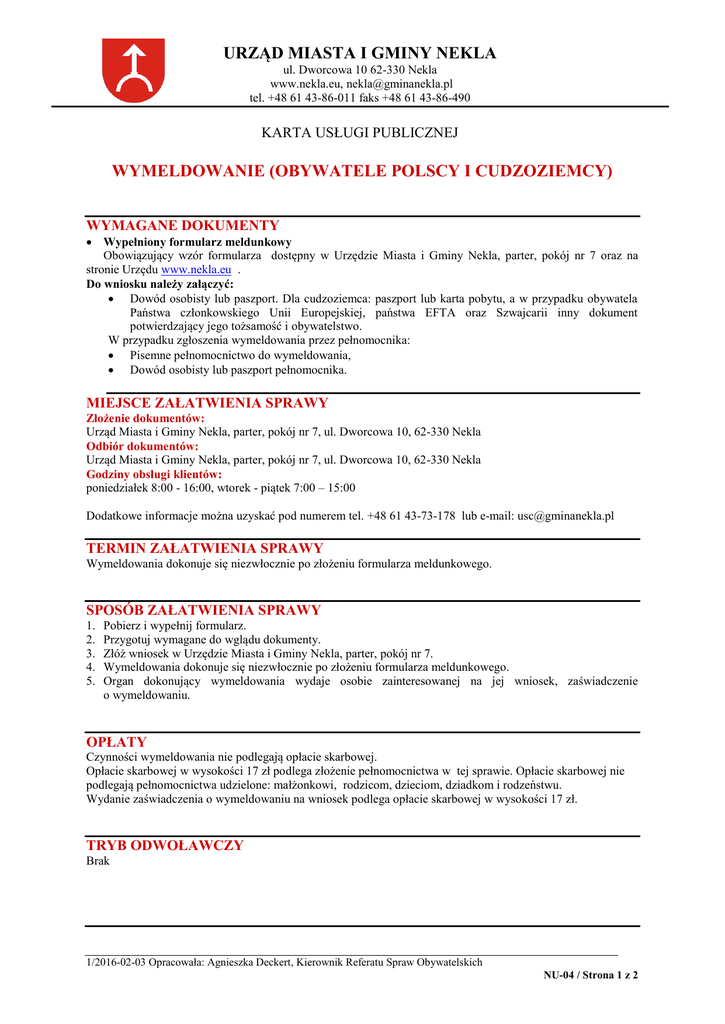 urząd miasta i gminy nekla wymeldowanie (obywatele polscy i