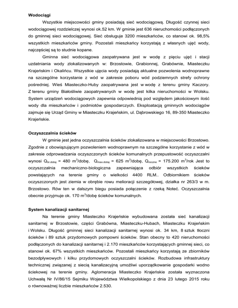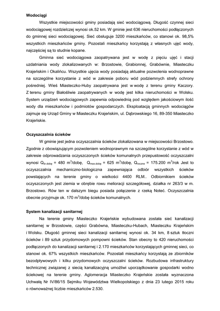 Wodociągi Wszystkie miejscowości gminy posiadają sieć wodociągową. Długość czynnej sieci wodociągowej rozdzielczej wynosi ok.52 km. W gminie jest 636 nieruchomości podłączonych do gminnej sieci wodociągowej. Sieć obsługuje 3200 mieszkańców, co stanowi ok. 98,5% wszystkich mieszkańców gminy. Pozostali mieszkańcy korzystają z własnych ujęć wody, najczęściej są to studnie kopane. Gminna sieć wodociągowa zaopatrywana jest w wodę z pięciu ujęć i stacji uzdatniania wody zlokalizowanych w: Brzostowie, Grabionnej, Grabównie, Miasteczku Krajeńskim i Okalińcu. Wszystkie ujęcia wody posiadają aktualne pozwolenia wodnoprawne na szczególne korzystanie z wód w zakresie poboru wód podziemnych strefy ochrony pośredniej. Wieś Miasteczko-Huby zaopatrywana jest w wodę z terenu gminy Kaczory. Z terenu gminy Białośliwie zaopatrywanych w wodę jest kilka nieruchomości w Wolsku. System urządzeń wodociągowych zapewnia odpowiednią pod względem jakościowym ilość wody dla mieszkańców i podmiotów gospodarczych. Eksploatacją gminnych wodociągów zajmuje się Urząd Gminy w Miasteczku Krajeńskim, ul. Dąbrowskiego 16, 89-350 Miasteczko Krajeńskie. Oczyszczalnia ścieków W gminie jest jedna oczyszczalnia ścieków zlokalizowana w miejscowości Brzostowo. Zgodnie z obowiązującym pozwoleniem wodnoprawnym na szczególne korzystanie z wód w zakresie odprowadzania oczyszczonych ścieków komunalnych przepustowość oczyszczalni wynosi Qśr.dobę = 480 m3/dobę, Qmax.dobę = 625 m3/dobę, Qroczne = 175.200 m3/rok Jest to oczyszczalnia powstających mechaniczno-biologiczna na terenie gminy o zapewniająca wielkości 4400 odbiór RLM.. wszystkich ścieków Odbiornikiem ścieków oczyszczonych jest ziemia w obrębie rowu melioracji szczegółowej, działka nr 263/3 w m. Brzostowo. Rów ten w dalszym biegu posiada połączenie z rzeką Noteć. Oczyszczalnia obecnie przyjmuje ok. 170 m3/dobę ścieków komunalnych. System kanalizacji sanitarnej Na terenie gminy Miasteczko Krajeńskie wybudowana została sieć kanalizacji sanitarnej w Brzostowie, części Grabówna, Miasteczku-Hubach, Miasteczku Krajeńskim i Wolsku. Długość gminnej sieci kanalizacji sanitarnej wynosi ok. 34 km, 8 sztuk tłoczni ścieków i 89 sztuk przydomowych pompowni ścieków. Stan obecny to 420 nieruchomości podłączonych do kanalizacji sanitarnej i 2.170 mieszkańców korzystających gminnej sieci, co stanowi ok. 67% wszystkich mieszkańców. Pozostali mieszkańcy korzystają ze zbiorników bezodpływowych i kilku przydomowych oczyszczalni ścieków. Rozbudowa infrastruktury technicznej związanej z siecią kanalizacyjną umożliwi uporządkowanie gospodarki wodno ściekowej na terenie gminy. Aglomeracja Miasteczko Krajeńskie została wyznaczona Uchwałą Nr IV/86/15 Sejmiku Województwa Wielkopolskiego z dnia 23 lutego 2015 roku o równoważnej liczbie mieszkańców 2.530.