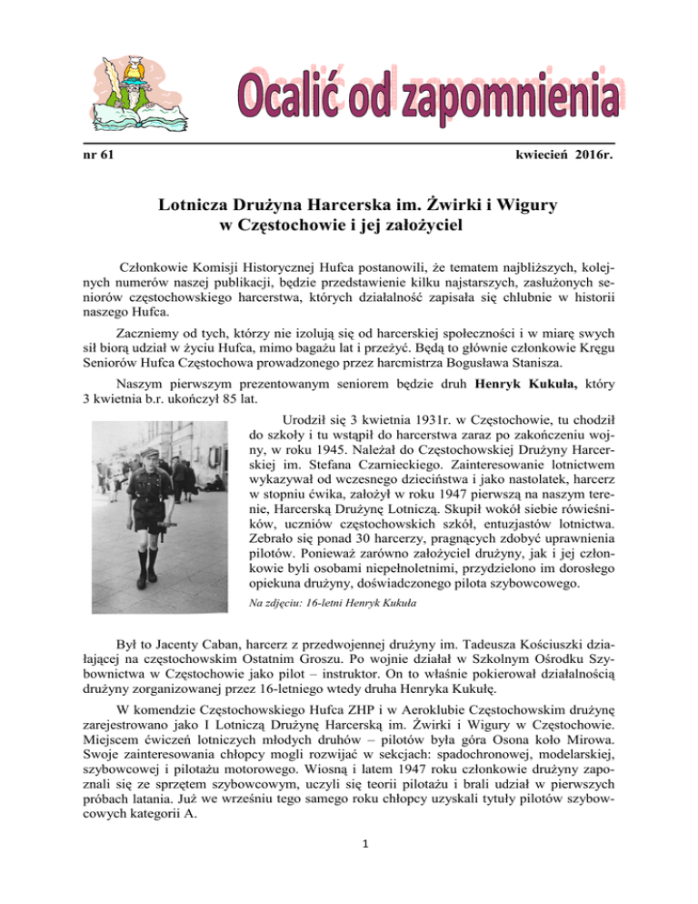 nr 61 kwiecień 2016r. Lotnicza DruŜyna Harcerska im. świrki i Wigury w Częstochowie i jej załoŜyciel Członkowie Komisji Historycznej Hufca postanowili, Ŝe tematem najbliŜszych, kolejnych numerów naszej publikacji, będzie przedstawienie kilku najstarszych, zasłuŜonych seniorów częstochowskiego harcerstwa, których działalność zapisała się chlubnie w historii naszego Hufca. Zaczniemy od tych, którzy nie izolują się od harcerskiej społeczności i w miarę swych sił biorą udział w Ŝyciu Hufca, mimo bagaŜu lat i przeŜyć. Będą to głównie członkowie Kręgu Seniorów Hufca Częstochowa prowadzonego przez harcmistrza Bogusława Stanisza. Naszym pierwszym prezentowanym seniorem będzie druh Henryk Kukuła, który 3 kwietnia b.r. ukończył 85 lat. Urodził się 3 kwietnia 1931r. w Częstochowie, tu chodził do szkoły i tu wstąpił do harcerstwa zaraz po zakończeniu wojny, w roku 1945. NaleŜał do Częstochowskiej DruŜyny Harcerskiej im. Stefana Czarnieckiego. Zainteresowanie lotnictwem wykazywał od wczesnego dzieciństwa i jako nastolatek, harcerz w stopniu ćwika, załoŜył w roku 1947 pierwszą na naszym terenie, Harcerską DruŜynę Lotniczą. Skupił wokół siebie rówieśników, uczniów częstochowskich szkół, entuzjastów lotnictwa. Zebrało się ponad 30 harcerzy, pragnących zdobyć uprawnienia pilotów. PoniewaŜ zarówno załoŜyciel druŜyny, jak i jej członkowie byli osobami niepełnoletnimi, przydzielono im dorosłego opiekuna druŜyny, doświadczonego pilota szybowcowego. Na zdjęciu: 16-letni Henryk Kukuła Był to Jacenty Caban, harcerz z przedwojennej druŜyny im. Tadeusza Kościuszki działającej na częstochowskim Ostatnim Groszu. Po wojnie działał w Szkolnym Ośrodku Szybownictwa w Częstochowie jako pilot – instruktor. On to właśnie pokierował działalnością druŜyny zorganizowanej przez 16-letniego wtedy druha Henryka Kukułę. W komendzie Częstochowskiego Hufca ZHP i w Aeroklubie Częstochowskim druŜynę zarejestrowano jako I Lotniczą DruŜynę Harcerską im. świrki i Wigury w Częstochowie. Miejscem ćwiczeń lotniczych młodych druhów – pilotów była góra Osona koło Mirowa. Swoje zainteresowania chłopcy mogli rozwijać w sekcjach: spadochronowej, modelarskiej, szybowcowej i pilotaŜu motorowego. Wiosną i latem 1947 roku członkowie druŜyny zapoznali się ze sprzętem szybowcowym, uczyli się teorii pilotaŜu i brali udział w pierwszych próbach latania. JuŜ we wrześniu tego samego roku chłopcy uzyskali tytuły pilotów szybowcowych kategorii A. 1 Szybowisko i (po latach) tablica pamiątkowa na górze Osona Latem następnego 1948 roku, młodzi piloci wzięli udział w obozie lotniczym w Osieczowie na Opolszczyźnie, gdzie mogli rozwijać i udoskonalać swoje umiejętności i zainteresowania. W czasie pobytu na obozie chłopcy nie tylko brali udział w zajęciach specjalnościowych i zdobywaniu sprawności harcerskich, ale równieŜ uczestniczyli w Ŝyciu miejscowej ludności pomagając okolicznym mieszkańcom w Ŝniwach i zajęciach gospodarskich oraz zapraszając ich do udziału w wieczornych ogniskach harcerskich. Dla zdobycia funduszy na sprzęt i dalszą działalność druŜyny, harcerze zorganizowali zabawę lotniczą, na którą wstęp był płatny, z zaproszeniami, w lokalu Klubu Oficerskiego przy al. Wolności w Częstochowie. Impreza cieszyła się ogromnym powodzeniem wśród zaproszonych gości, czego dowodem był liczny w niej udział i spora kwota uzyskana przez organizatorów. Jesienią 1948 roku członkowie druŜyny im. świrki i Wigury brali udział w ćwiczeniach lotniczych na terenie lotniska Aeroklubu Częstochowskiego. Pod opieką i kierunkiem pilotów – profesjonalistów odbywały się loty samolotowe i skoki na spadochronach oraz inne, niełatwe ćwiczenia, jakich dotąd harcerze nie praktykowali na lądowisku góry Osona. Henryk Kukuła odpowiedzialnie kierował swoimi harcerzami jako ich druŜynowy, co nie przeszkadzało mu kontynuować naukę w wieczorowej szkole średniej prowadzonej przez profesora Józefa Steczko, nauczyciela matematyki pracującego przed wojną w Gimnazjum im. Henryka Sienkiewicza. Nic dziwnego, Ŝe działalność I DruŜyny im. świrki i Wigury stawała się popularna i zyskiwała sympatyków w Częstochowie i powiecie. Wśród jej członków byli tacy, którzy swoje lotnicze zainteresowania kontynuowali w późniejszym, dorosłym Ŝyciu. Na przykład: druh Robert Grajnert został powołany do słuŜby wojskowej w Batalionach Budowy Lotnisk, gdzie mógł kontynuować swoje młodzieńcze pasje zapoczątkowane w lotniczej druŜynie harcerskiej; druh Lucjan Maciukiewicz został z wojska skierowany do Szkoły Orląt w Dęblinie, gdzie doceniono jego umiejętności i po ukończeniu tej szkoły został pilotem – nawigatorem w Polskiej Marynarce Wojennej. Wielu spośród byłych członków I Lotniczej DruŜyny Harcerskiej w Częstochowie zajęło w późniejszych latach odpowiedzialne stanowiska w róŜnych placówkach przemysłu i gospodarki oraz administracji państwowej. Ale to juŜ inna historia. WaŜny jest fakt, Ŝe podstawy wychowania zdobyte we wczesnej młodości zaowocowały pozytywnie w późniejszym Ŝyciu harcerzy z druŜyny Henryka Kukuły. W tym miejscu naleŜy z przykrością poinformować, Ŝe działalność tej druŜyny nie trwała długo. W czasie zmian politycznych i społecznych, jakie zaczęły się w roku 1949, gdy zmianom uległa takŜe struktura organizacyjna ZHP, I Lotnicza DruŜyna Harcerska w Często2 chowie została rozwiązana. Stało się to w połowie roku1949. Członkowie druŜyny i ich opiekunowie nie akceptowali zmian i wymagań ówczesnych władz, dotyczących ZHP. DruŜynowy Henryk Kukuła, który posiadał juŜ wtedy uprawnienia pilota szybowcowego klasy B, złoŜył rezygnację z pełnienia funkcji, gdyŜ nie widział dalszych szans funkcjonowania w tej dziedzinie. Nie zmieniło to jego lotniczych pasji. W roku 1951 uz