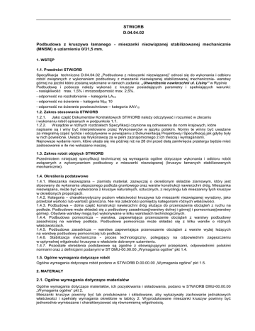 STWiORB D.04.04.02 Podbudowa z kruszywa łamanego - mieszanki niezwiązanej stabilizowanej mechanicznie (MNSM) o uziarnieniu 0/31,5 mm. 1. WSTĘP 1.1. Przedmiot STWiORB Specyfikacja techniczna D.04.04.02 „Podbudowa z mieszanki niezwiązanej” odnosi się do wykonania i odbioru robót związanych z wykonaniem podbudowy z mieszanki niezwiązanej stabilizowanej mechanicznie- warstwy górnej na jezdni które zostaną wykonane w ramach zadania: „Utwardzenie nawierzchni ul. Lisiny” w Rypinie Podbudowę i pobocza należy wykonać z kruszyw posiadających parametry i spełniających warunki: - nasiąkliwość max. 1,5% i mrozoodporność max. 2,5%. - odporność na rozdrabnianie – kategoria LA15 - odporność na ścieranie – kategoria MDE 10 - odporność na ścieranie powierzchniowe – kategoria AAV10 1.2. Zakres stosowania STWiORB 1.2.1. Jako część Dokumentów Kontraktowych STWiORB należy odczytywać i rozumieć w zlecaniu i wykonaniu robót opisanych w podpunkcie 1.1. 1.2.2. Wszędzie w różnych rozdziałach Specyfikacji czynione są odniesienia do norm krajowych, które napisane są i winy być interpretowane przez Wykonawców w języku polskim. Normy te winny być uważane za integralną część tychże i odczytywane w powiązaniu z Dokumentacją Projektową i Specyfikacją jak gdyby były w nich powielone. Uważa się Wykonawcę za w pełni zaznajomionego z ich treścią i wymaganiami. Najnowsze wydanie norm, które ukaże się nie później niż na 28 dni przed datą zamknięcia przetargu będzie mieć zastosowanie o ile nie wskazano inaczej. 1.3. Zakres robót objętych STWiORB Przedmiotem niniejszej specyfikacji technicznej są wymagania ogólne dotyczące wykonania i odbioru robót związanych z wykonywaniem podbudowy z mieszanki niezwiązanej (kruszyw łamanych stabilizowanych mechanicznie). 1.4. Określenia podstawowe 1.4.1. Mieszanka niezwiązana – ziarnisty materiał, zazwyczaj o określonym składzie ziarnowym, który jest stosowany do wykonania ulepszonego podłoża gruntowego oraz warstw konstrukcji nawierzchni dróg. Mieszanka niezwiązana, może być wytworzona z kruszyw naturalnych, sztucznych, z recyclingu lub mieszaniny tych kruszyw w określonych proporcjach. 1.4.2. Kategoria – charakterystyczny poziom właściwości kruszywa lub mieszanki niezwiązanej wyrażony, jako przedział wartości lub wartość graniczna. Nie ma zależności pomiędzy kategoriami różnych właściwości. 1.4.3. Podbudowa – dolna część konstrukcji nawierzchni dróg służąca do przenoszenia obciążeń z ruchu na podłoże. Podbudowa może składać się z podbudowy zasadniczej(warstwy dolnej i górnej) i pomocniczej(warstwy górnej). Obydwie warstwy mogą być wykonywane w kilku warstwach technologicznych. 1.4.4. Podbudowa pomocnicza – warstwa, zapewniająca przenoszenie obciążeń z warstwy podbudowy zasadniczej na warstwę podłoża. Podbudowa pomocnicza może składać się z kilku warstw o różnych właściwościach. 1.4.5. Podbudowa zasadnicza – warstwa zapewniająca przenoszenie obciążeń z warstw wyżej leżących na warstwę podbudowy pomocniczej lub podłoże. 1.4.6. Stabilizacja mechaniczna - proces technologiczny, polegający na odpowiednim zagęszczeniu w optymalnej wilgotności kruszywa o właściwie dobranym uziarnieniu. 1.4.7. Pozostałe określenia podstawowe są zgodne z obowiązującymi przepisami, odpowiednimi polskimi normami oraz z definicjami podanymi w ST DMU-00.00.00 „Wymagania ogólne” pkt 1.4. 1.5. Ogólne wymagania dotyczące robót Ogólne wymagania dotyczące robót podano w STWiORB D.00.00.00 „Wymagania ogólne” pkt 1.5. 2. MATERIAŁY 2.1. Ogólne wymagania dotyczące materiałów Ogólne wymagania dotyczące materiałów, ich pozyskiwania i składowania, podano w STWiORB DMU-00.00.00 „Wymagania ogólne” pkt 2. Mieszanki kruszyw powinny być tak produkowane i składowane, aby wykazywały zachowanie jednakowych właściwości i spełniały wymagania określone w tablicy 2. Wyprodukowane mieszanki kruszyw powinny być jednorodnie wymieszane i charakteryzować się równomierną wilgotnością. W mieszankach, które są wyprodukowane z różnych kruszyw, gotowa mieszanka kruszyw musi spełniać wymagania tablicy 5. Dla mieszanek nie określa się wymagania wobec minimalnej zawartości pyłów <0,063 mm. W przypadku stosowania kruszyw z recyclingu i kruszyw z odpadów przemysłowych, należy uzyskać ocenę ekologiczną takiej mieszanki przez właściwe jednostki. Dodatkowo wymaga się, aby 90% wyników w zapisach Zakładowej Kontroli Produkcji (ZKP) prowadzonych w ciągu 6 miesięcy powinno potwierdzać wymaganą jednorodność na poszczególnych sitach zgodnie z tablicą 3. Przy akceptacji Inżyniera powyższe wymaganie nie jest konieczne. Dodatkowo wymaga się, aby 90% wyników w zapisach ZKP prowadzonych w ciągu 6 miesięcy powinno potwierdzać wymaganą ciągłość na poszczególnych sitach zgodnie z tablicą 4. Przy akceptacji Inżyniera powyższe wymaganie nie jest konieczne. 2.2. Rodzaje materiałów Materiałem do wykonania podbudowy i ulepszonego podłoża powinno być kruszywo łamane, uzyskane w wyniku przekruszenia surowca skalnego lub kamieni narzutowych i otoczaków albo ziaren żwiru większych od 8 mm. Kruszywo łamane niezwiązane do mieszanki powinno posiadać deklarację zgodności z normą PN-EN 13242 oraz być oznakowane znakiem CE lub B. Kruszywo powinno być jednorodne bez zanieczyszczeń obcych i bez domieszek gliny. 2.3. Wymagania dla materiałów 2.3.1. Uziarnienie mieszanki Krzywa uziarnienia mieszanki niezwiązanej z kruszywa powinna leżeć między krzywymi granicznymi pól dobrego uziarnienia podanymi w tablicy 1. Tablica 1. Zalecane graniczne uziarnienie mieszanki kruszywa łamanego 0/31,5 do podbudowy Rzędne krzywych Rzędne krzywych granicznych Sito o boku oczka granicznych dla mieszanki kwadratowego, deklarowanych przez niezwiązanej mm producenta SDV Przechodzi przez 31,5 16,0 8,0 4,0 