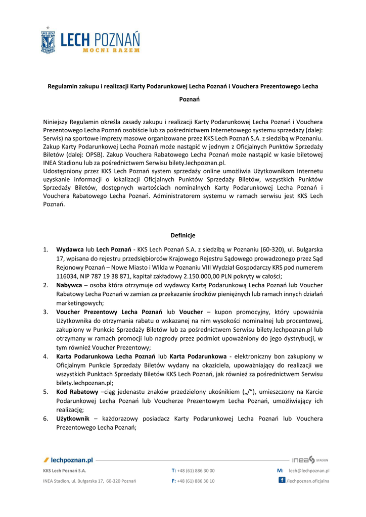 Regulamin zakupu i realizacji Karty Podarunkowej Lecha Poznań i Vouchera Prezentowego Lecha Poznań Niniejszy Regulamin określa zasady zakupu i realizacji Karty Podarunkowej Lecha Poznań i Vouchera Prezentowego Lecha Poznań osobiście lub za pośrednictwem Internetowego systemu sprzedaży (dalej: Serwis) na sportowe imprezy masowe organizowane przez KKS Lech Poznań S.A. z siedzibą w Poznaniu. Zakup Karty Podarunkowej Lecha Poznań może nastąpić w jednym z Oficjalnych Punktów Sprzedaży Biletów (dalej: OPSB). Zakup Vouchera Rabatowego Lecha Poznań może nastąpić w kasie biletowej INEA Stadionu lub za pośrednictwem Serwisu bilety.lechpoznan.pl. Udostępniony przez KKS Lech Poznań system sprzedaży online umożliwia Użytkownikom Internetu uzyskanie informacji o lokalizacji Oficjalnych Punktów Sprzedaży Biletów, wszystkich Punktów Sprzedaży Biletów, dostępnych wartościach nominalnych Karty Podarunkowej Lecha Poznań i Vouchera Rabatowego Lecha Poznań. Administratorem systemu w ramach serwisu jest KKS Lech Poznań. Definicje 1. 2. 3. 4. 5. 6. Wydawca lub Lech Poznań - KKS Lech Poznań S.A. z siedzibą w Poznaniu (60-320), ul. Bułgarska 17, wpisana do rejestru przedsiębiorców Krajowego Rejestru Sądowego prowadzonego przez Sąd Rejonowy Poznań – Nowe Miasto i Wilda w Poznaniu VIII Wydział Gospodarczy KRS pod numerem 116034, NIP 787 19 38 871, kapitał zakładowy 2.150.000,00 PLN pokryty w całości; Nabywca – osoba która otrzymuje od wydawcy Kartę Podarunkową Lecha Poznań lub Voucher Rabatowy Lecha Poznań w zamian za przekazanie środków pieniężnych lub ramach innych działań marketingowych; Voucher Prezentowy Lecha Poznań lub Voucher – kupon promocyjny, który upoważnia Użytkownika do otrzymania rabatu o wskazanej na nim wysokości nominalnej lub procentowej, zakupiony w Punkcie Sprzedaży Biletów lub za pośrednictwem Serwisu bilety.lechpoznan.pl lub otrzymany w ramach promocji lub nagrody przez podmiot upoważniony do jego dystrybucji, w tym również Voucher Prezentowy; Karta Podarunkowa Lecha Poznań lub Karta Podarunkowa - elektroniczny bon zakupiony w Oficjalnym Punkcie Sprzedaży Biletów wydany na okaziciela, upoważniający do realizacji we wszystkich Punktach Sprzedaży Biletów KKS Lech Poznań, jak również za pośrednictwem Serwisu bilety.lechpoznan.pl; Kod Rabatowy –ciąg jedenastu znaków przedzielony ukośnikiem („/”), umieszczony na Karcie Podarunkowej Lecha Poznań lub Voucherze Prezentowym Lecha Poznań, umożliwiający ich realizację; Użytkownik – każdorazowy posiadacz Karty Podarunkowej Lecha Poznań lub Vouchera Prezentowego Lecha Poznań; KKS Lech Poznań S.A. T: +48 (61) 886 30 00 INEA Stadion, ul. Bułgarska 17, 60-320 Poznań F: +48 (61) 886 30 10 M: [email protected] /lechpoznan.oficjalna 7. 8. 9. 10. 11. 12. 13. 14. Bilet - oznacza bilet wstępu na pojedynczy Mecz Lecha Poznań rozgrywany na INEA Stadionie w Poznaniu, z wyłączeniem Strefy Premium; Karnet - oznacza sezonowy pakiet biletów wstępu ważny na Mecze Lecha Poznań rozgrywane na Stadionie; Stadion - oznacza stadion piłkarski znajdujący się w Poznaniu przy ul. Bułgarskiej 17, na którym rozgrywane są Mecze Lecha Poznań; Mecz - oznacza spotkanie piłki nożnej rozgrywane na Stadionie z udziałem Lecha Poznań; Serwis - Elektroniczny System sprzedaży Biletów i Karnetów KKS Lech Poznań, służący także do zamawiania Karty Identyfikacyjnej dostępny pod adresem internetowym bilety.lechpoznan.pl; Regulamin - oznacza niniejszy Regulamin zakupu i realizacji Karty Podarunkowej Lech Poznań i Vouchera Prezentowego Lecha Poznań; OPSB – Oficjalne Punkty Sprzedaży Biletów, których wykaz znajduje się na oficjalnej stronie internetowej Wydawcy; PSB – Punkty Sprzedaży Biletów, których wykaz znajduje się na oficjalnej stronie internetowej Wydawcy. Postanowienia ogólne 1. a) b) c) 2. 3. 4. 5. Poprzez dokonanie zakupu Karty Podarunkowej Lecha Poznań lub Vouchera Prezentowego Lecha Poznań, Nabywca akceptuje treść niniejszego Regulaminu oraz następujących regulaminów: Regulamin Sprzedaży Biletów i Karnetów KKS Lech Poznań na mecze rozgrywane na INEA Stadionie Regulamin INEA Stadionu w Poznaniu Regulamin imprezy masowej – meczu piłki nożnej które dostępne są na oficjalnej stronie Wydawcy; Lista OPSB i PSB współpracujących z Wydawcą wraz z godzinami ich otwarcia dostępna jest na stronie internetowej Wydawcy; Karta Podarunkowa i Voucher są wydawane na okaziciela; Karta Podarunkowa i Voucher może służyć jako forma płatności za Bilety i Karnety we wszystkich PSB; Kod Rabatowy jest informacją poufną, służącą do uwierzytelnienia zakupu biletów lub karnetów, należy chronić go przed osobami nieupoważnionymi. Cena i płatność 1. 2. Rodzaje i wartości Kart Podarunkowych i Voucherów ustala Wydawca i podaje do informacji za pośrednictwem oficjalnej strony internetowej; Wszystkie ceny określone są w złotych polskich i zawierają podatek VAT; KKS Lech Poznań S.A. T: +48 (61) 886 30 00 INEA Stadion, ul. Bułgarska 17, 60-320 Poznań F: +48 (61) 886 30 10 M: [email protected] /lechpoznan.oficjalna 3. 4. 5. a) b) 6. Płatność za Kartę Podarunkową lub Voucher wynikająca z wartości nominalnej danego zamówienia powinna zostać zrealizowana niezwłocznie po jego dokonaniu; Wydawca zobowiązuje się do przekazania Nabywcy Karty Podarunkowej lub Vouchera niezwłocznie po dokonaniu przez niego płatności; Przekazanie Nabywcy Karty Podarunkowej lub Vouchera odbywa się tym samym kanałem sprzedaży, przez który dokonano zakupu, tj.: osobiście w przypadku zakupu w kasach biletowych INEA Stadionu lub w OPSB lub PSB drogą elektroniczną za pośrednictwem Serwisu; Karta Podarunkowa ani Voucher nie podlegają wymianie na środki pieniężne w całości ani w części oraz nie mogą zostać zwrócone. Zasady korzystania z Karty Podarunkowej Lecha Poznań i Vouchera Rabatowego Lecha Poznań 1. 2. Lech Pozna