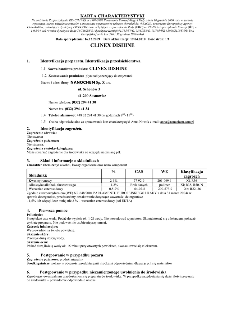 KARTA CHARAKTERYSTYKI Na podstawie Rozporządzenia REACH (WE) nr 1907/2006 Parlamentu Europejskiego i Rady z dnia 18 grudnia 2006 roku w sprawie rejestracji, oceny, udzielania zezwoleń i stosowania ograniczeń w zakresie chemikaliów (REACH), utworzenia Europejskiej Agencji Chemikaliów, zmieniające dyrektywę 1999/45/WE oraz uchylające rozporządzenie Rady (EWG) nr 793/93 i rozporządzenie Komisji (WE) nr 1488/94, jak równieŜ dyrektywę Rady 76/769/EWG i dyrektywę Komisji 91/155/EWG, 93/67/EWG, 93/105/WE i 2000/21/WE(DU Unii Europejskiej seria Lnr 396 z 30 grudnia 2006 roku) Data sporządzenia: 16.12.2009 Data aktualizacji: 19.04.2010 Ilość stron: 1/3 CLINEX DISHINE 1. Identyfikacja preparatu. Identyfikacja przedsiębiorstwa. 1.1 Nazwa handlowa produktu: CLINEX DISHINE 1.2 Zastosowanie produktu: płyn nabłyszczający do zmywarek Nazwa i adres firmy: NANOCHEM Sp. Z o.o. ul. Schonów 3 41-200 Sosnowiec Numer telefonu: (032) 294 41 30 Numer fax. (032) 294 41 34 1.4 Telefon alarmowy: +48 32 294 41 30 (w godzinach 800- 1500) 1.5 Osoba odpowiedzialna za opracowanie kart charakterystyki Anna Nowak e-mail: [email protected] 2. Identyfikacja zagroŜeń. ZagroŜenie zdrowia: Nie stwarza ZagroŜenie poŜarowe: Nie stwarza. ZagroŜenia ekotoksykologiczne: MoŜe stwarzać zagroŜenie dla środowiska ze względu na zmianę pH. 3. Skład i informacje o składnikach Charakter chemiczny: alkohol, kwasy organiczne oraz nano komponent % CAS WE Składniki: Klasyfikacja zagroŜeń Kwas cytrynowy 2-5% 77-92-9 201-069-1 Xi, R36 Alkoksylat alkoholu tłuszczowego 1-2% Brak danych polimer Xi; R38, R50, N Wersenian czterosodowy 0,5-2% 64-02-8 200-573-9 Xn; R22, 36 Zgodnie z rozporządzeniem (WE) NR 648/2004 PARLAMENTU EUROPEJSKIEGO I RADY z dnia 31 marca 2004r w sprawie detergentów, przedstawimy oznakowanie dotyczące zawartości detergentów: - 1,5% lub więcej, lecz mniej niŜ 2 % - wersenian czterosodowy (sól EDTA) 4. Pierwsza pomoc Połknięcie: Przepłukać usta wodą. Podać do wypicia ok. 1-2l wody. Nie powodować wymiotów. Skontaktować się z lekarzem, pokazać etykietę preparatu. Nie podawać nic osobie nieprzytomnej. Zatrucie inhalacyjne: Wyprowadzić na świeŜe powietrze. SkaŜenie skóry: Przemyć duŜą ilością wody. SkaŜenie oczu: Płukać duŜą ilością wody ok. 15 minut przy otwartych powiekach, skonsultować się z lekarzem. 5. Postępowanie w przypadku poŜaru ZagroŜenie poŜarowe: produkt niepalny Środki gaśnicze: poŜary w obecności produktu gasić środkami odpowiednimi dla palących się materiałów 6. Postępowanie w przypadku niezamierzonego uwolnienia do środowiska Zapobiegać ewentualnym przedostaniem się preparatu do środowiska. W przypadku przedostania się duŜej ilości preparatu do środowiska – powiadomić odpowiednie władze. KARTA CHARAKTERYSTYKI Na podstawie Rozporządzenia REACH (WE) nr 1907/2006 Parlamentu Europejskiego i Rady z dnia 18 grudnia 2006 roku w sprawie rejestracji, oceny, udzielania zezwoleń i stosowania ograniczeń w zakresie chemikaliów (REACH), utworzenia Europejskiej Agencji Chemikaliów, zmieniające dyrektywę 1999/45/WE oraz uchylające rozporządzenie Rady (EWG) nr 793/93 i rozporządzenie Komisji (WE) nr 1488/94, jak równieŜ dyrektywę Rady 76/769/EWG i dyrektywę Komisji 91/155/EWG, 93/67/EWG, 93/105/WE i 2000/21/WE(DU Unii Europejskiej seria Lnr 396 z 30 grudnia 2006 roku) Data sporządzenia: 16.12.2009 Data aktualizacji: 19.04.2010 Ilość stron: 2/3 CLINEX DISHINE 7. Postępowanie z preparatem i jego magazynowanie Postępowanie z preparatem: postępować zgodnie z ogólnie przyjętymi zasadami bezpieczeństwa Magazynowanie: przechowywać w zamkniętych zbiornikach odpornych na korozję. Przechowywać w temperaturze poniŜej 35 st. 8. Kontrola naraŜenia i środki ochrony indywidualnej Stosowane środki ochrony osobistej powinny spełniać wymogi Rozporządzenia Ministra Gospodarki, Pracy i Polityki Społecznej z dnia 21 grudnia 2005r. w sprawie zasadniczych wymagań dla środków ochrony indywidualnej ( Dz.U. nr.259, poz. 2173 ) Wymagania dotyczące wentylacji: wentylacja ogólna pomieszczenia NajwyŜsze dopuszczalne stęŜenie: (wg Rozporządzenia MPiPS z dn. 29 listopada 2002r (Dz.U. nr 217, poz 1833) Ochrona dróg oddechowych: wentylacja Ochrona oczu/ twarzy: rękawice ochronne gumowe Ochrona skóry: niekonieczne 9. Właściwości fizyczne i chemiczne Stan skupienia w temp. 20˚C Ciecz Temp. wrzenia [˚C] Brak danych Kolor Bezbarwny Temp. topnienia [˚C] Brak danych Temp. zapłonu [˚C] nie dotyczy Zapach charakterystyczny Temp. samozapłonu [˚C] nie dotyczy Górna granica wybuchowości [% V/V] nie dotyczy Dolna granica wybuchowości [% V/V] nie dotyczy PręŜność par [hPa] w 180˚C brak danych Gęstość [g/cm3] w temp. 20˚C 1,024 g/cm3 pH 3,7 (+/- 0,5 pH) Lepkość [mPa s] w temp. 20˚C nie dotyczy Współczynnik załamania światła brak danych Rozpuszczalność w wodzie Bardzo dobra Rozpuszczalność w rozp. Organicznych alkohole Palność nie palny Właściwości utleniające nie dotyczy Właściwości wybuchowe nie dotyczy Współczynnik podziału noktanol/woda brak danych Inne właściwości 10. Stabilność i reaktywność Warunki niebezpieczne - stabilny w normalnych warunkach Materiały niebezpieczne - brak Niebezpieczne produkty rozkładu – brak danych 11. Informacje toksykologiczne W przypadku spoŜycia moŜe wystąpić podraŜnienie błony śluzowej jamy ustnej, gardła przełyku i układu pokarmowego. 12. Informacje ekologiczne Dopuszczalne zanieczyszczenie śródlądowych wód powierzchniowych: Brak danych StęŜenia toksyczne dla wodnych organizmów zwierzęcych i roślinnych: Brak danych Rozpuszcza się w wodzie. Podlega procesowi parowania z powierzchni wody. Ciecz szkodliwa dla organizmów wodnych, ulega w znacznym stopniu procesowi biodegradacji. Utlenia się szybko w powietrzu i wodzie w skutek reakcji fotochemicznych. 13. Postępowanie z odpadami Przestrzegać przepisów ustawy z dnia 27 